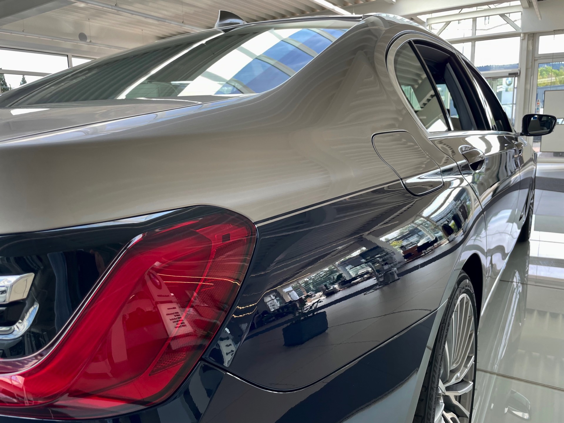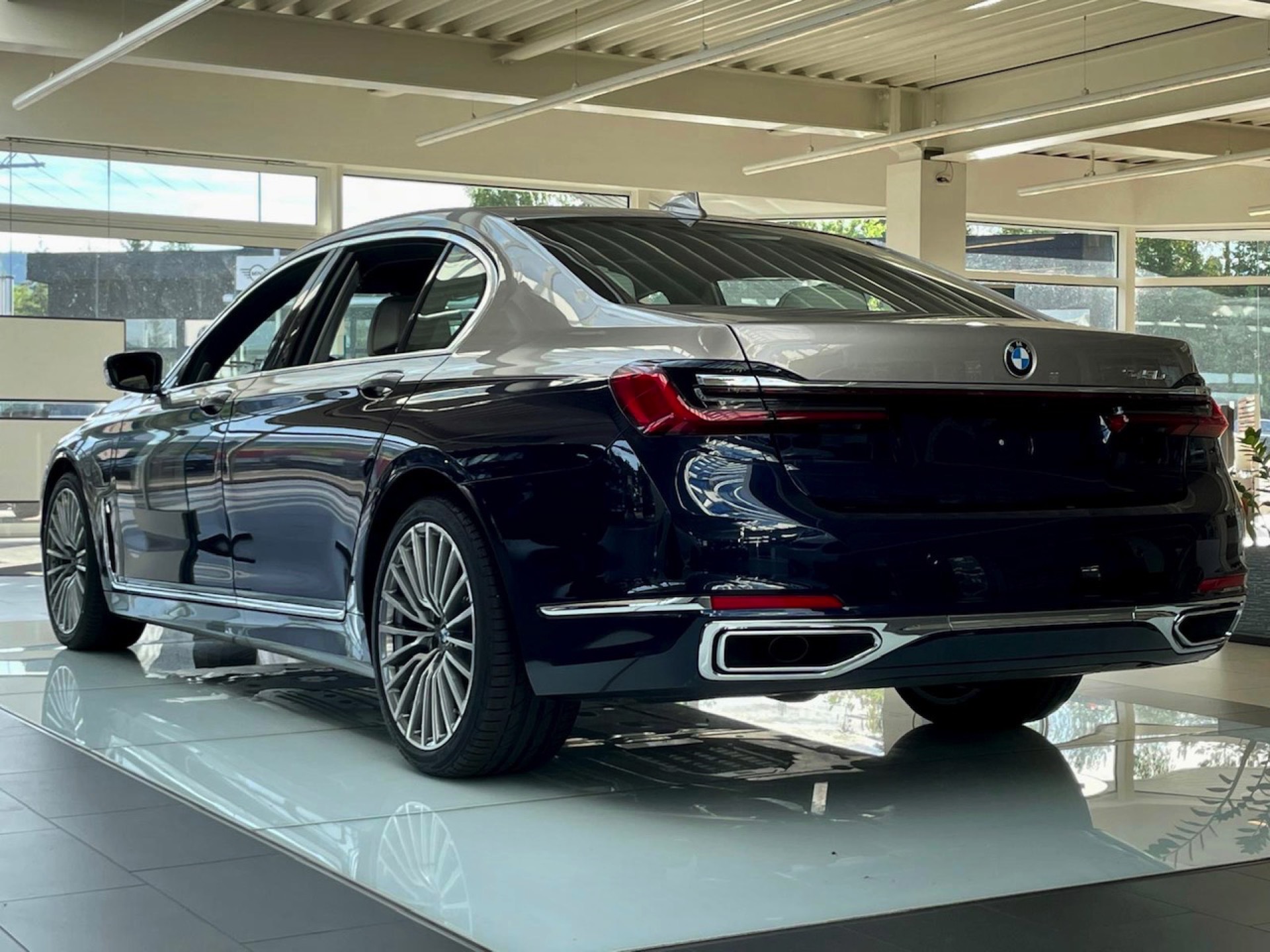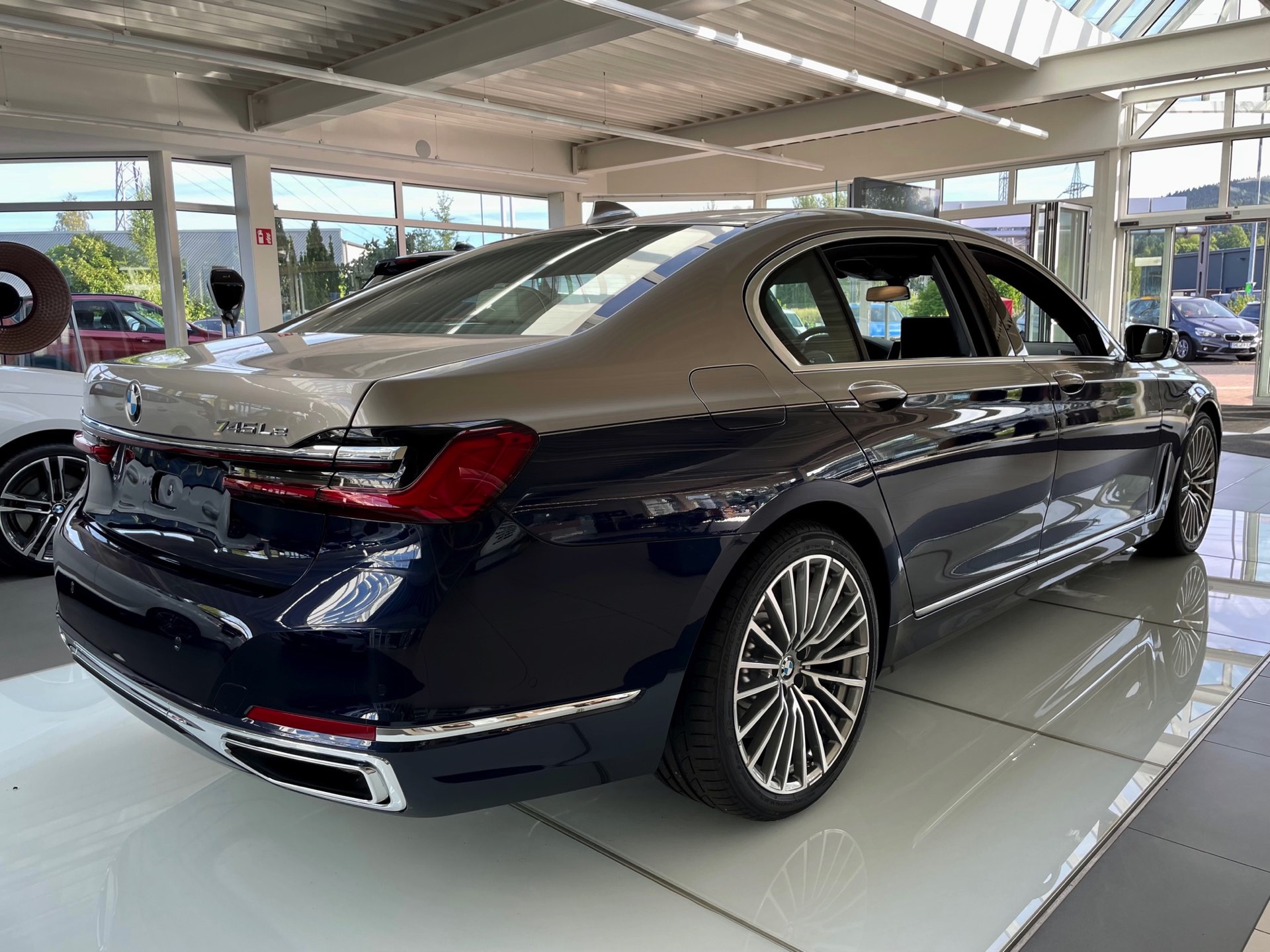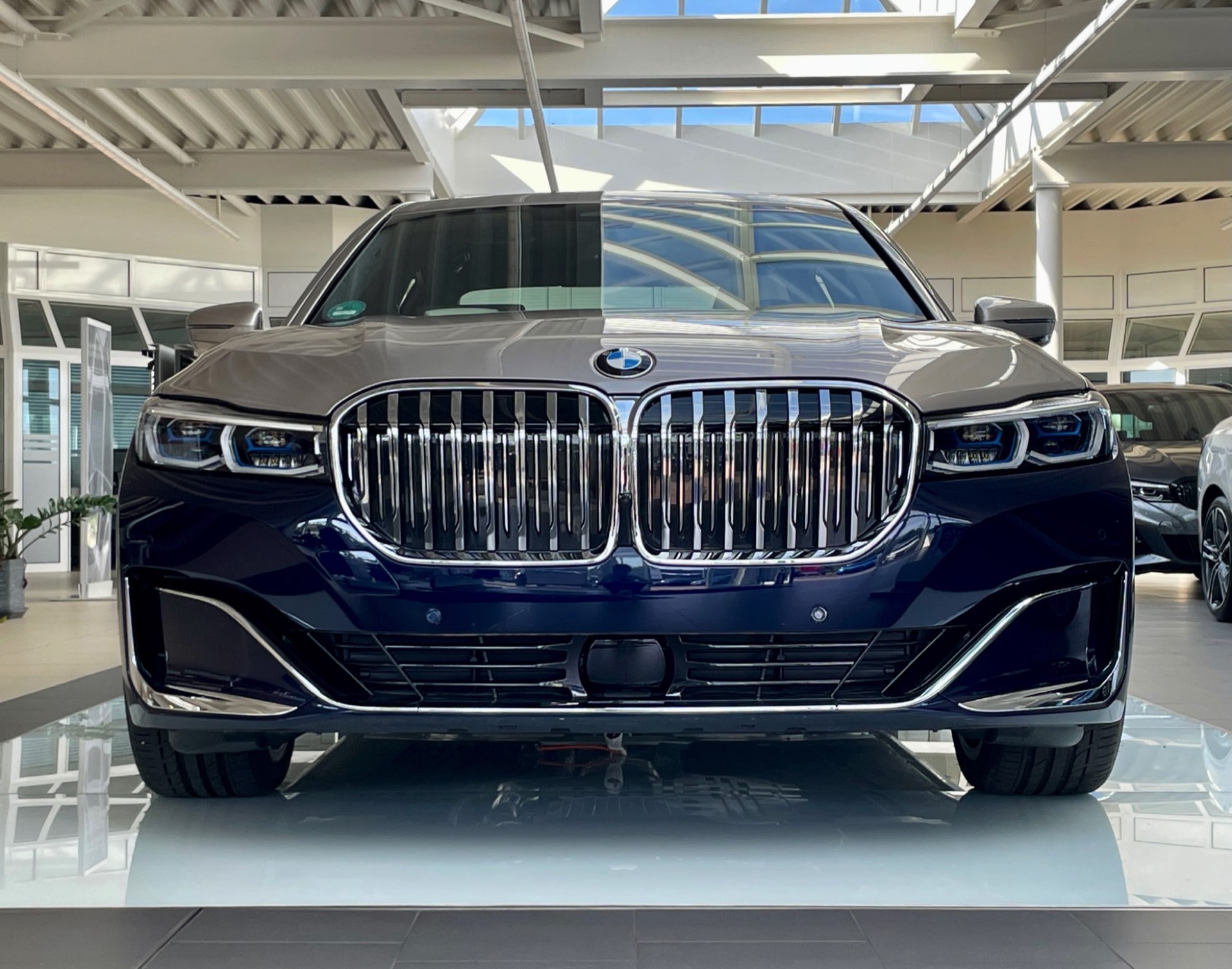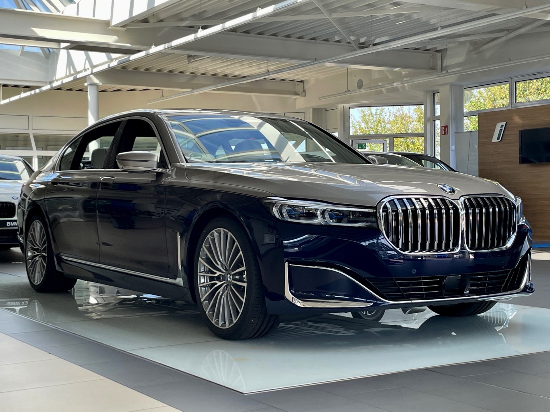 Dass es noch mindestens eine weitere Kombination gab, zeigt ein Fahrzeug im Showroom der Autohaus Matthes Gruppe am Standort Suhl: Aktuelle Fotos zeigen den “alten” BMW 7er (G12 LCI) mit Two-Tone-Lackierung in Tansanitblau und Kaschmirsilber. Beim Anblick der auf 20 Zoll großen Vielspeichen-Felgen stehenden Luxuslimousine mit ihrer seit dem Facelift extrem präsenten Niere dürften nur die wenigsten Betrachter an ein bereits abgelöstes Modell denken, was natürlich auch an den stattlichen Dimensionen des Fahrzeugs liegt: In der Langversion streckt sich der 7er auf 5,26 Meter. Dass der bald seinen Marktstart feiernde Nachfolger mit mindestens 5,39 Meter noch ein gutes Stück länger ist, unterstreicht den inzwischen nochmals gestiegenen Anspruch der 7er-Reihe deutlich. "