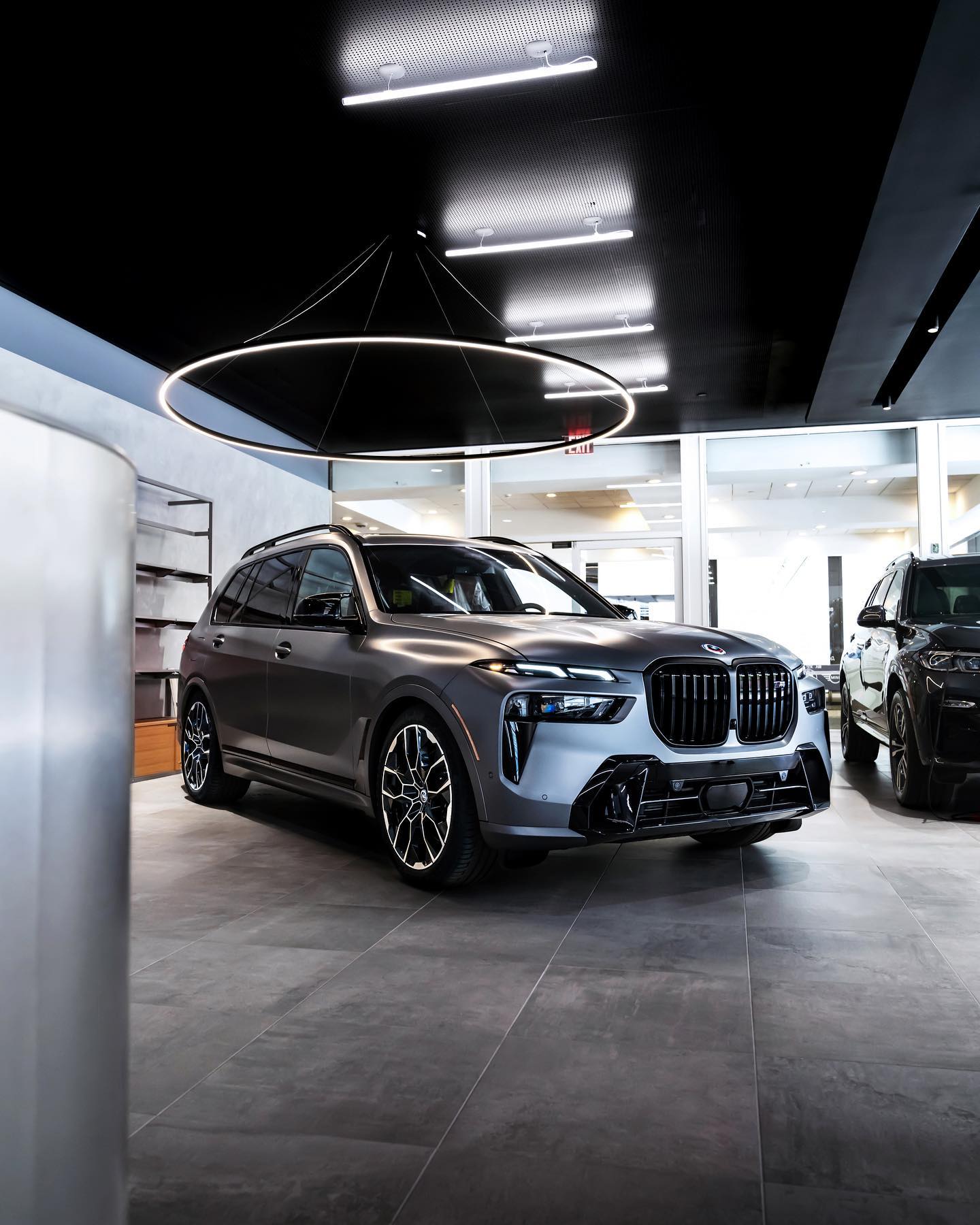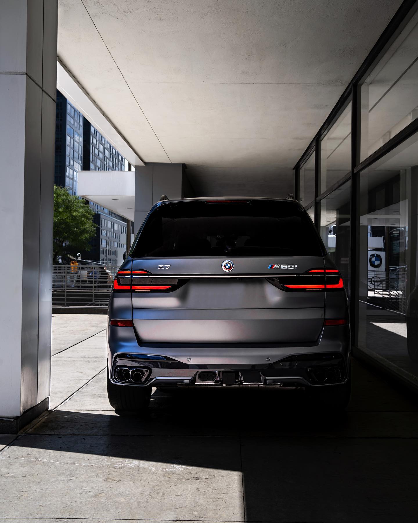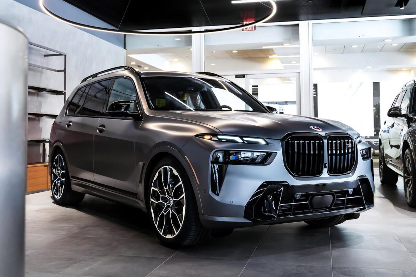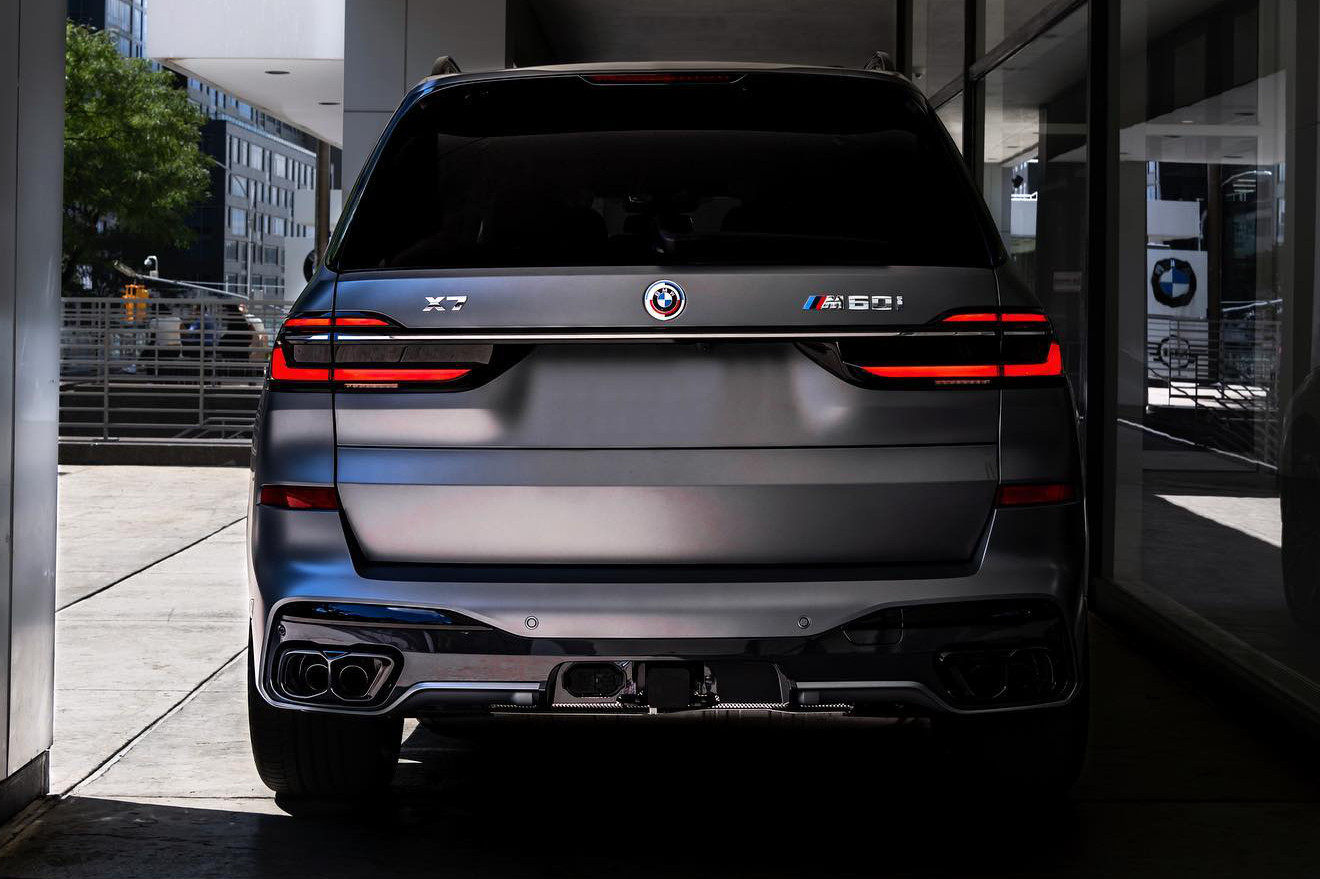 Aus den USA erreichen uns die nächsten Fotos vom BMW X7 Facelift (G07 LCI), dieses Mal mit matter Individual-Lackierung in Frozen Pure Grey. Die Fotos aus dem Showroom von BMW of Manhattan in New York City zeigen das sportliche Aushängeschild der X7-Familie, wobei das M Performance-Modell wie gewohnt den Look des M Sport-Pakets trägt. Die allein durch ihre Abmessungen imposante und seit dem Facelift im Fall des M60i serienmäßig beleuchtete Iconic Glow-Niere ist dank Shadow Line mit erweiterten Umfängen in Hochglanz-Schwarz lackiert, außerdem sorgt die erweiterte Shadow Line auch für schwarzen Glanz an den vier Endrohren des Top-X7.
