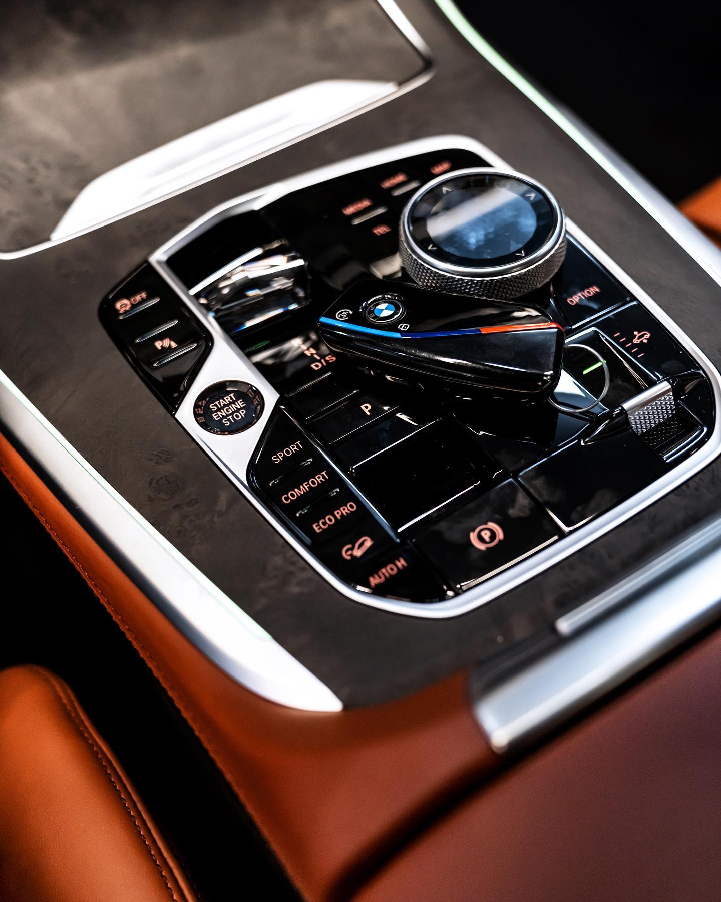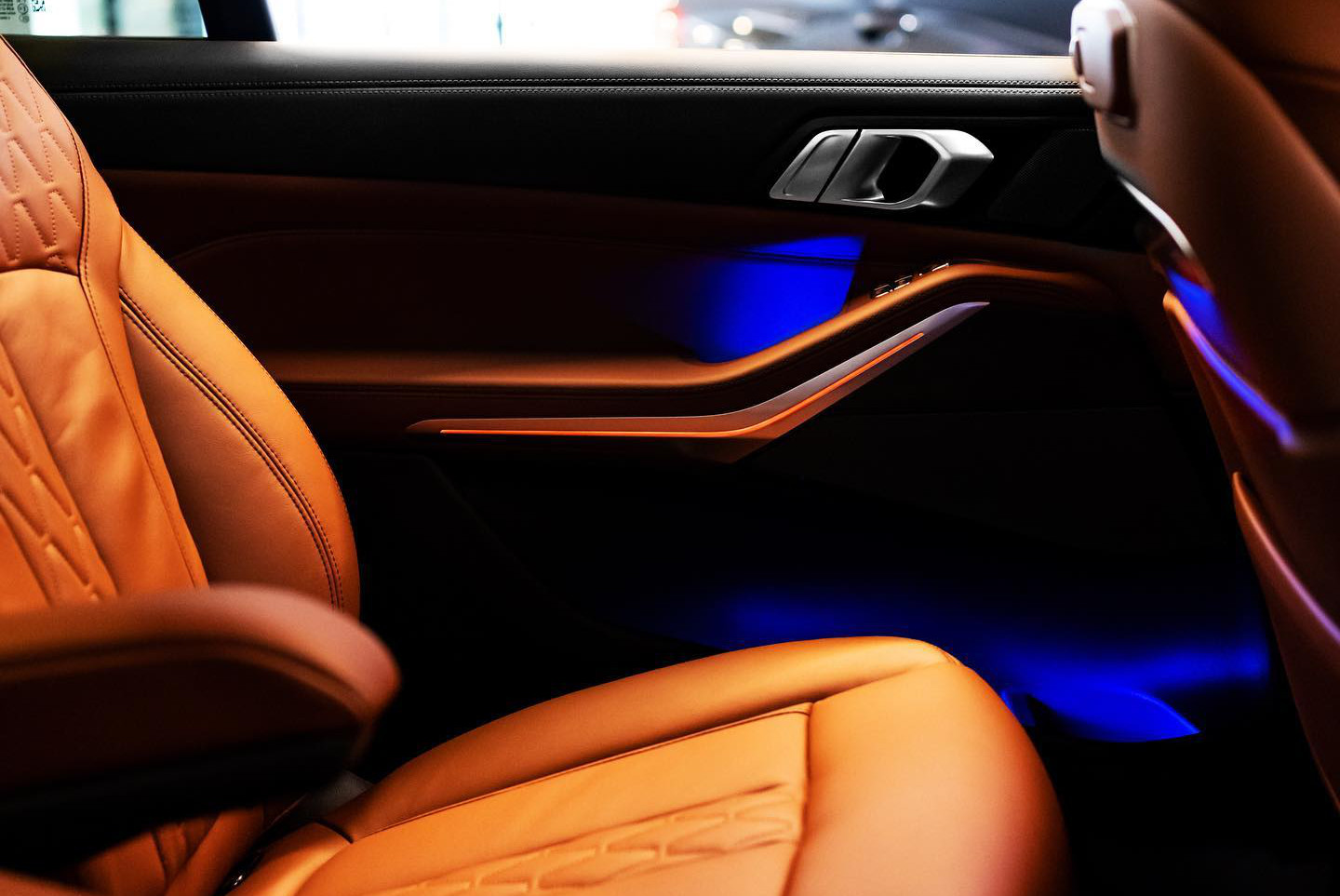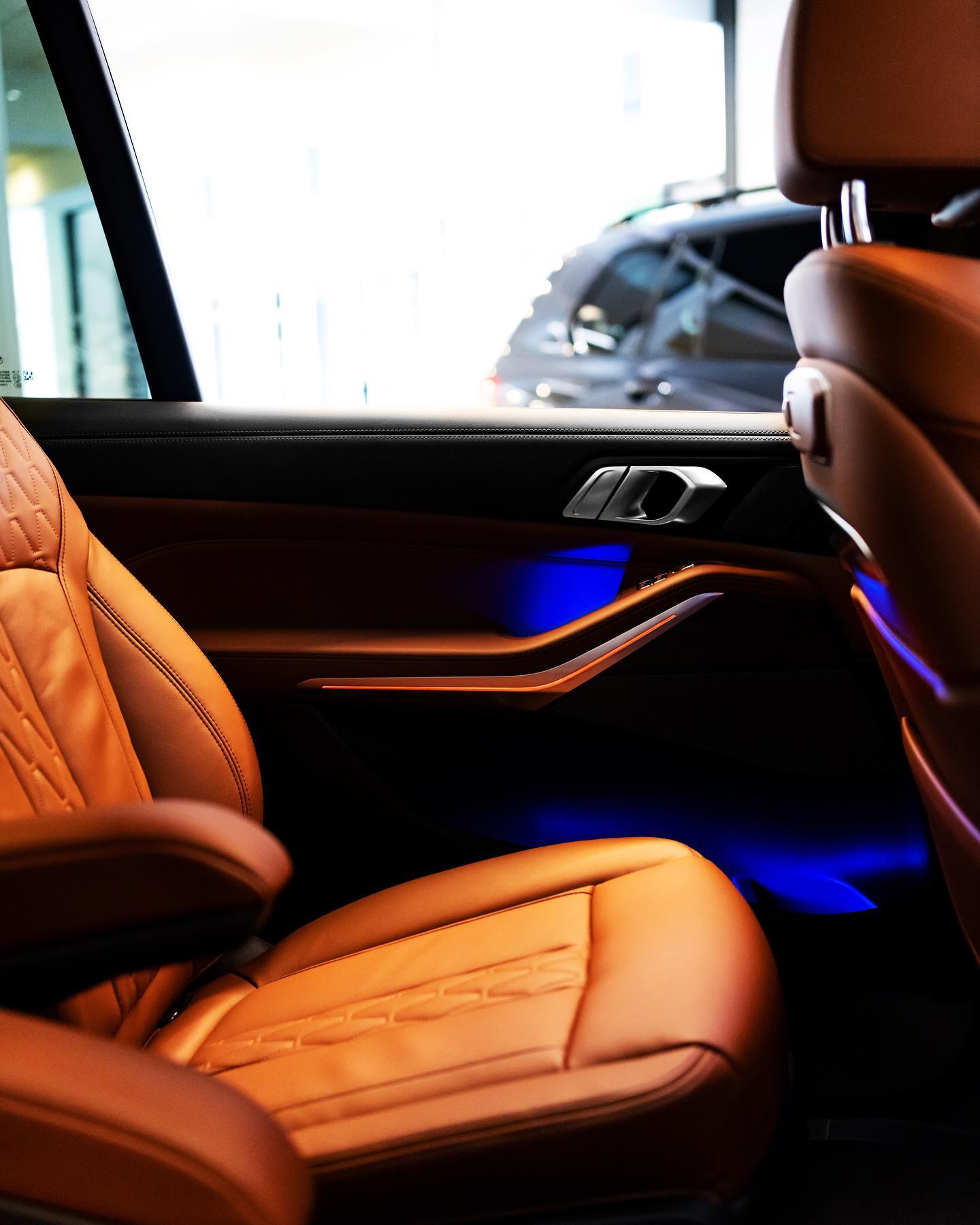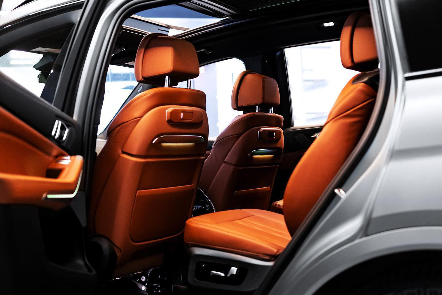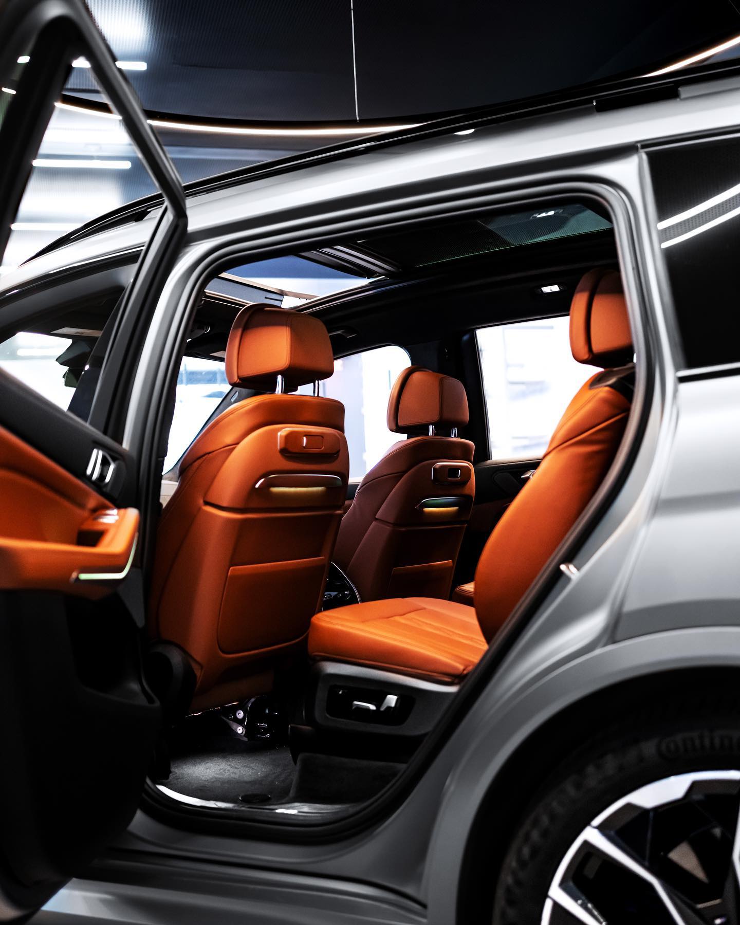 Im Innenraum des BMW X7 Facelift sehen wir die Merino-Lederausstattung im exklusiven Farbton Tartufo, auch das neue Curved Display ist auf einem der Fotos gut zu sehen. Neben dem 12,3 Zoll großen Instrumenten-Display hinter dem Lenkrad beherbergt das geschwungene Deckglas auch einen 14,9 Zoll großen Touchscreen für Infotainment-Inhalte. Komplettiert wird das Anzeigen-Paket vom Head-Up Display, das für alle X7 zum Serienumfang gehört und wichtige Infos direkt ins Blickfeld des Fahrers projiziert.