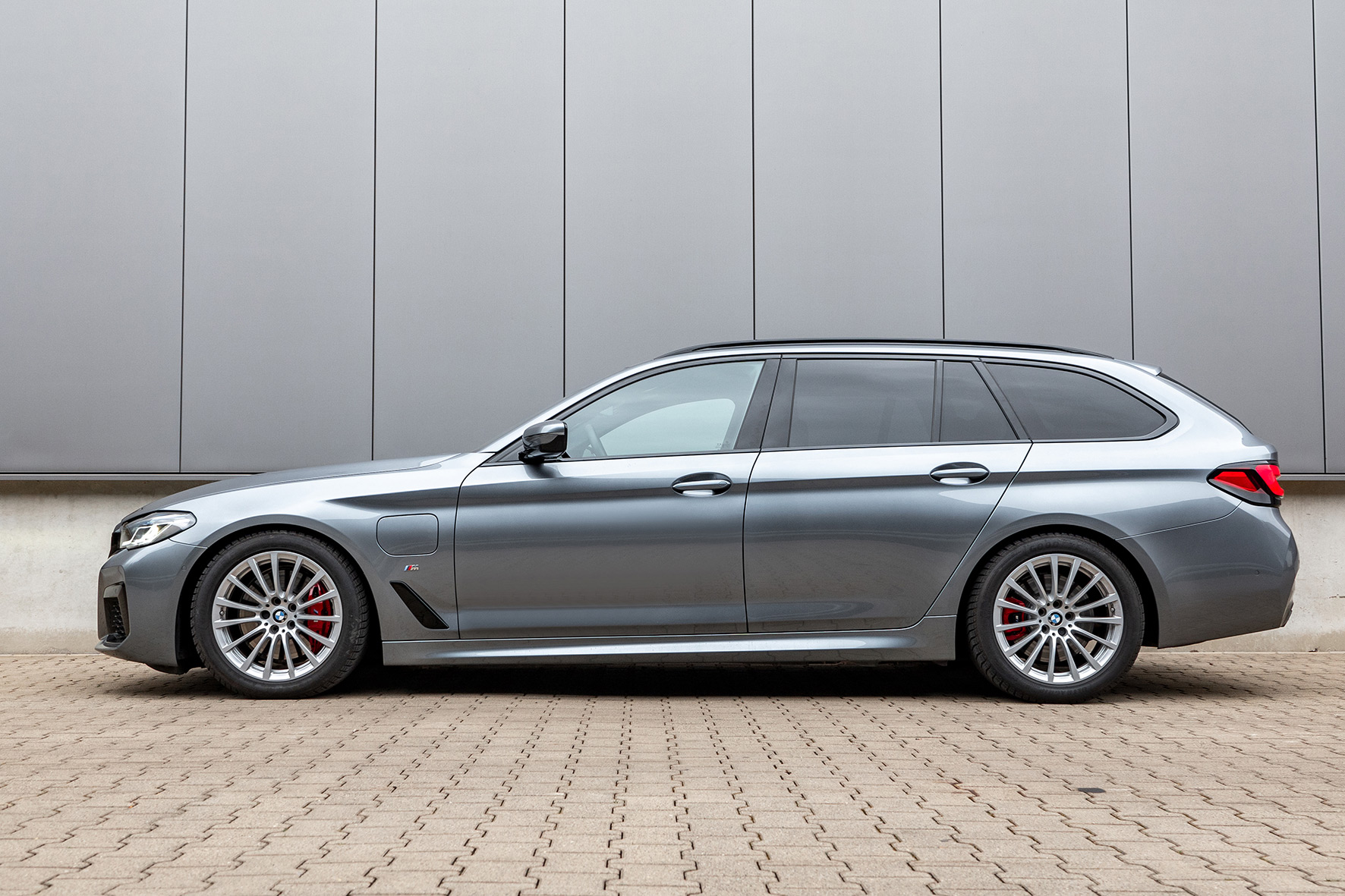 Schon auf den ersten Blick fällt beim gezeigten BMW 530e Touring in Skyscraper Grau metallic die Fahrzeughöhe auf: Obwohl das Foto-Modell mit humaner 18-Zoll-Bereifung daherkommt, füllen die Felgen die Radkästen des Edel-Kombis ansprechend aus. Die Front wirkt nicht zuletzt dank der M Hochglanz Shadow Line mit erweiterten Umfängen als Teil des M Sportpaket Pro eine ganze Spur grimmiger, als man es zunächst von einem 5er erwarten würde. Um 30 Millimeter senken die H&R Sportfedern die Vorderachse ab, bei der Hinterachse sind es 20 Millimeter. "