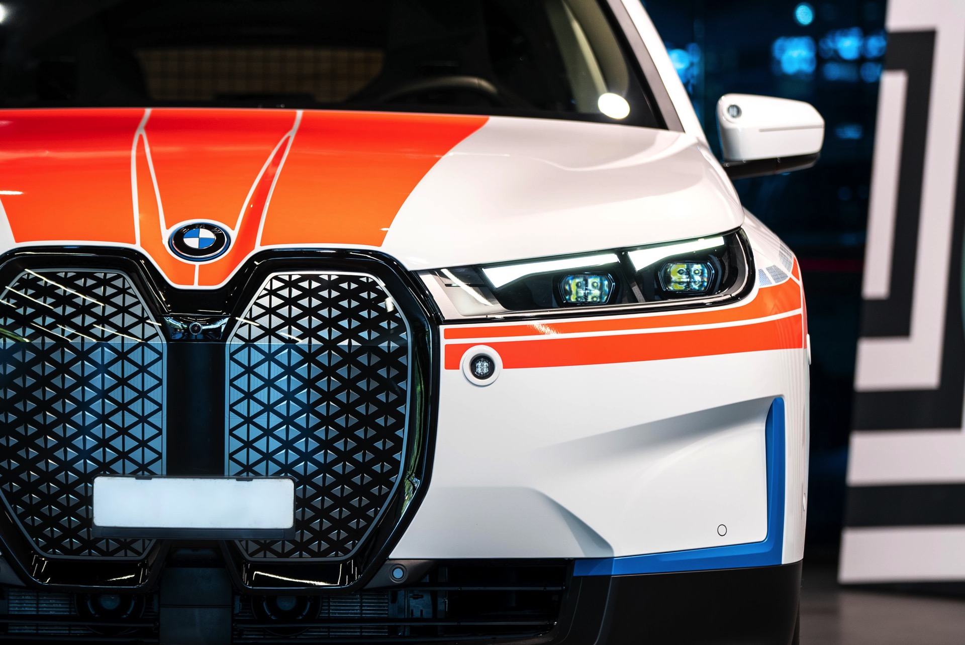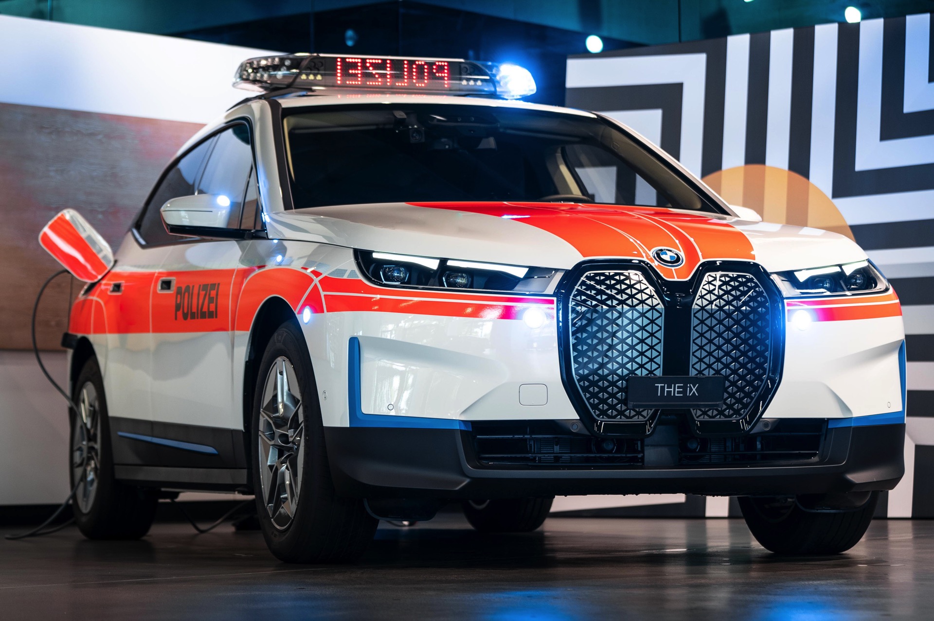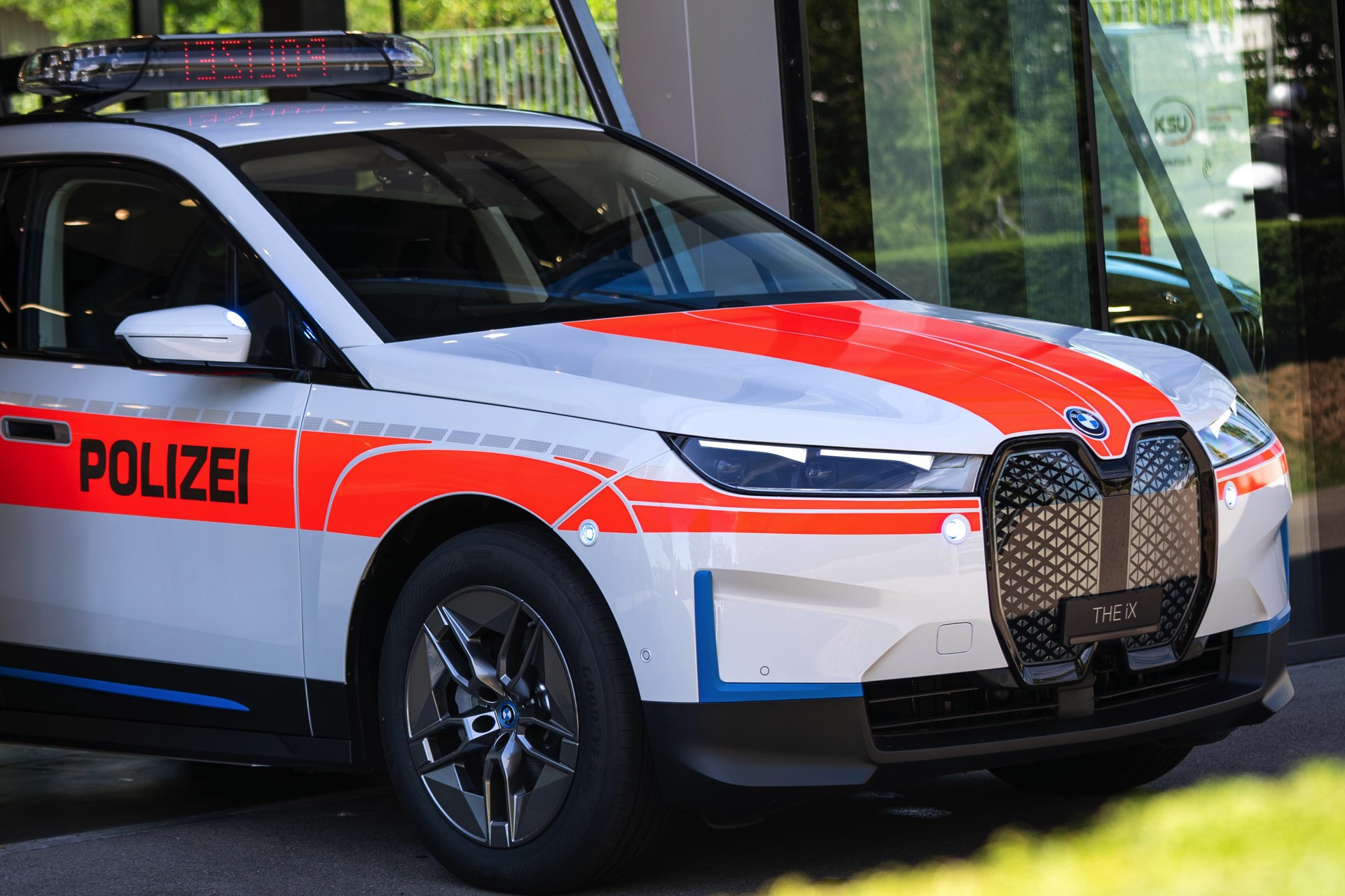 Für maximale Sichtbarkeit im Straßenverkehr trägt der Polizei-iX nicht nur eine Beklebung mit großen Flächen in leuchtendem Orange und diversen Reflektor-Elementen, zusätzlich wurden auch eine Vielzahl von Blitzer-Elementen verbaut. Auf den ersten Blick sticht dabei nur der Licht- und Signal-Balken auf dem Dach ins Auge, aber kleine blaue LED-Blitzer finden sich auch in der Frontschürze unterhalb der Scheinwerfer, in den Außenspiegeln sowie im Bereich der vorderen Radhäuser, wobei letztere vor allem möglichen Querverkehr in Kreuzungs-Bereichen warnen und auf das Einsatzfahrzeug aufmerksam machen sollen.