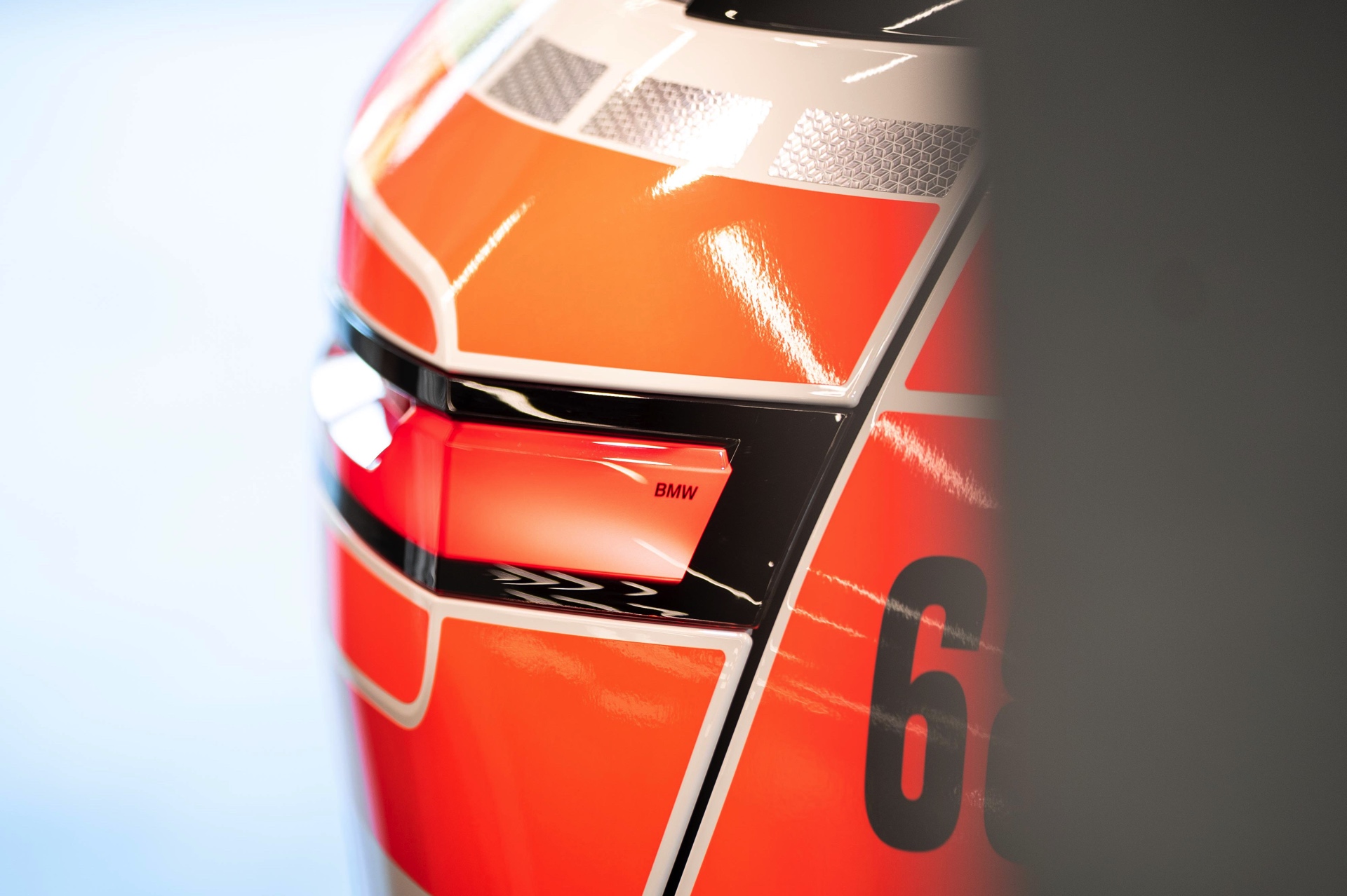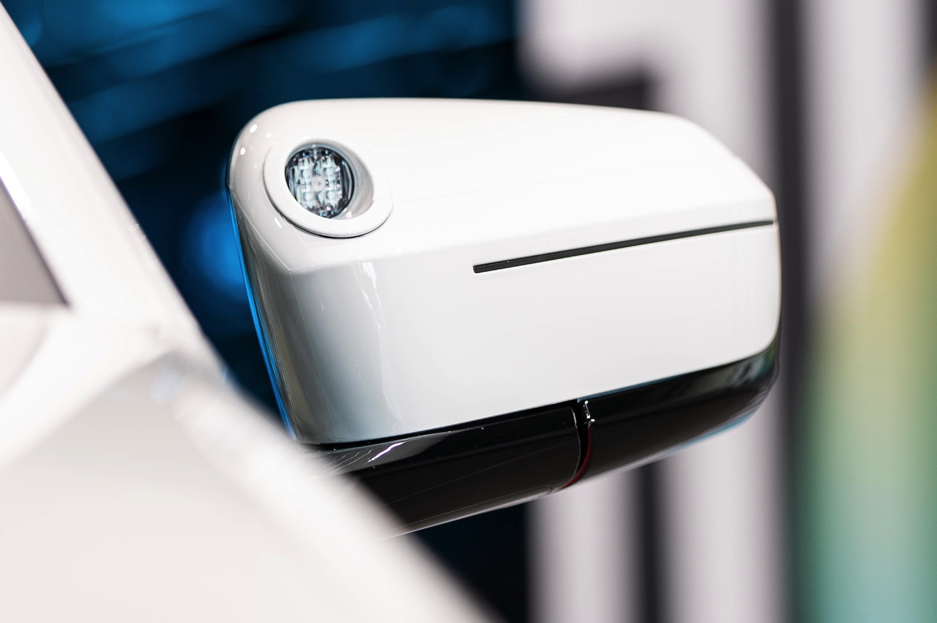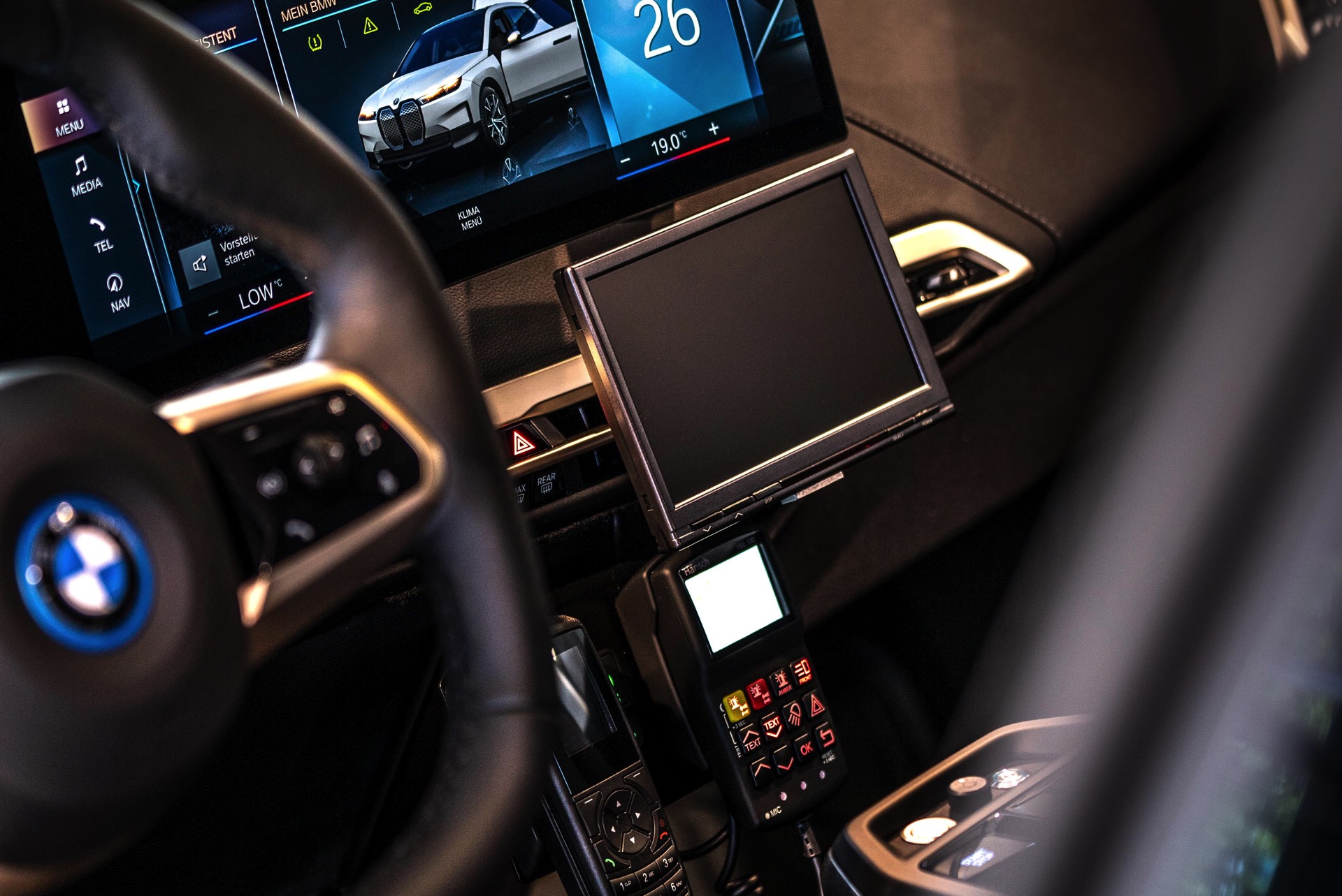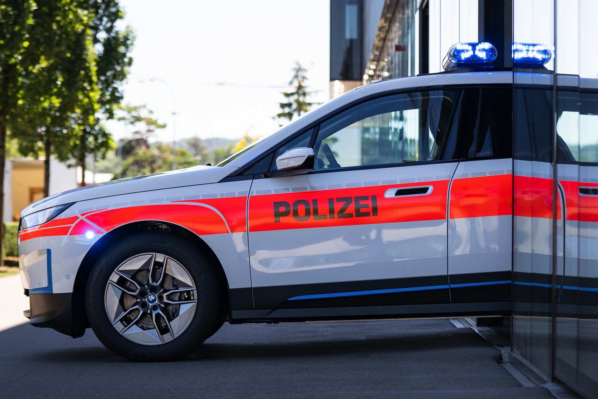Für maximale Sichtbarkeit im Straßenverkehr trägt der Polizei-iX nicht nur eine Beklebung mit großen Flächen in leuchtendem Orange und diversen Reflektor-Elementen, zusätzlich wurden auch eine Vielzahl von Blitzer-Elementen verbaut. Auf den ersten Blick sticht dabei nur der Licht- und Signal-Balken auf dem Dach ins Auge, aber kleine blaue LED-Blitzer finden sich auch in der Frontschürze unterhalb der Scheinwerfer, in den Außenspiegeln sowie im Bereich der vorderen Radhäuser, wobei letztere vor allem möglichen Querverkehr in Kreuzungs-Bereichen warnen und auf das Einsatzfahrzeug aufmerksam machen sollen.