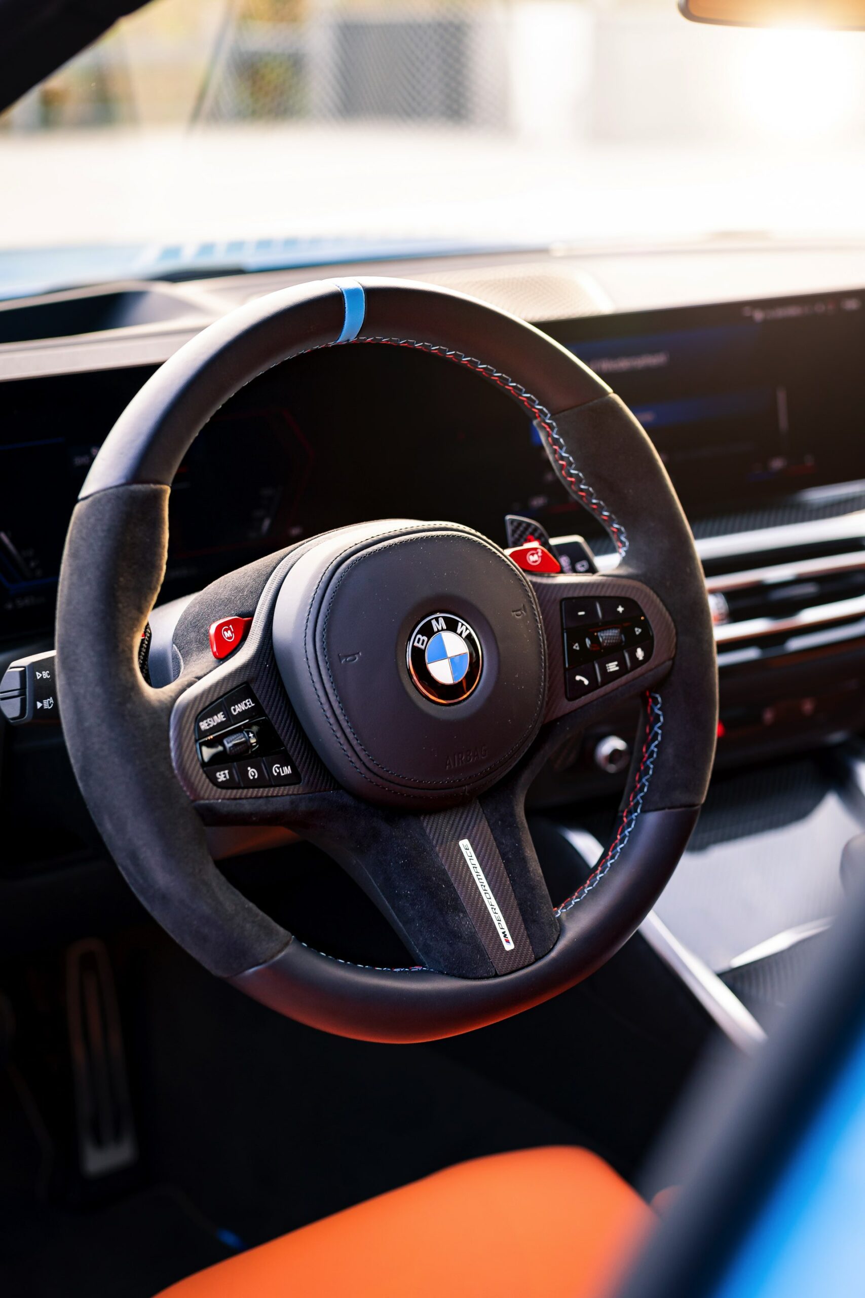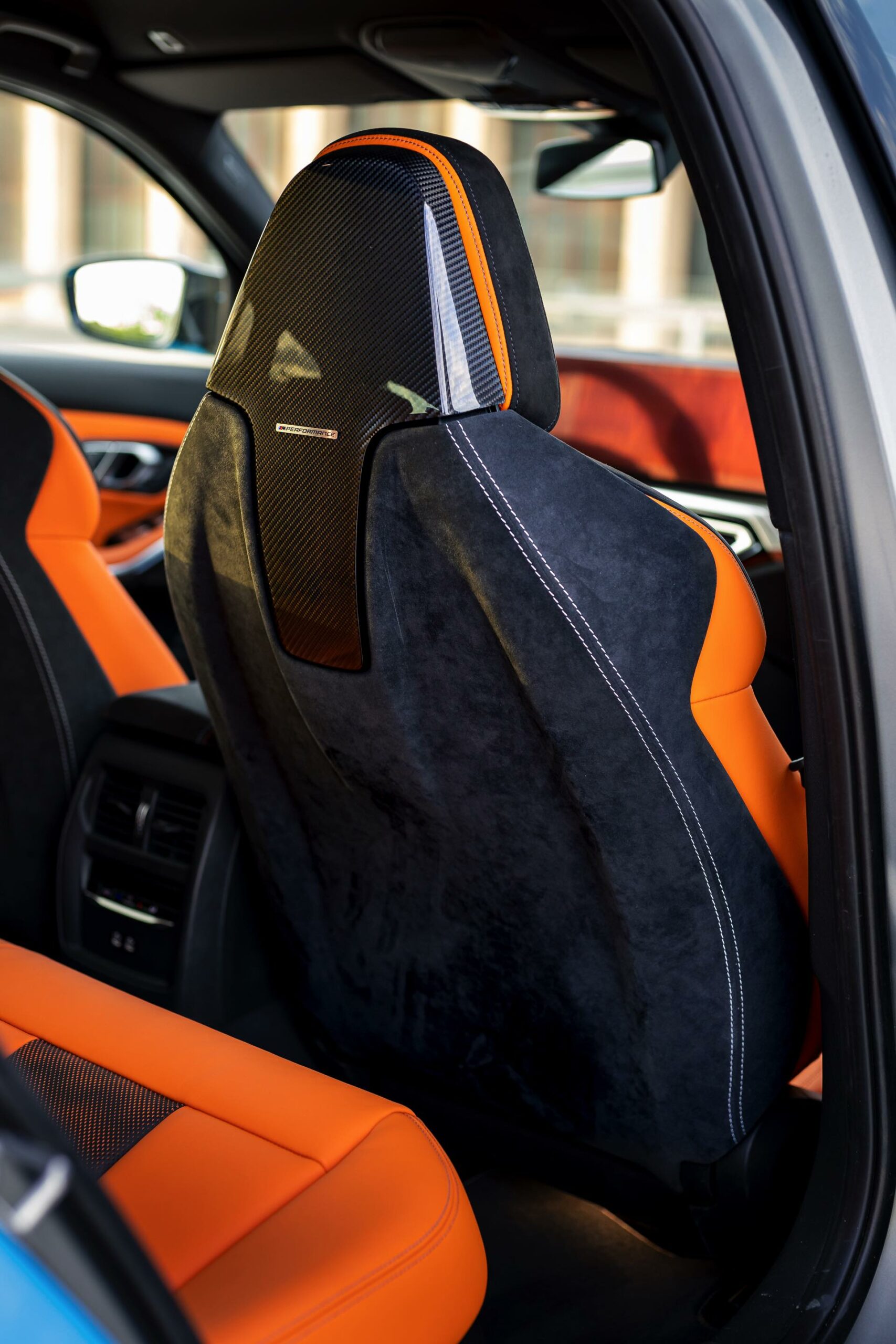 Weitere kleine Verfeinerungen für den Innenraum reichen vom M Performance-Lenkrad mit Alcantara-Kranz und 12-Uhr-Markierung über Einstiegsleisten und Fußmatten bis hin zu den Tür-Pins. Auf die ab Werk erhältlichen M Carbon-Schalensitze mit ihrer bemerkenswerten Carbon-Schale verzichtet der gezeigte BMW M3 Touring zwar, aber auch für die Seriensitze des 510-PS-Kombis gibt es zumindest im Bereich der Kopfstützen Carbon-Abdeckungen zum Nachrüsten.