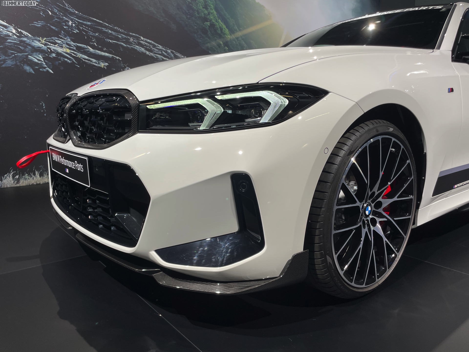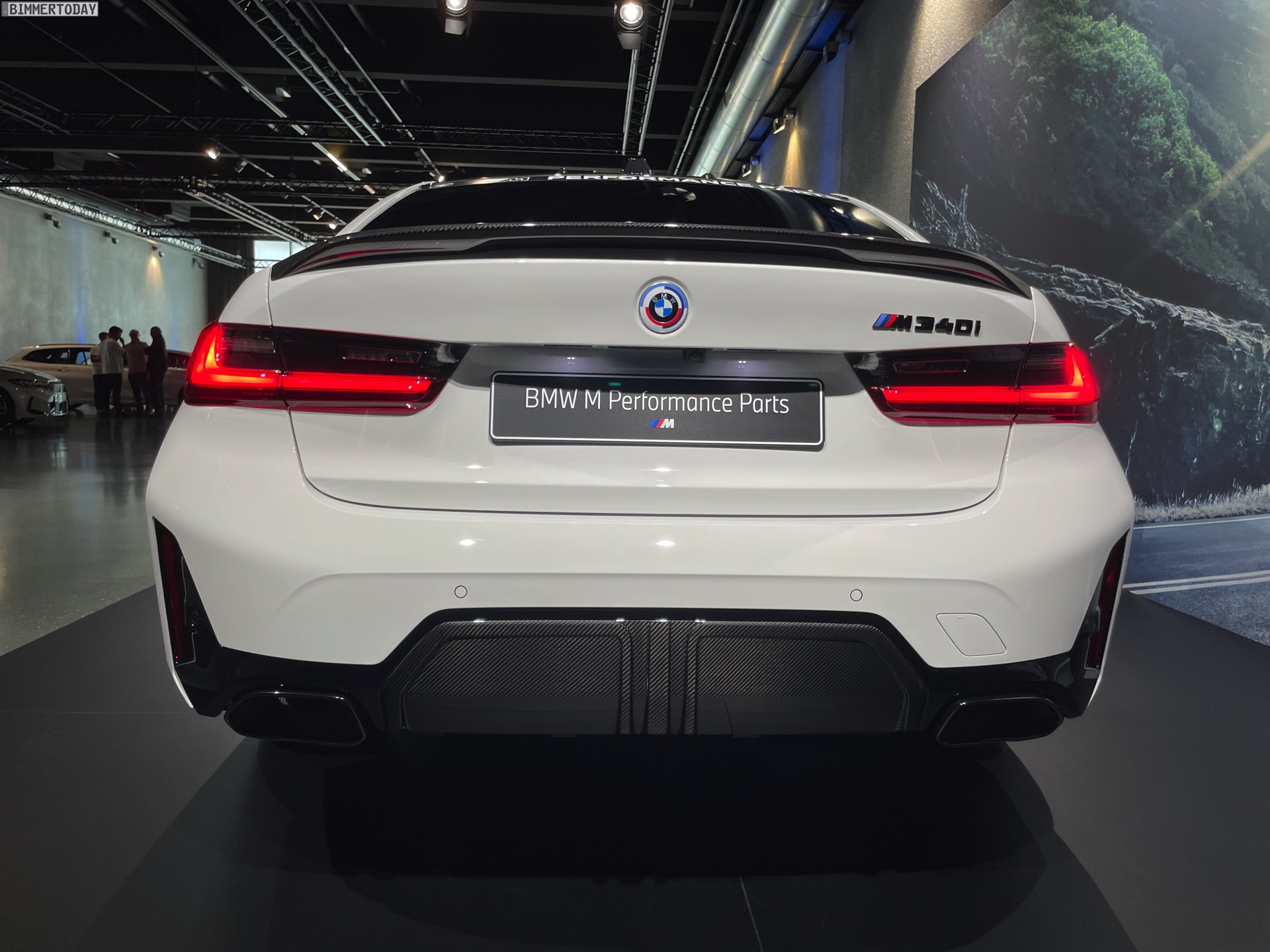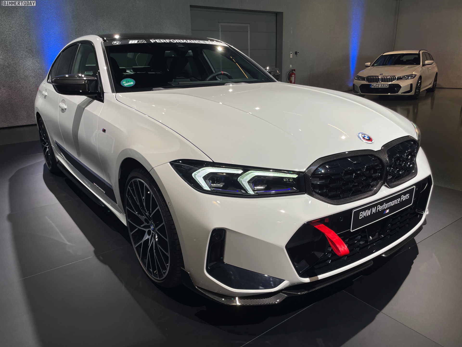 Die zum Teil schon vor der Modellpflege erhältlichen, zum Teil aber auch neu gestalteten Tuning-Teile bauen auf die geometrischen Formen der neuen M-Schürzen auf und lassen den 3er noch sportlicher wirken. Andere Facelift-Modifikationen, im Exterieur also vor allem die Scheinwerfer ohne ihre bisherige Einkerbung am unteren Rand, treten so zumindest auf den ersten Blick in den Hintergrund. Auf der Motorhaube sehen wir oberhalb der Carbon-Niere genau wie an der Kofferraum-Haube das 50-Jahre-M-Logo, während in den Radhäusern die 20 Zoll großen Leichtmetallräder im Design Kreuzspeiche 794 M Bicolor zu sehen sind. Wer hier eher farbige Akzente setzen will, kann bei M Performance auch Felgen in fünf anderen Designs bestellen. "