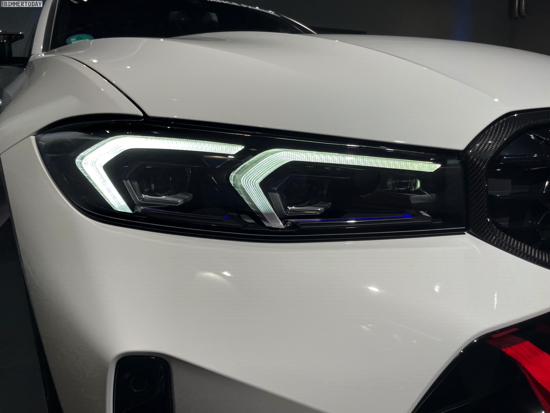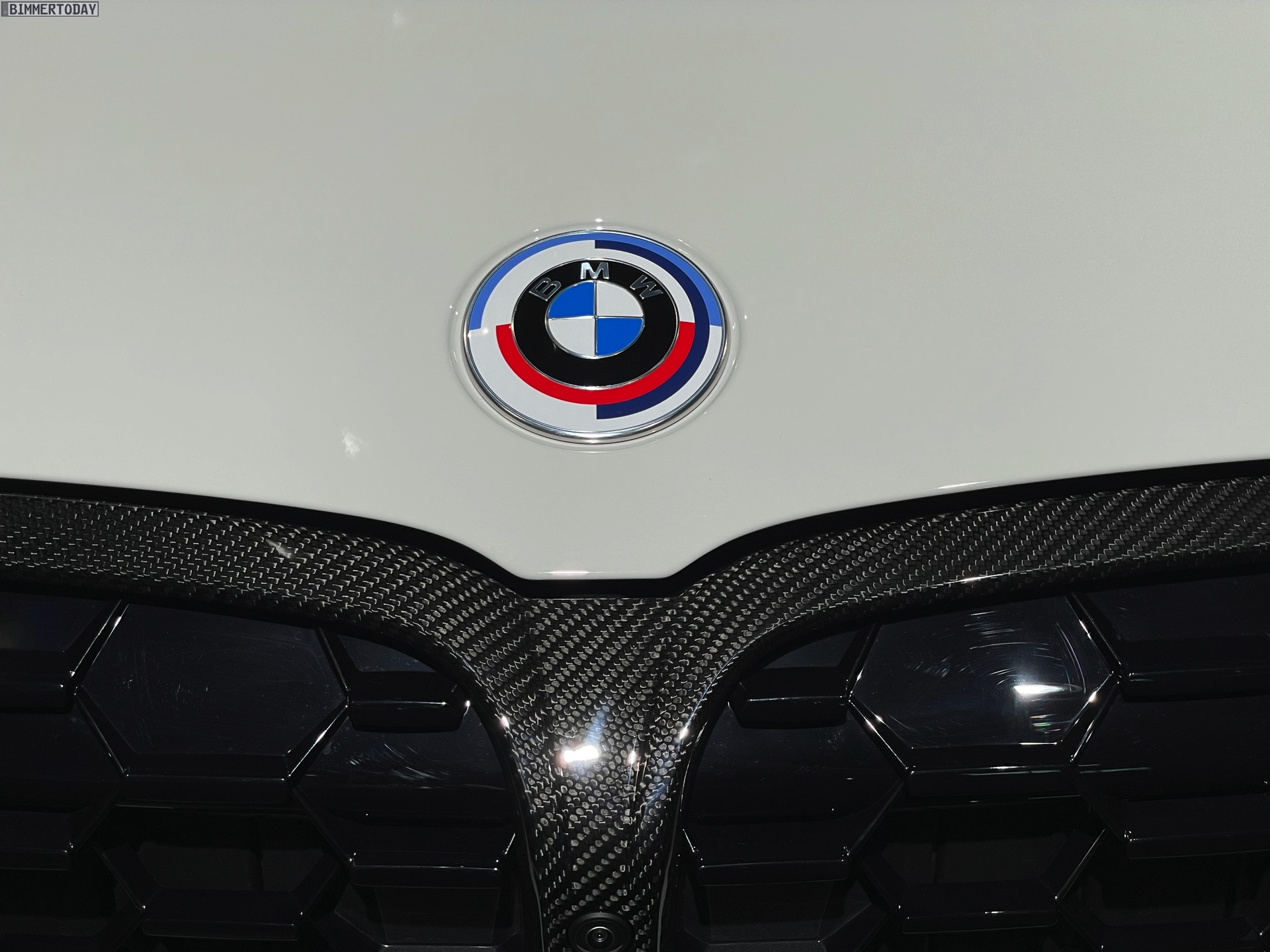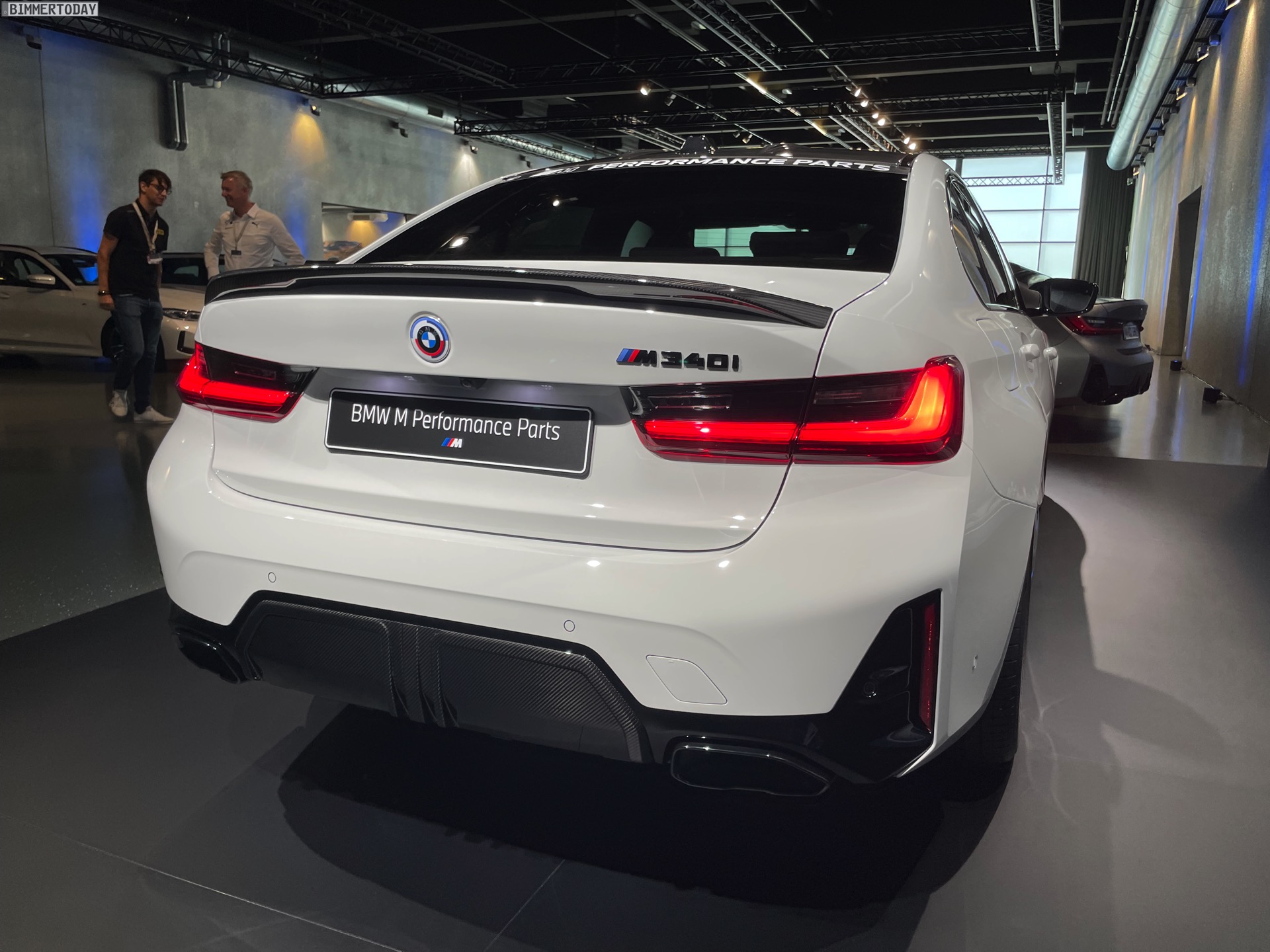 Die zum Teil schon vor der Modellpflege erhältlichen, zum Teil aber auch neu gestalteten Tuning-Teile bauen auf die geometrischen Formen der neuen M-Schürzen auf und lassen den 3er noch sportlicher wirken. Andere Facelift-Modifikationen, im Exterieur also vor allem die Scheinwerfer ohne ihre bisherige Einkerbung am unteren Rand, treten so zumindest auf den ersten Blick in den Hintergrund. Auf der Motorhaube sehen wir oberhalb der Carbon-Niere genau wie an der Kofferraum-Haube das 50-Jahre-M-Logo, während in den Radhäusern die 20 Zoll großen Leichtmetallräder im Design Kreuzspeiche 794 M Bicolor zu sehen sind. Wer hier eher farbige Akzente setzen will, kann bei M Performance auch Felgen in fünf anderen Designs bestellen. "