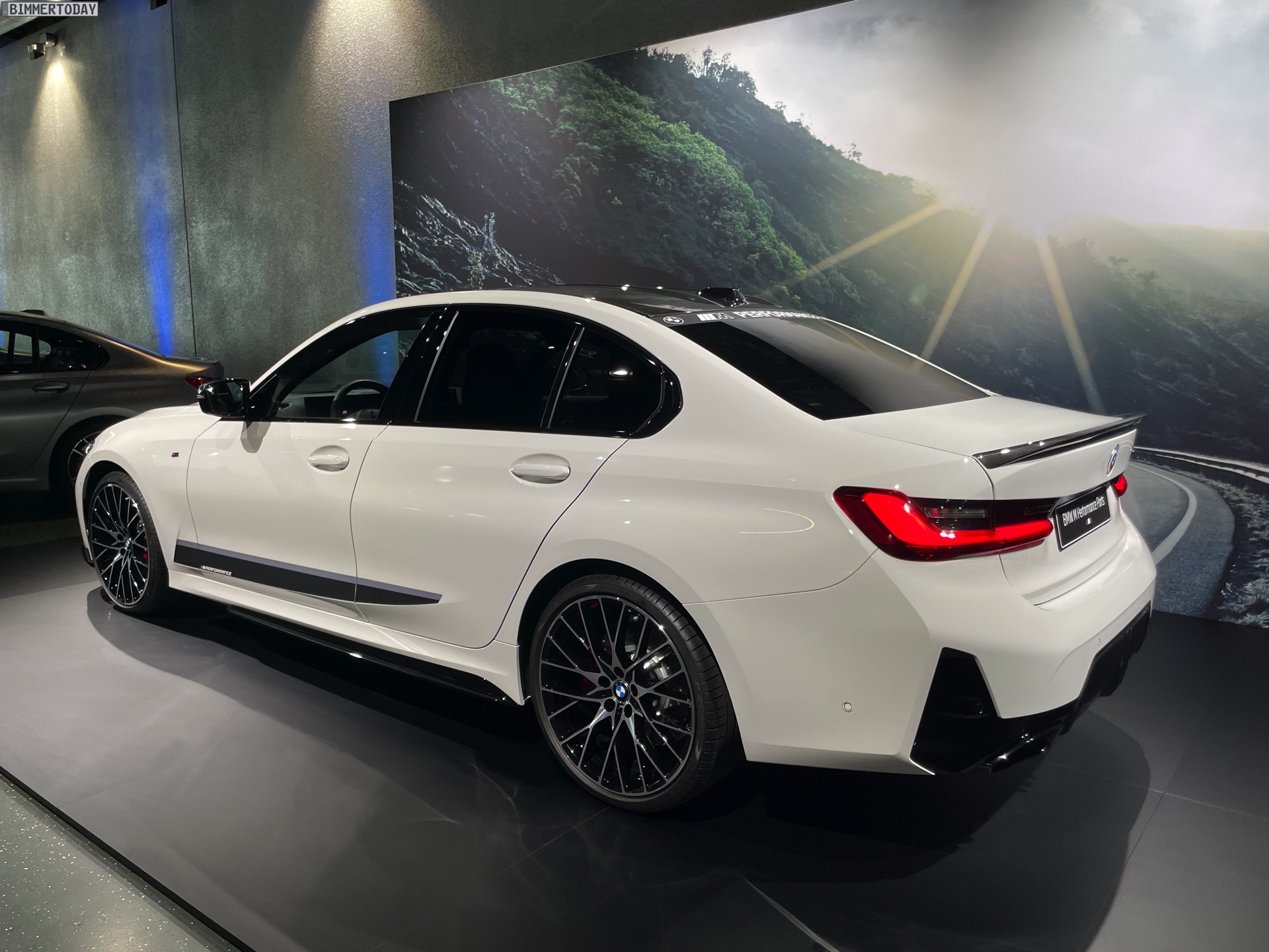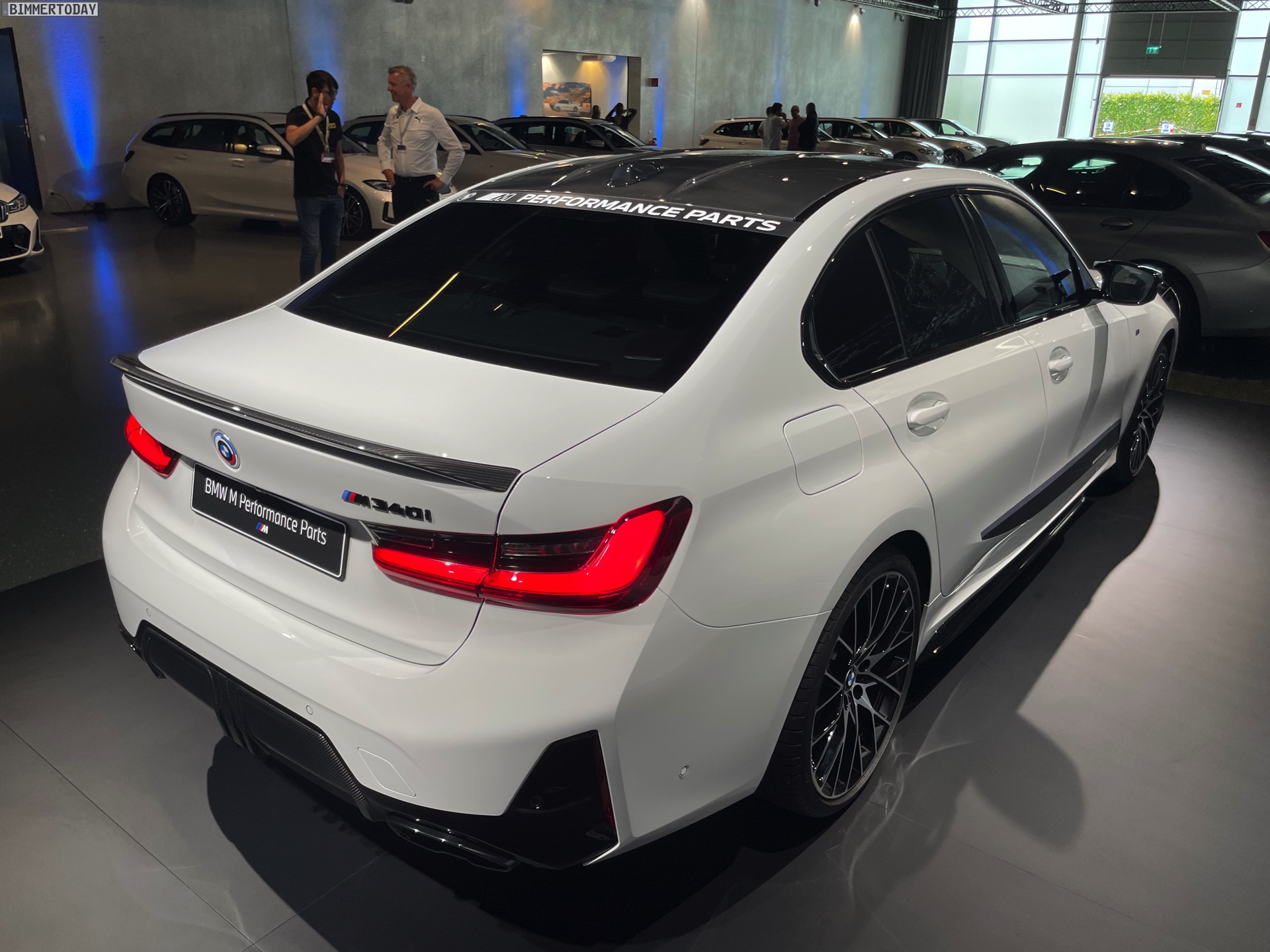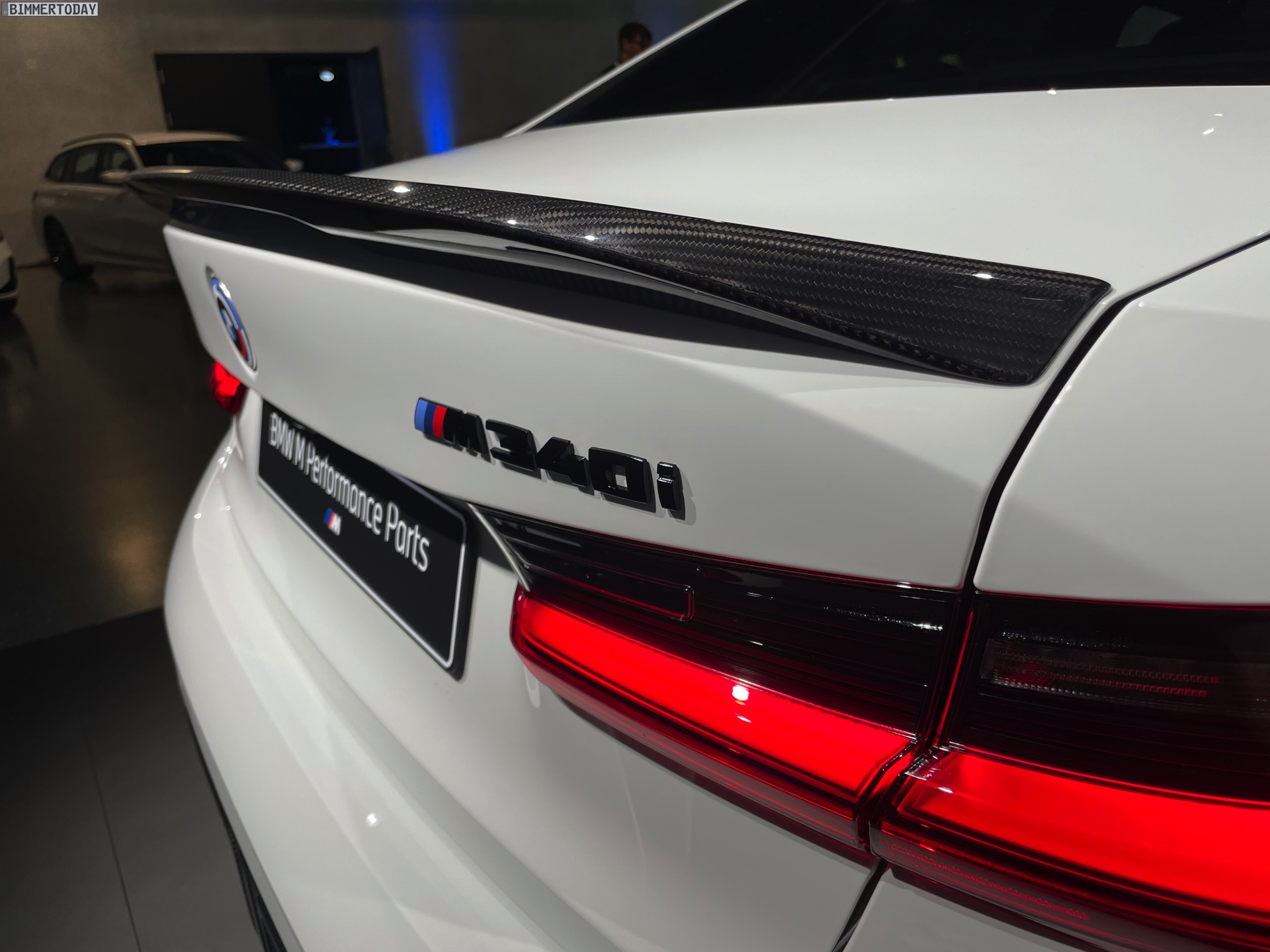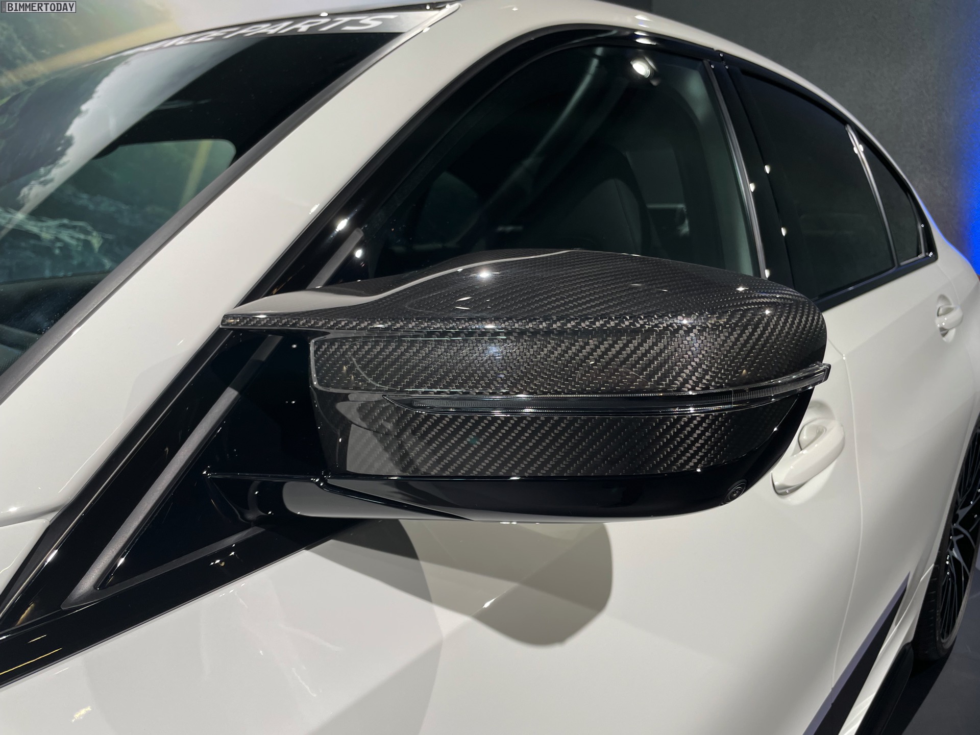 Mit jeder Menge Tuning-Teilen und sogar dem Carbon-Dach von BMW M Performance präsentiert sich das BMW 3er Facelift (G20 LCI) auf unseren aktuellen Fotos. Die frisch überarbeitete Mittelklasse-Limousine zeigt dabei, wie scharf ein 3er unterhalb des M3 (G80) maximal konfiguriert werden kann: Frontsplitter, Seitenschweller, Diffusor-Einsatz, Heckspoiler-Lippe, Außenspiegel, Nieren und selbst die Dach-Finne stammen aus dem sportlichen Zubehör-Programm, absoluter Hingucker ist aber zweifellos das für die Limousine seit kurzem als Sonderausstattung ab Werk angebotene Carbon-Dach. Während das an Front- und Heckscheibe von beschrifteten Folien eingefasste Dach aus Echt-Carbon besteht, ist die Finnen-Abdeckung aus technischen Gründen “nur” aus einer dunkel eingefärbten Aramid-Faser gefertigt: Wäre das Bauteil aus Carbon, könnten die darunter befindlichen Antennen ihren Job nur noch sehr eingeschränkt erledigen.