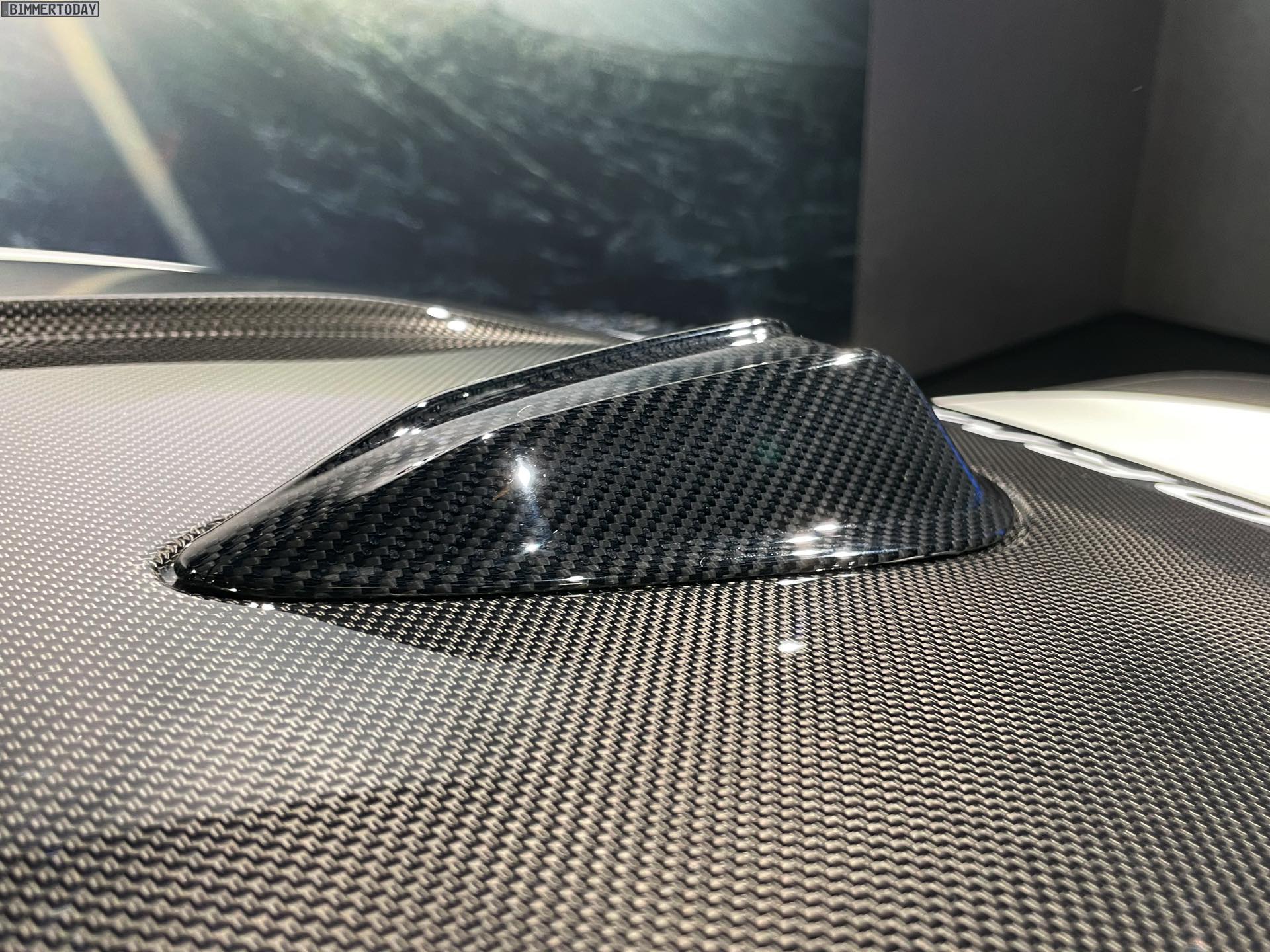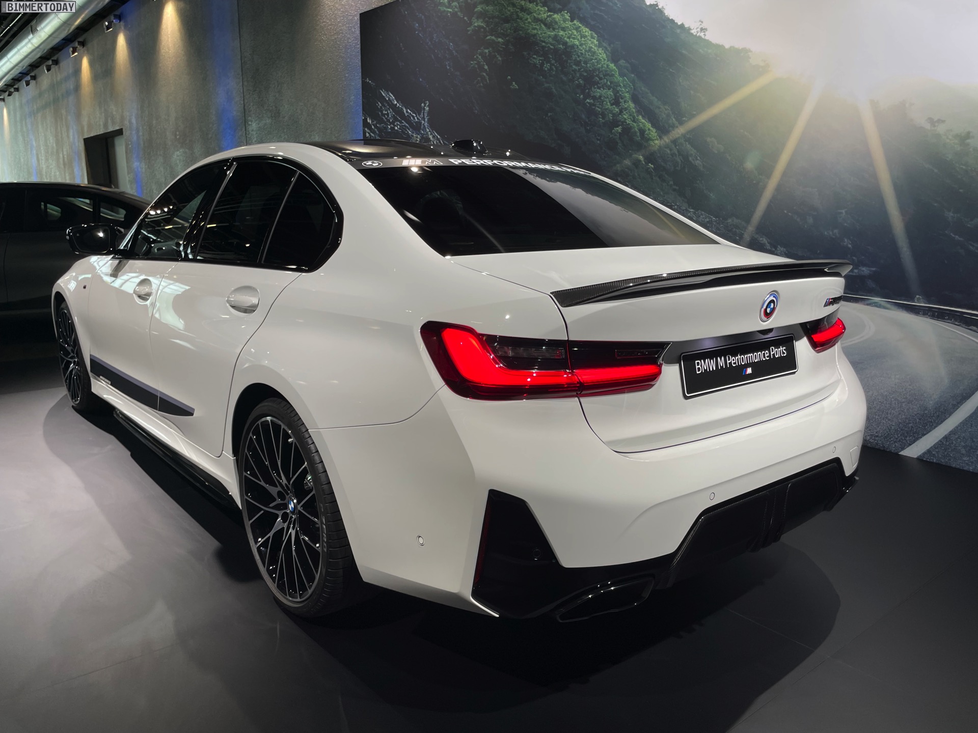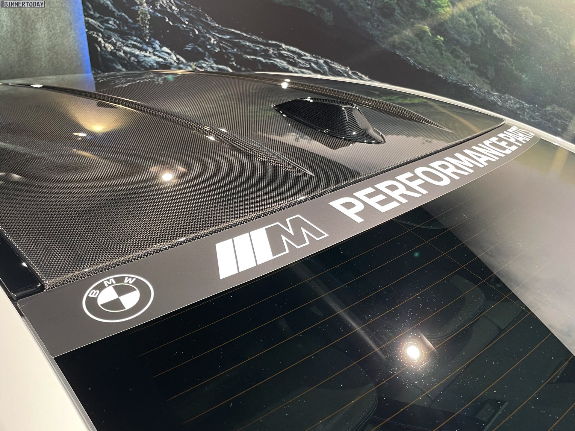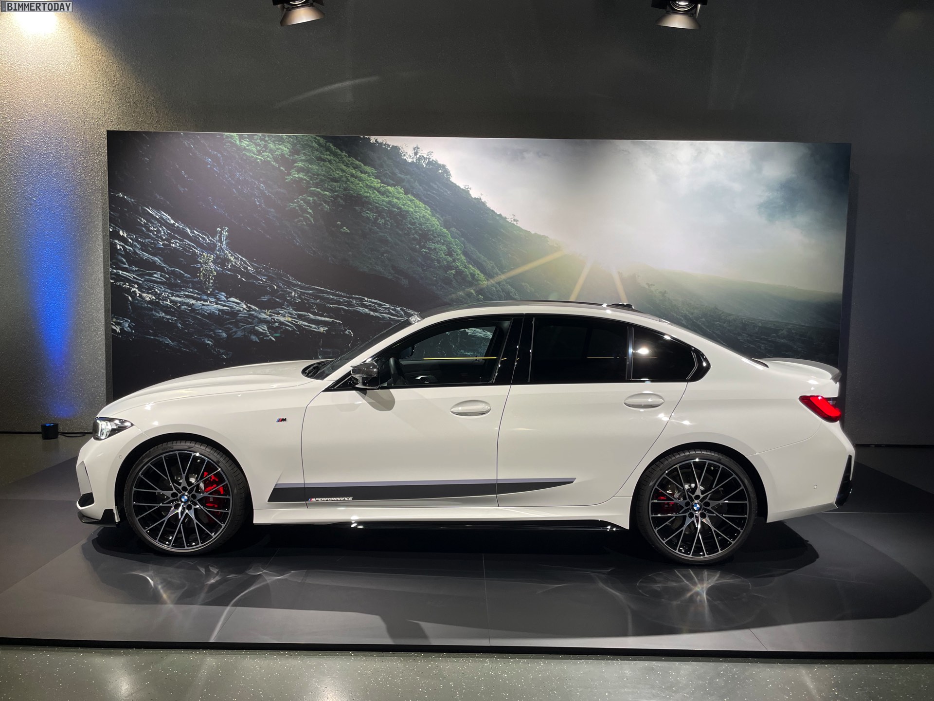 Mit jeder Menge Tuning-Teilen und sogar dem Carbon-Dach von BMW M Performance präsentiert sich das BMW 3er Facelift (G20 LCI) auf unseren aktuellen Fotos. Die frisch überarbeitete Mittelklasse-Limousine zeigt dabei, wie scharf ein 3er unterhalb des M3 (G80) maximal konfiguriert werden kann: Frontsplitter, Seitenschweller, Diffusor-Einsatz, Heckspoiler-Lippe, Außenspiegel, Nieren und selbst die Dach-Finne stammen aus dem sportlichen Zubehör-Programm, absoluter Hingucker ist aber zweifellos das für die Limousine seit kurzem als Sonderausstattung ab Werk angebotene Carbon-Dach. Während das an Front- und Heckscheibe von beschrifteten Folien eingefasste Dach aus Echt-Carbon besteht, ist die Finnen-Abdeckung aus technischen Gründen “nur” aus einer dunkel eingefärbten Aramid-Faser gefertigt: Wäre das Bauteil aus Carbon, könnten die darunter befindlichen Antennen ihren Job nur noch sehr eingeschränkt erledigen.
