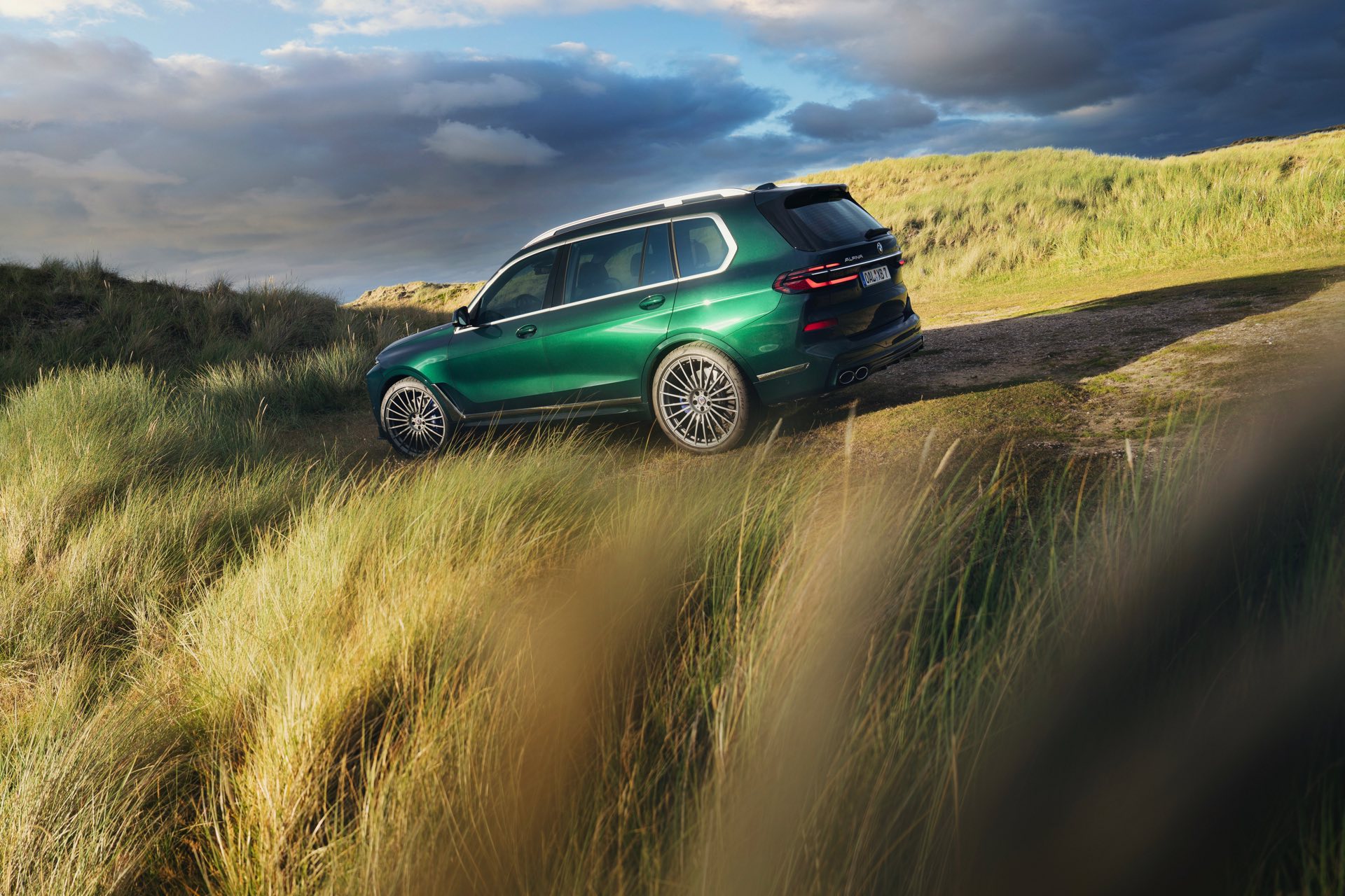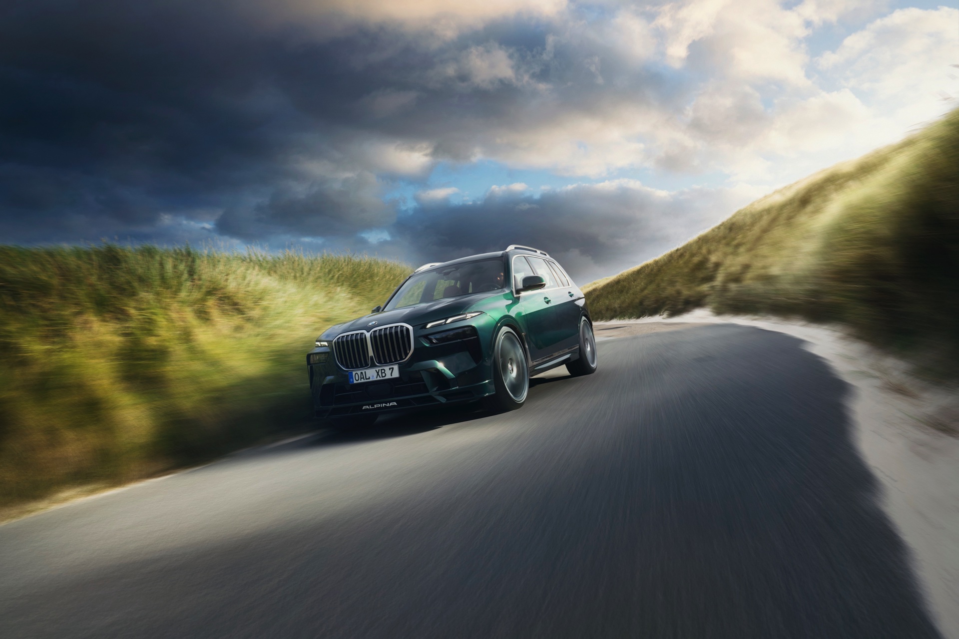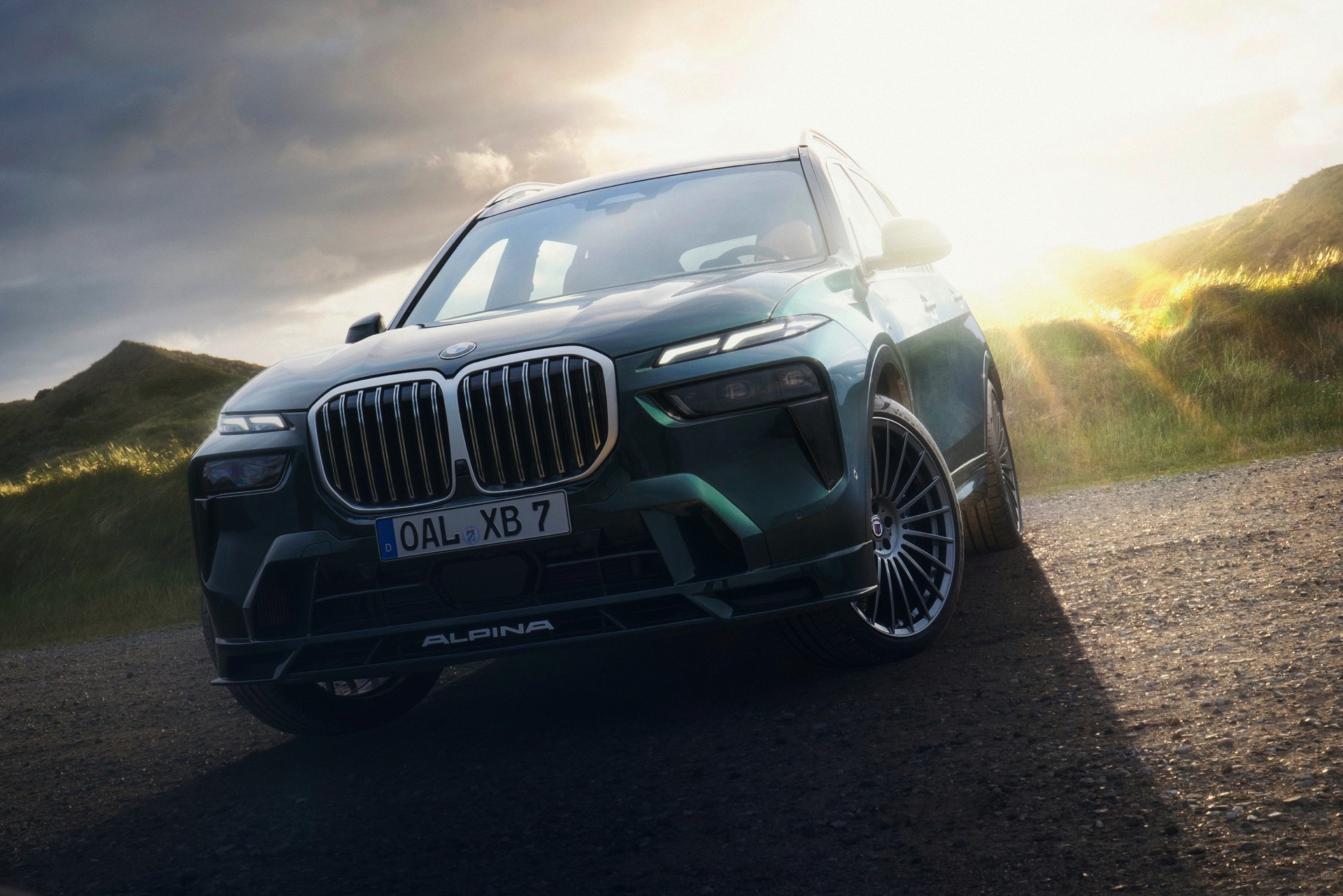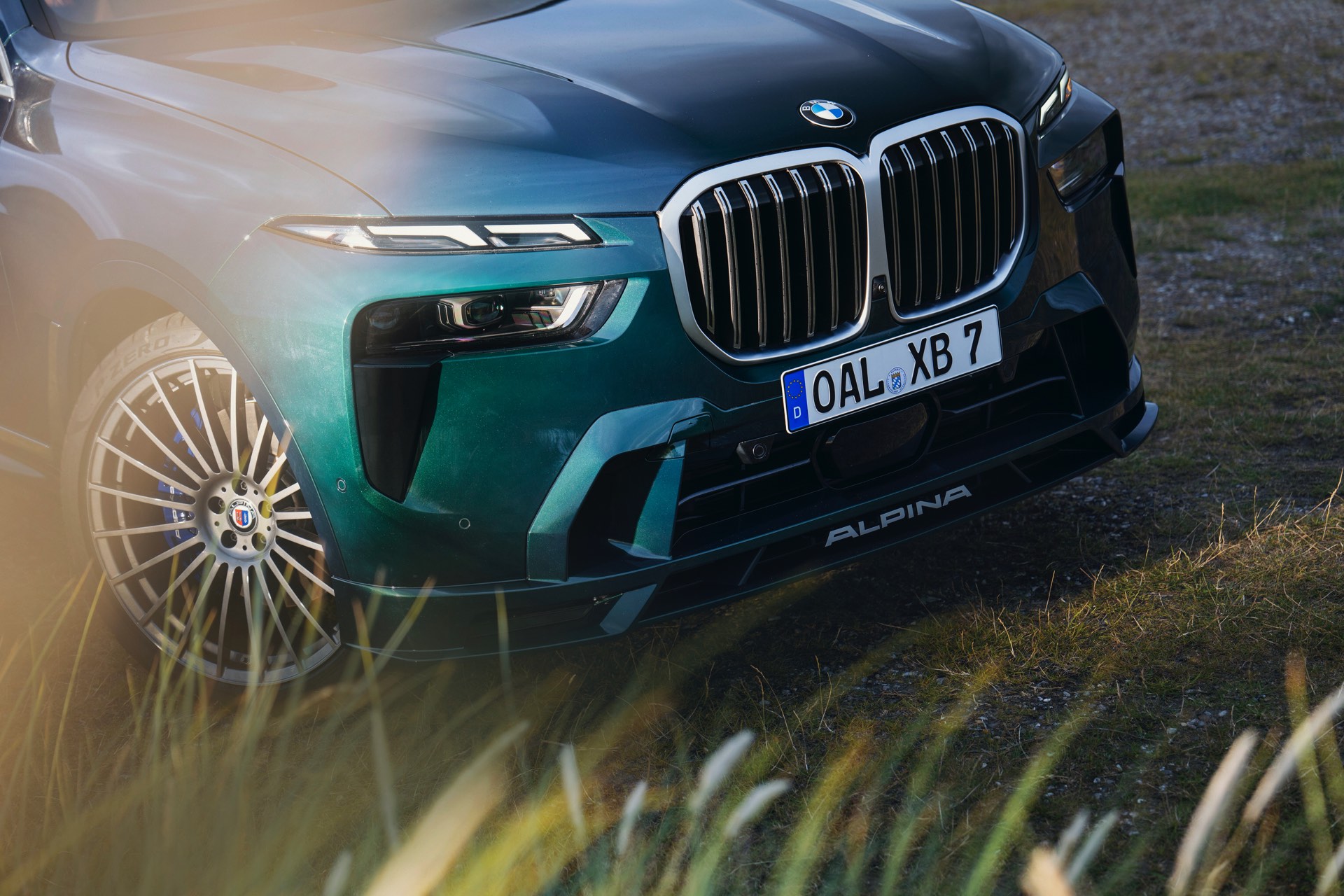 In Szene gesetzt wird das BMW Alpina XB7 Facelift 2022 in einer Serie neuer Fotos und in einem Video, das Alpina auf dem hauseigenen Youtube-Kanal veröffentlicht hat. Wie schon auf den ersten Bildern glänzt das SUV auch dieses Mal in kräftigem Alpina Grün II, einer mit 3.400 Euro Aufpreis verbundenen Sonderlackierung. Alternativ stehen natürlich auch Alpina Blau und eine Vielzahl von bekannten BMW-Farben zur Wahl, eine weitere Individualisierung ist durch die schwarzen Nieren der Shadow Line mit erweiterten Umfängen möglich.