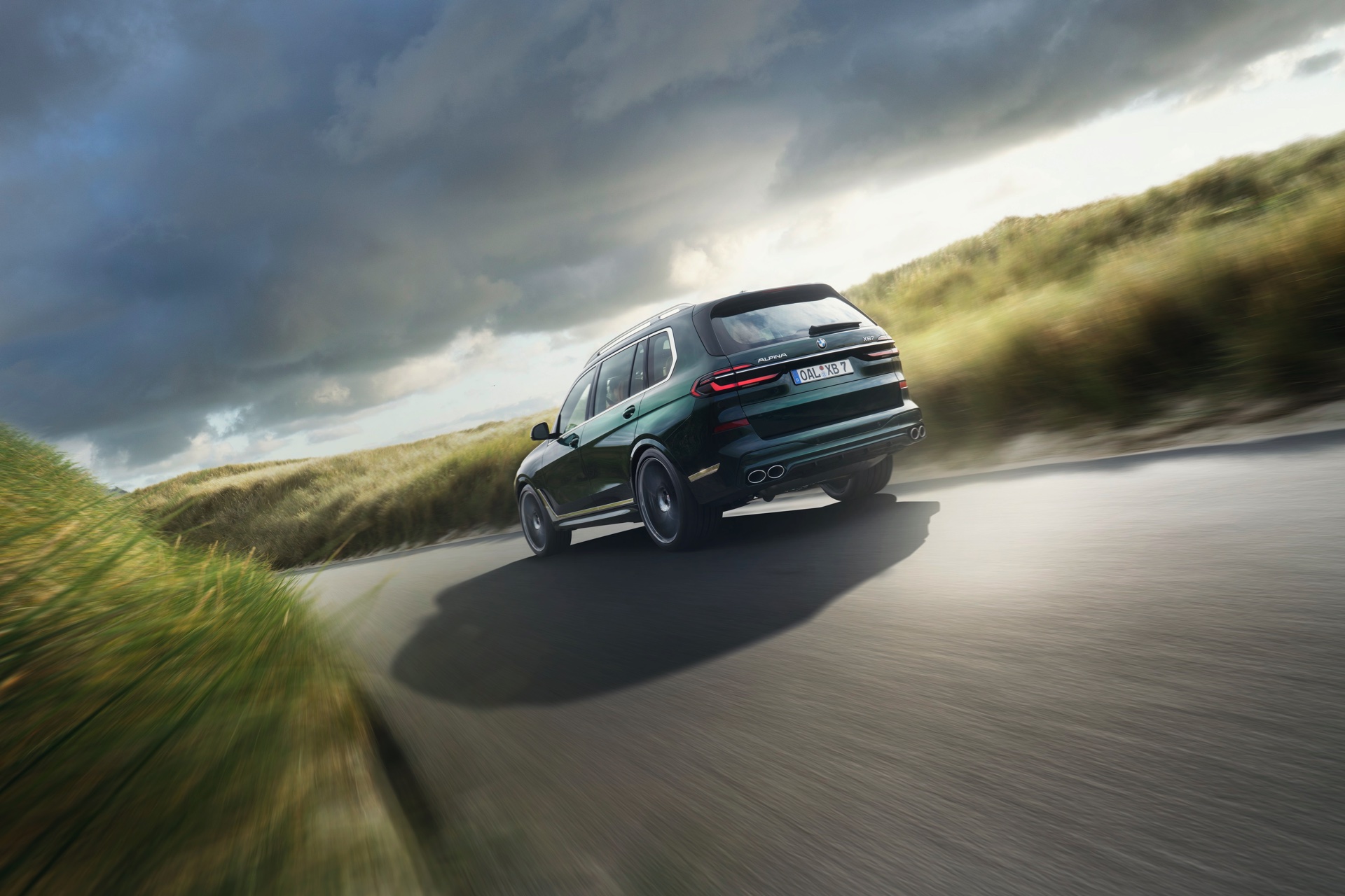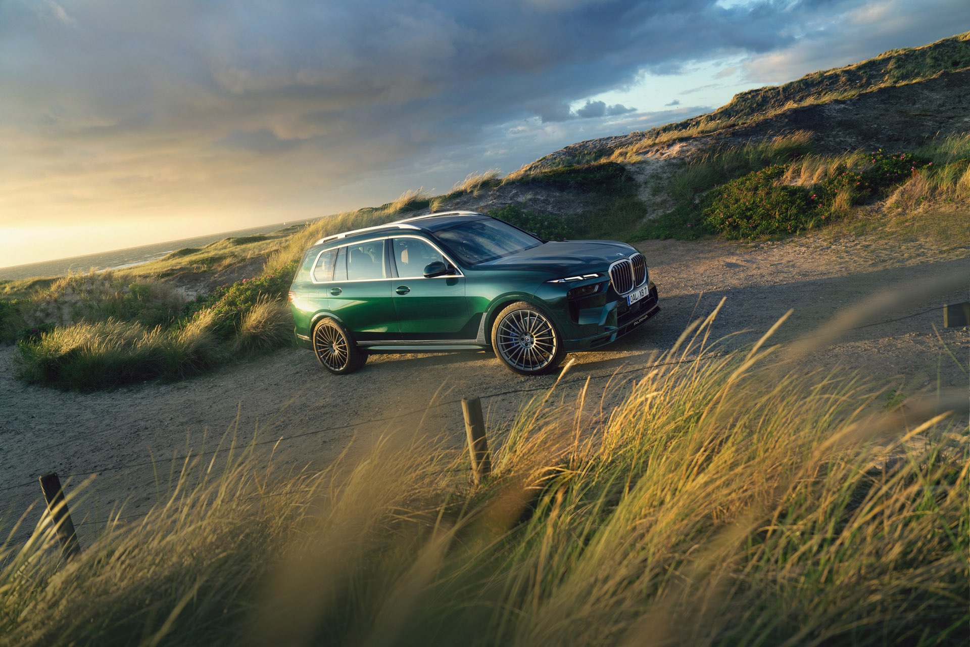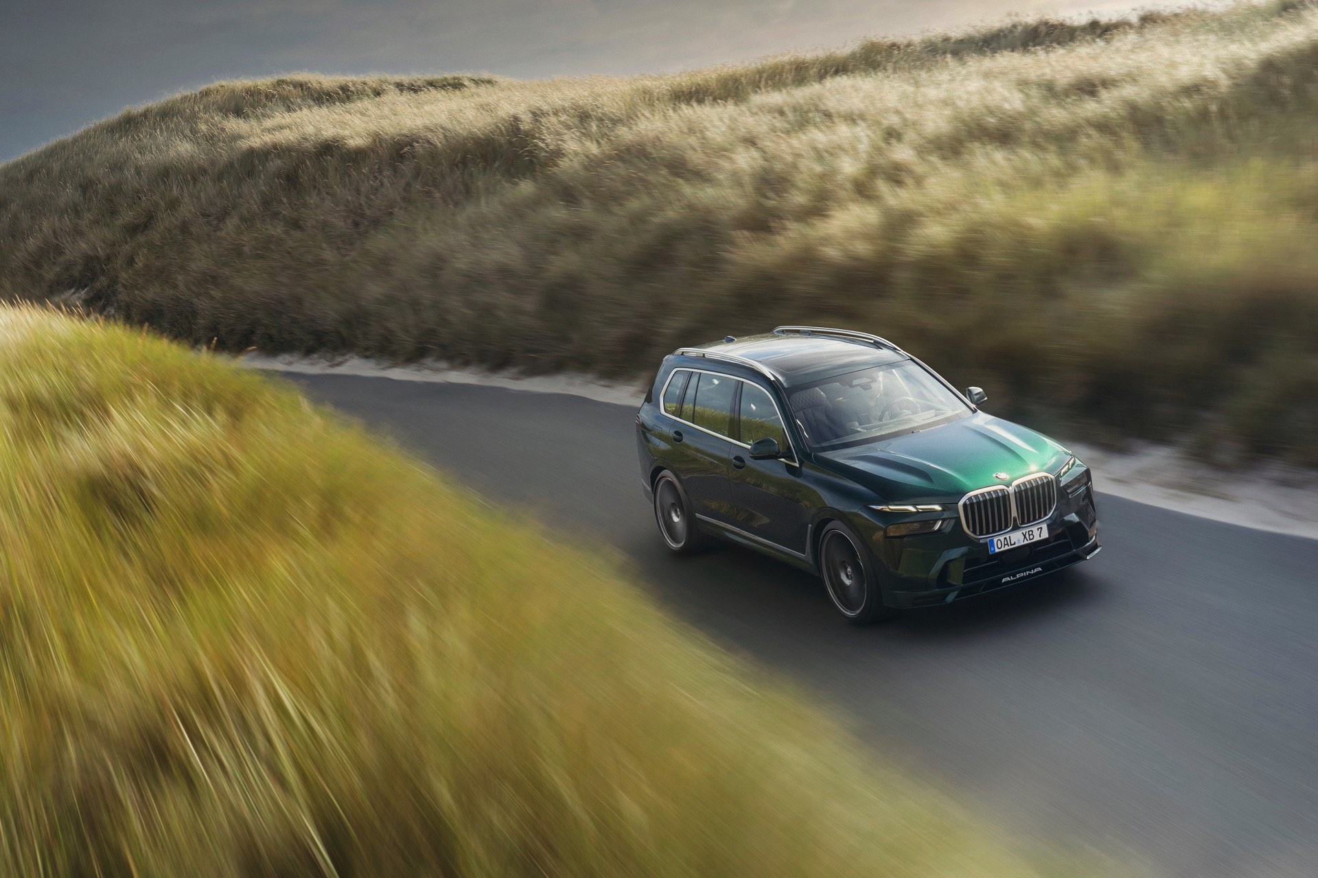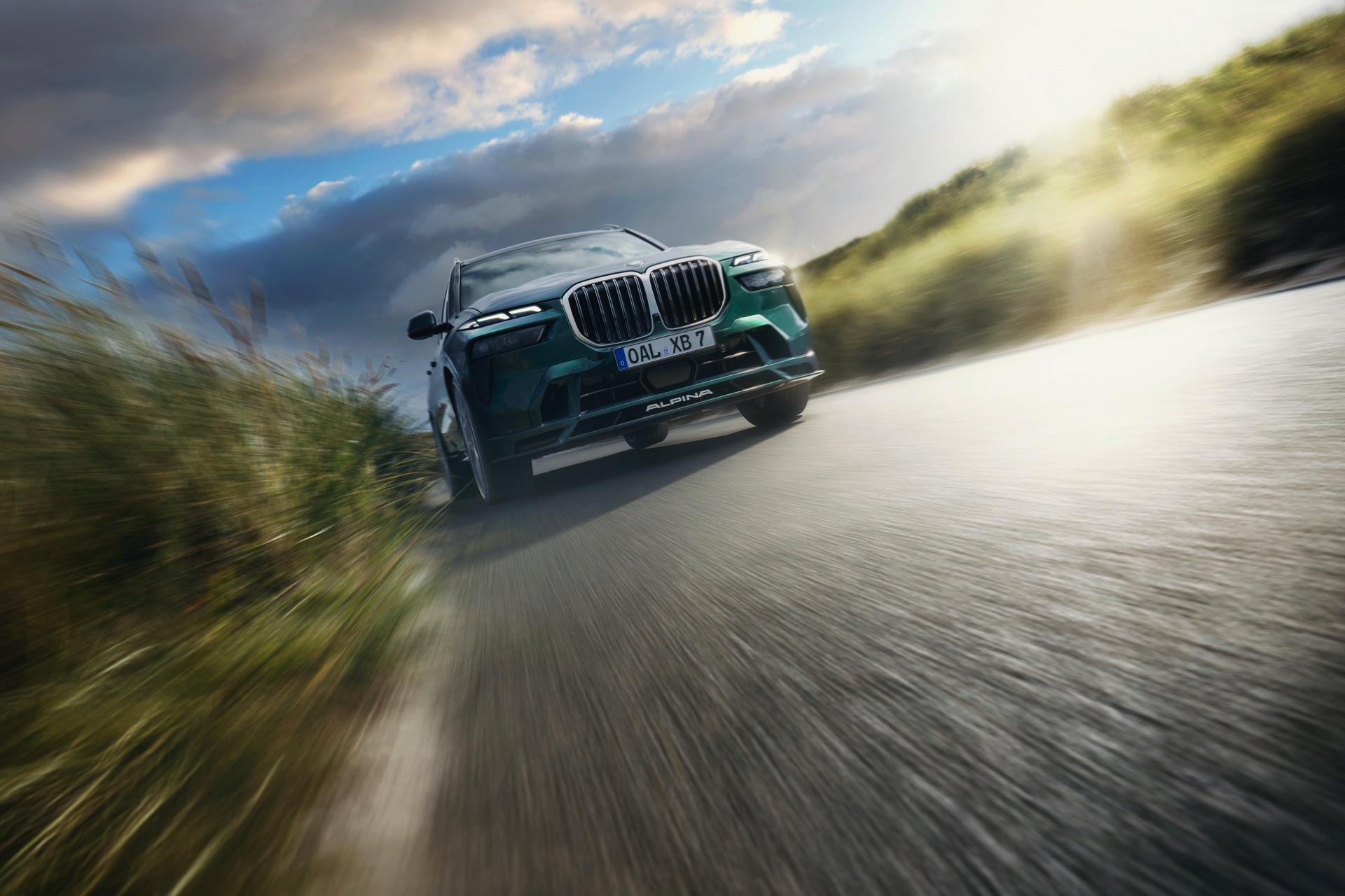 In Szene gesetzt wird das BMW Alpina XB7 Facelift 2022 in einer Serie neuer Fotos und in einem Video, das Alpina auf dem hauseigenen Youtube-Kanal veröffentlicht hat. Wie schon auf den ersten Bildern glänzt das SUV auch dieses Mal in kräftigem Alpina Grün II, einer mit 3.400 Euro Aufpreis verbundenen Sonderlackierung. Alternativ stehen natürlich auch Alpina Blau und eine Vielzahl von bekannten BMW-Farben zur Wahl, eine weitere Individualisierung ist durch die schwarzen Nieren der Shadow Line mit erweiterten Umfängen möglich.