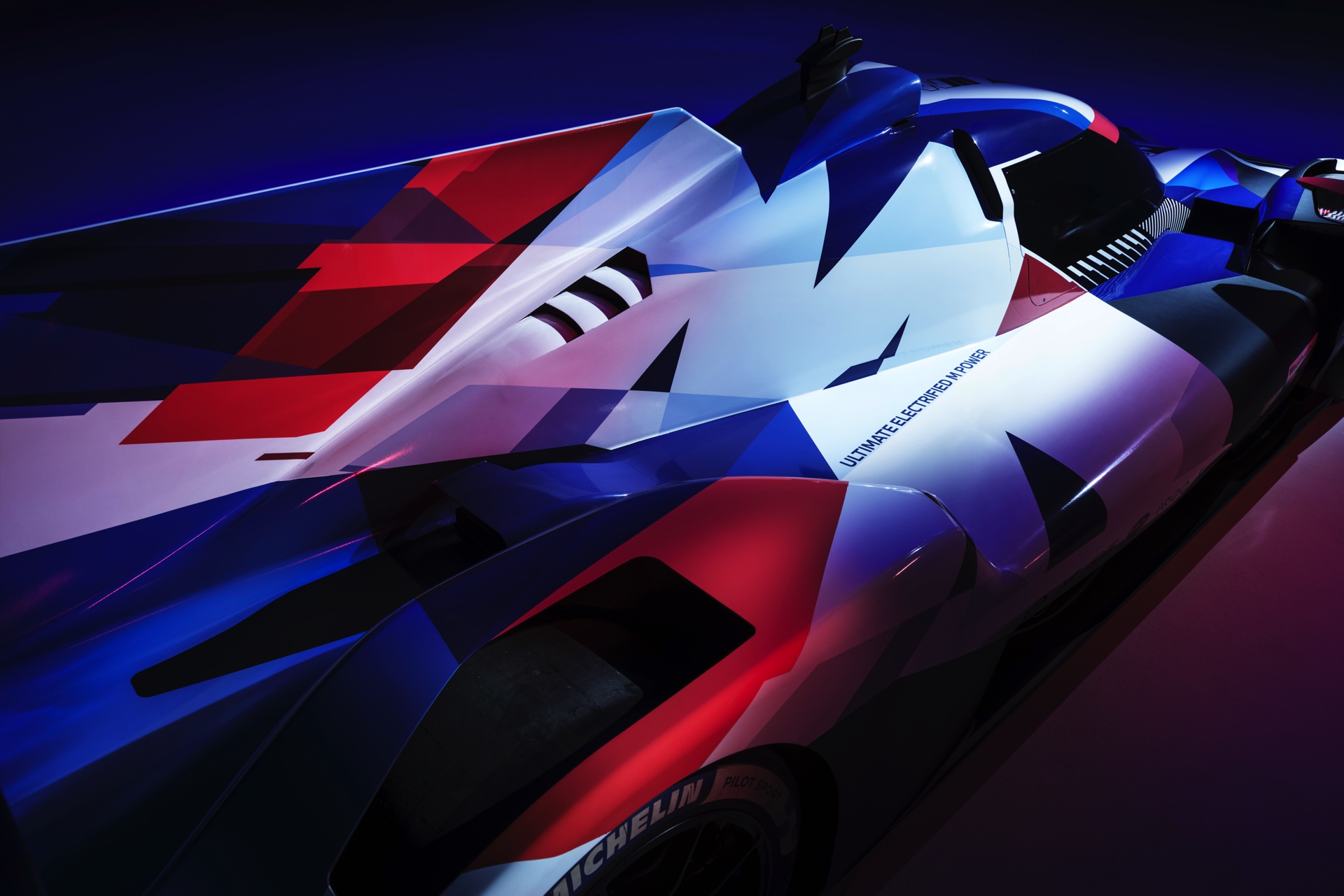 Michael Scully (Projektleiter LMDh bei BMW Group Designworks): “Diese Elemente [des M-Logos] wurden dekonstruiert und bilden auf den ersten Blick eine scheinbar abstrakte Dreiecksform auf dem BMW M Hybrid V8, doch wenn man direkt von der Seite schaut, fügt sich das M Logo genau zusammen – M reconstructed, wenn man so will.”