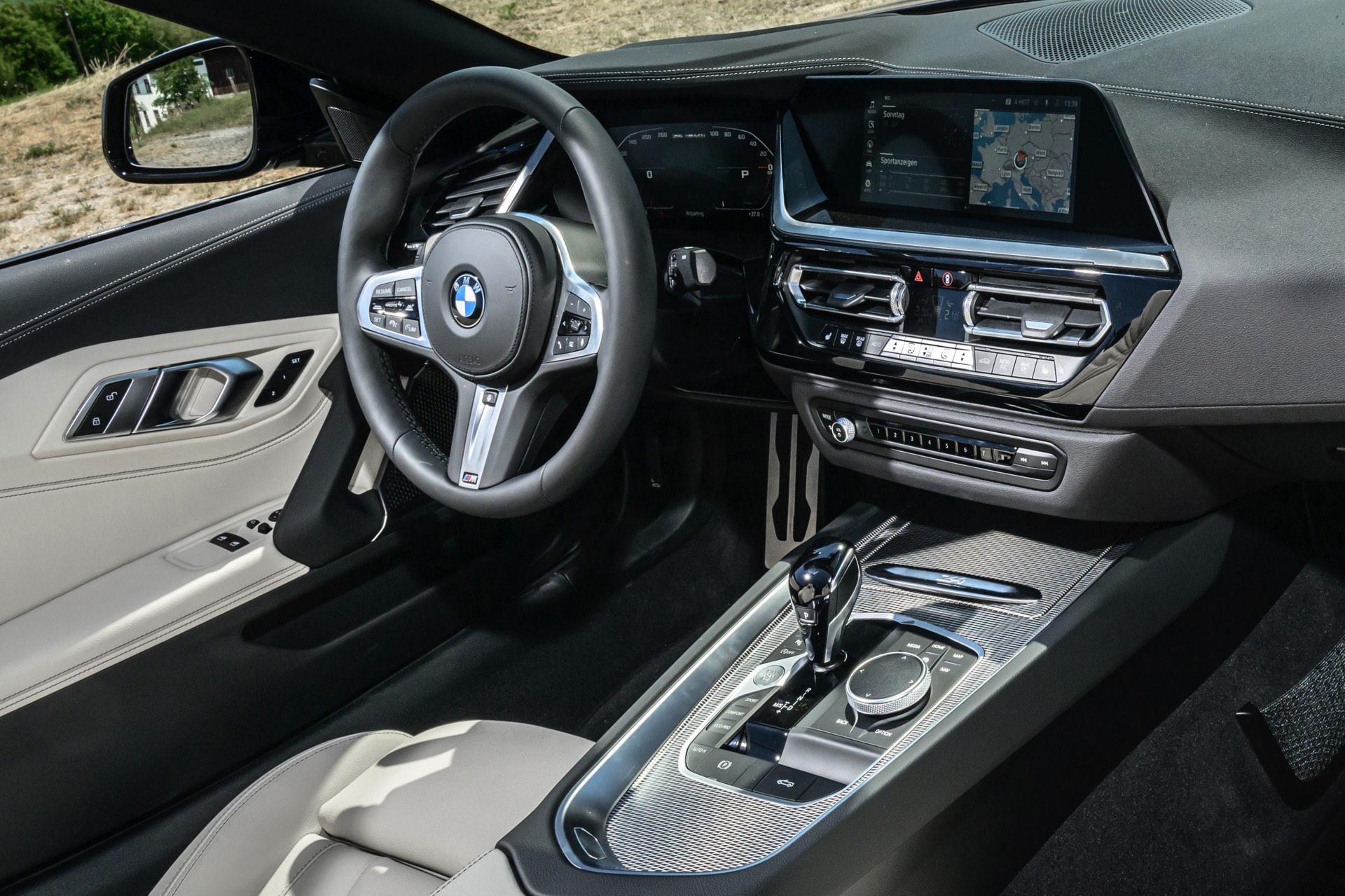 Das Cockpit des BMW Z4 Facelift (G29 LCI) präsentiert sich abgesehen von einer umfassenderen Serienausstattung praktisch unverändert: Wie erwartet verzichten die Münchner bei ihrem Fahrspaß-Roadster auf die Integration der jüngsten Design-Änderungen. So erhält der Z4 weder das inzwischen in vielen anderen Baureihen erhältliche Curved Display noch iDrive 8 oder die Schaltwippe, die zuletzt im 3er Facelift den bisherigen Automatik-Wählhebel ersetzt hat.