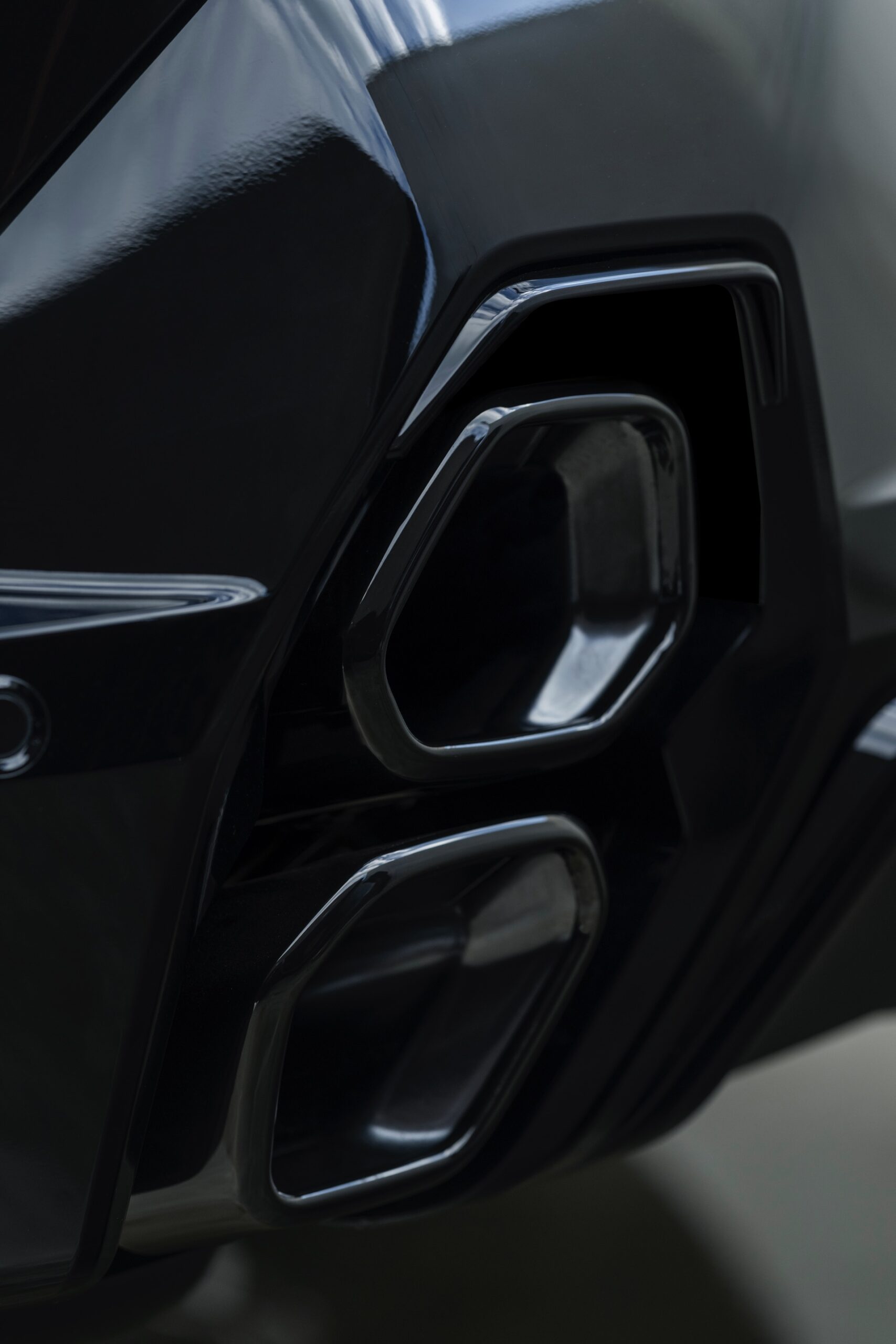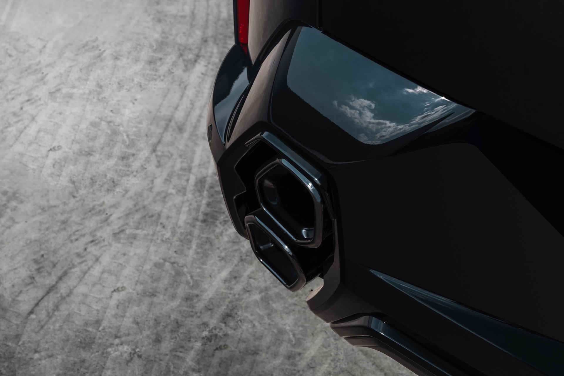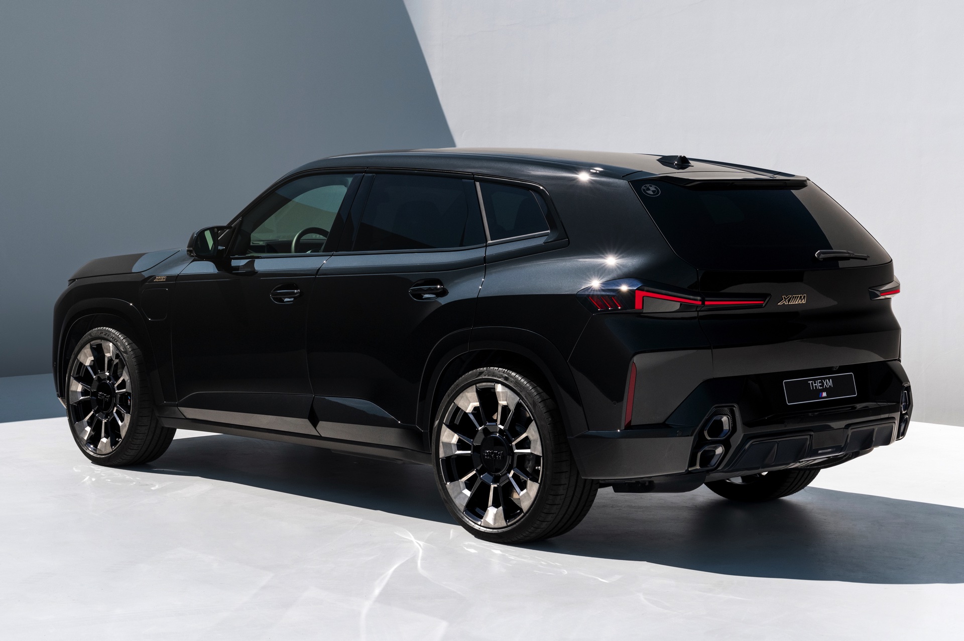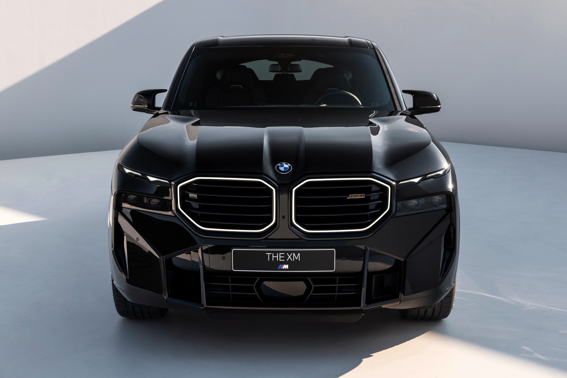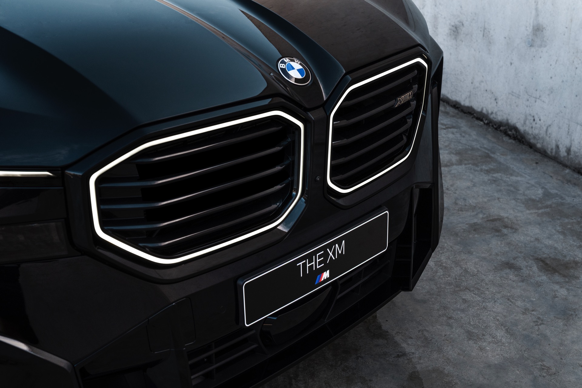 Darf es noch ein bisschen dunkler sein? Als dunkle Alternative zur Launch-Farbe Cape York Green sehen wir den neuen BMW XM auf einigen weiteren Fotos auch ganz in Schwarz: Das Power-SUV mit M Plug-in-Hybrid-Antrieb trägt nicht nur eine schwarze Lackierung, dank der Shadow Line mit erweiterten Umfängen sorgen nur noch die Leuchten, das XM-Badge am Heck und die Felgen für farbige Akzente. Der beinahe vollständige Verzicht auf die goldenen Exterieur-Akzente macht den XM zu einem ausgesprochen düsteren Anblick, wobei vor allem der äußere Rahmen der beleuchteten Nieren und auch die Diffusor-Einfassungen am Heck in Hochglanz-Schwarz hervorstechen.