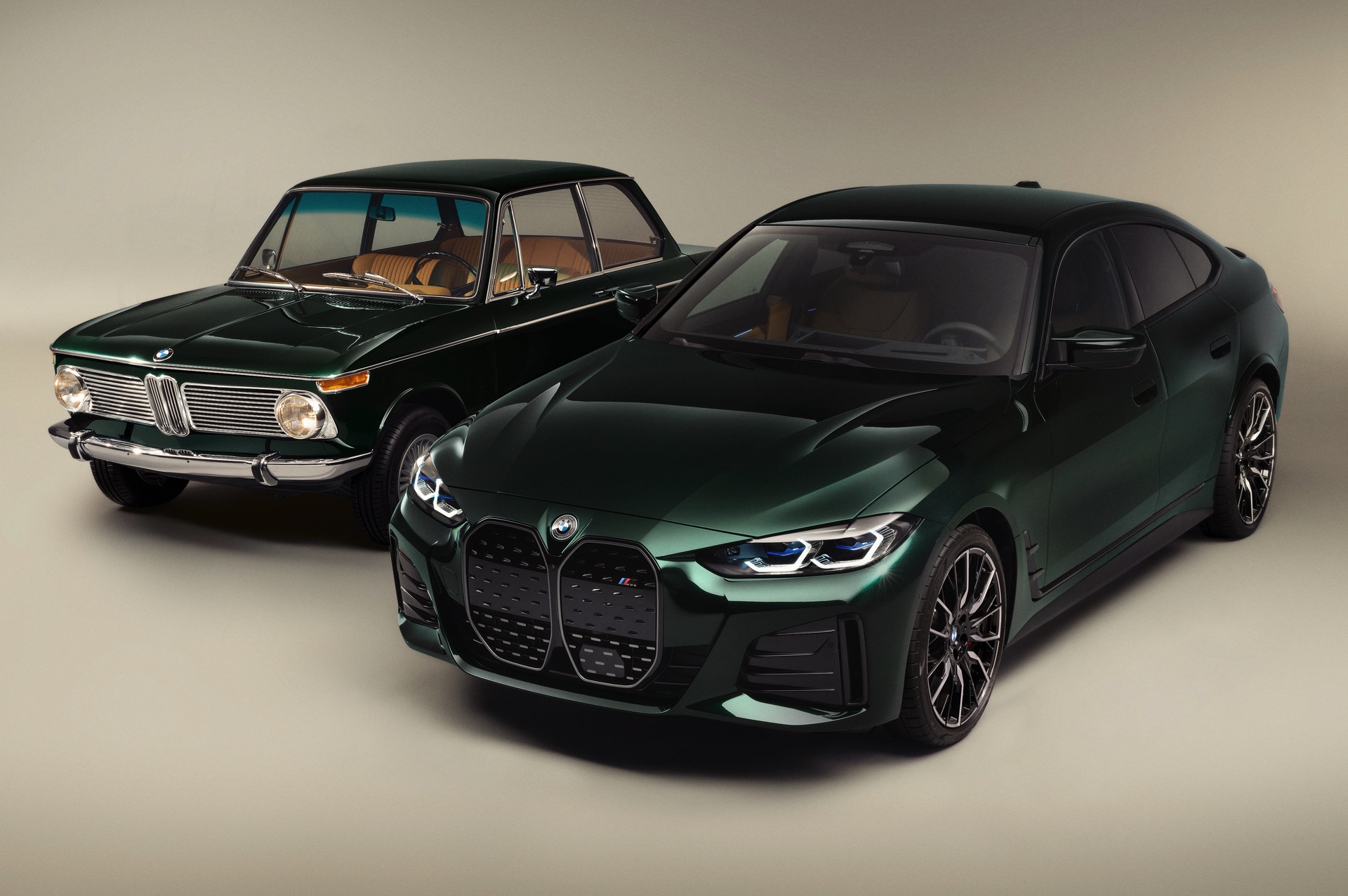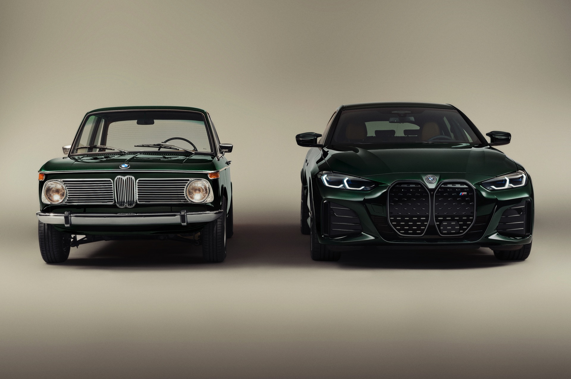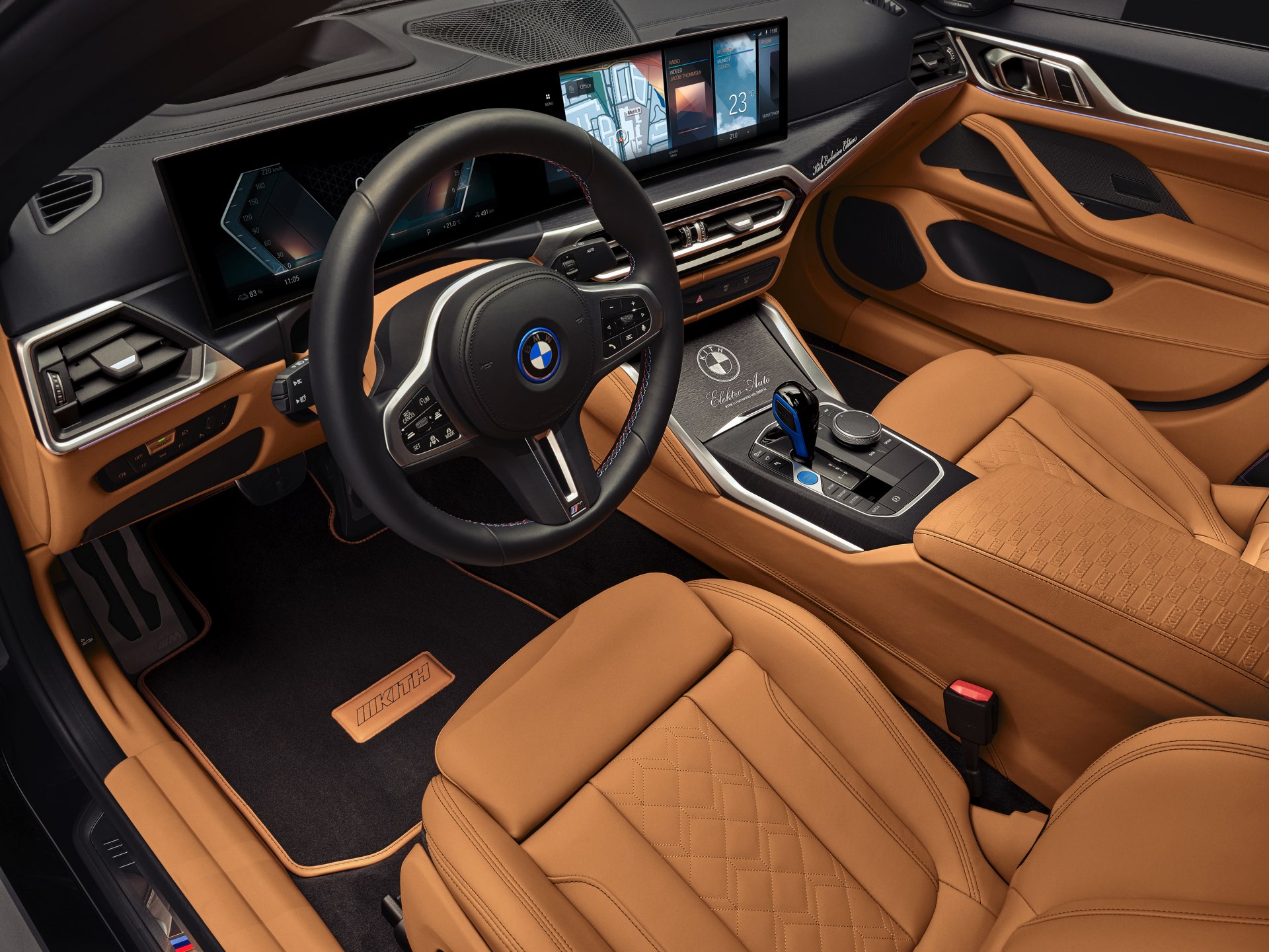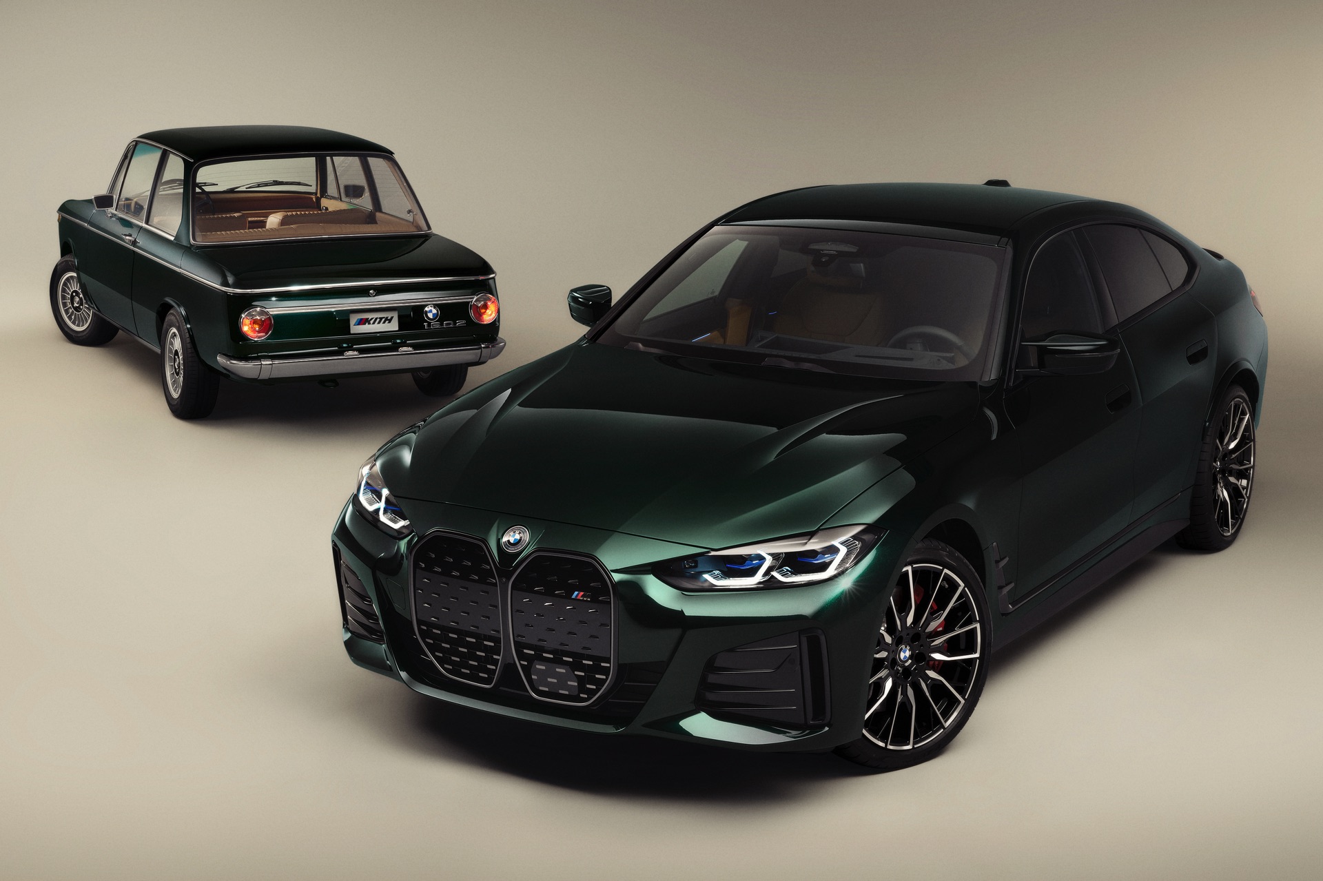 Schon vor 50 Jahren zeigte der BMW 1602 Elektro der Welt, wie ein Elektroauto in der Mittelklasse aussehen kann. Kith vereint den Urahn aller Elektro-BMW nun mit dem aktuellen i4 M50 und zeigt mit seinem jüngsten Projekt, dass es durchaus Gemeinsamkeiten gibt – darunter die Nieren, die in beiden Fällen aufrecht stehen und wesentlich höher als breit sind. Da beide Fahrzeuge im exklusiven Farbton Vitality Green lackiert sind, besteht an der Zusammengehörigkeit beider Modelle schon auf den ersten Blick kein Zweifel. Beim zweiten Blick wird klar, dass auch der Innenraum beider Fahrzeuge ganz ähnlich gestaltet ist, denn hier wie da lädt eine Merino-Lederausstattung im BMW Individual-Farbton Caramel zum Einsteigen ein.