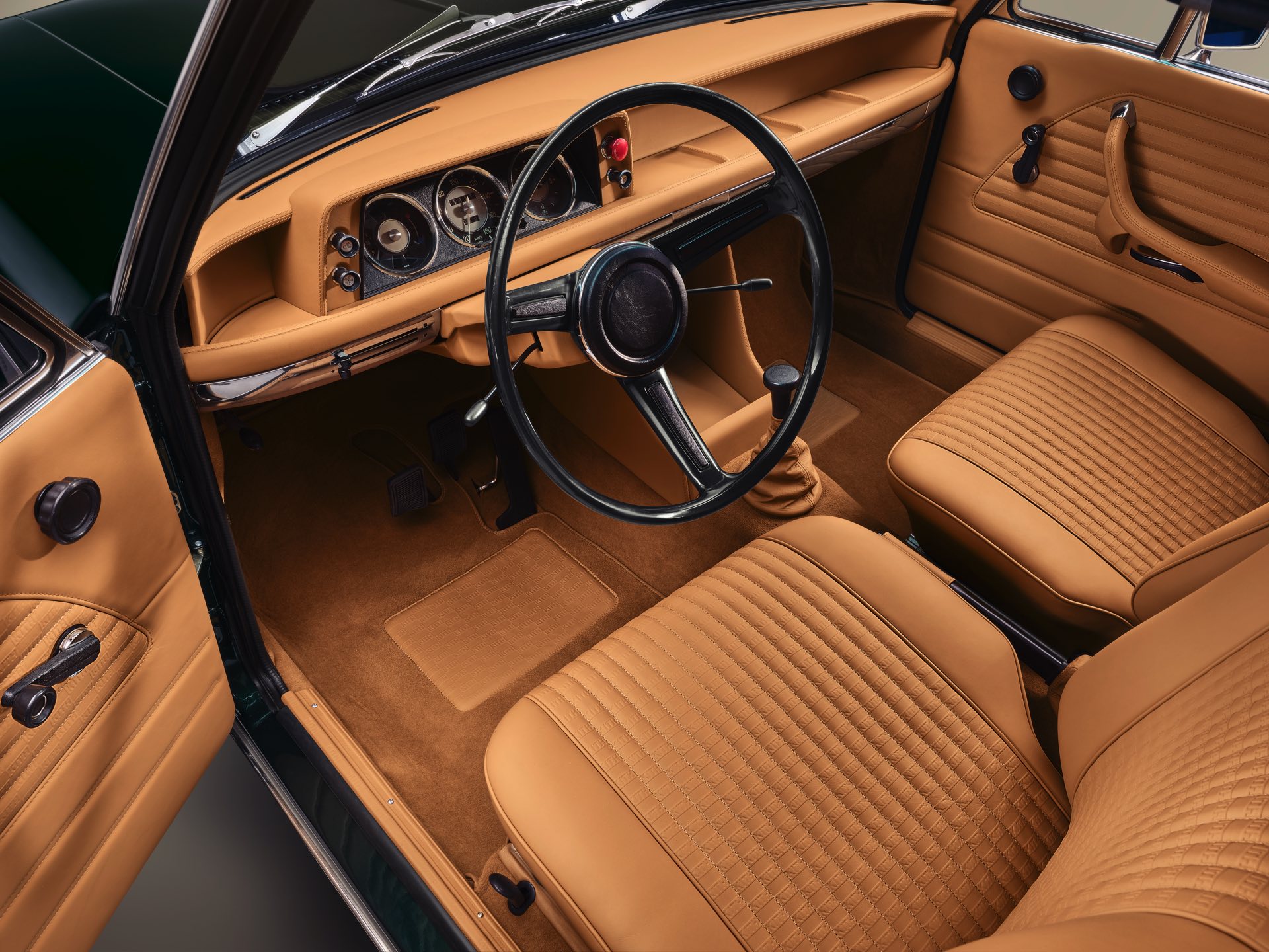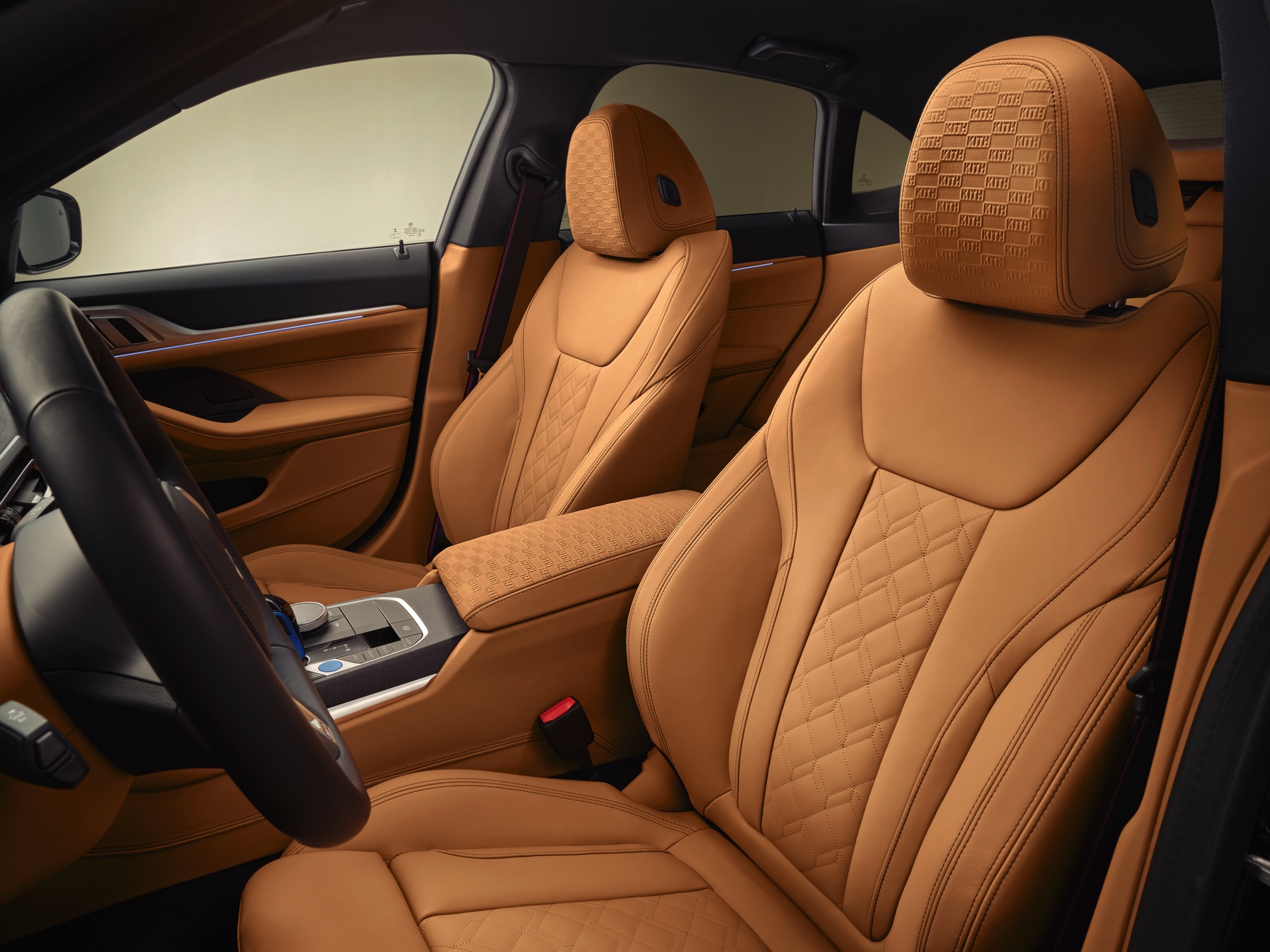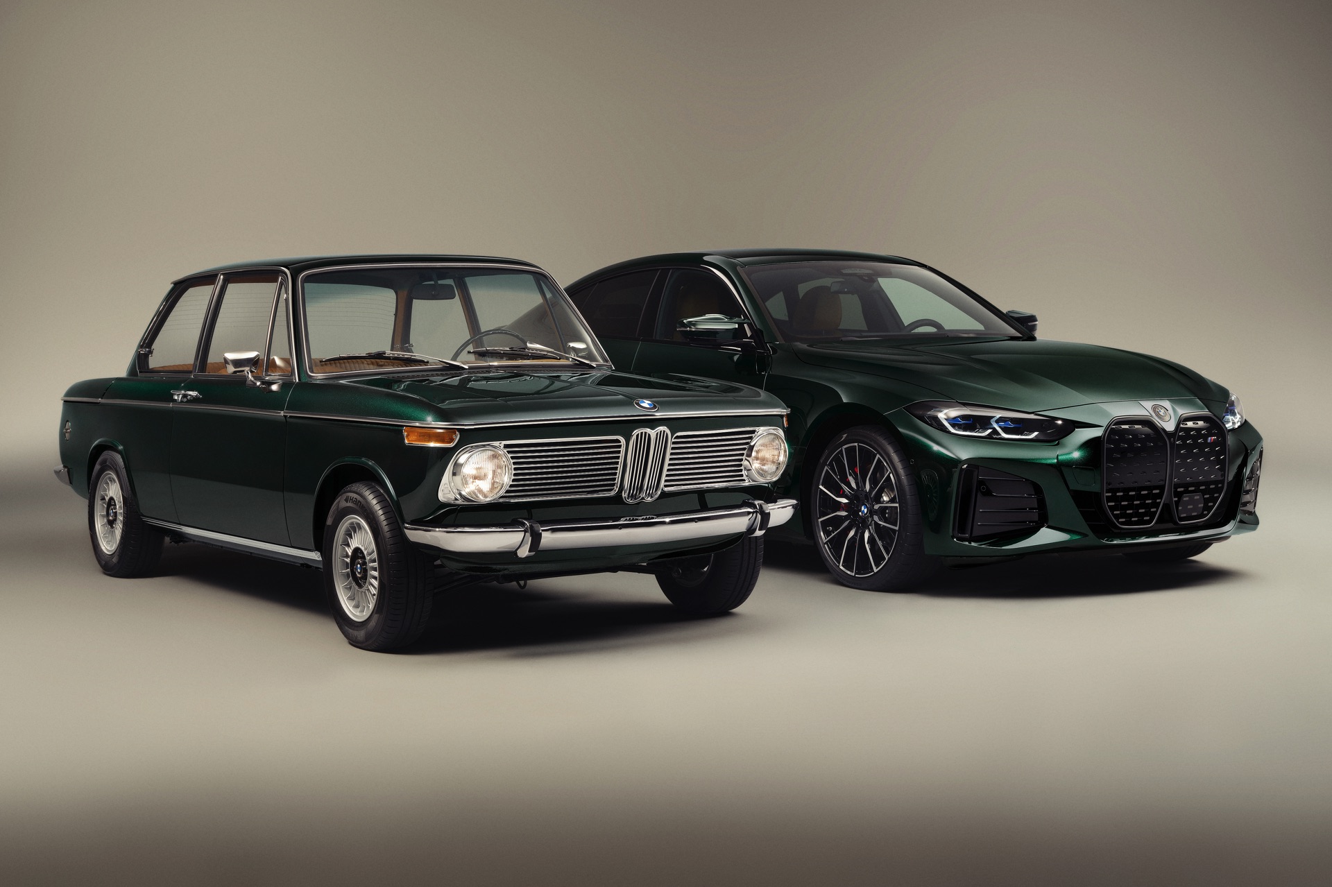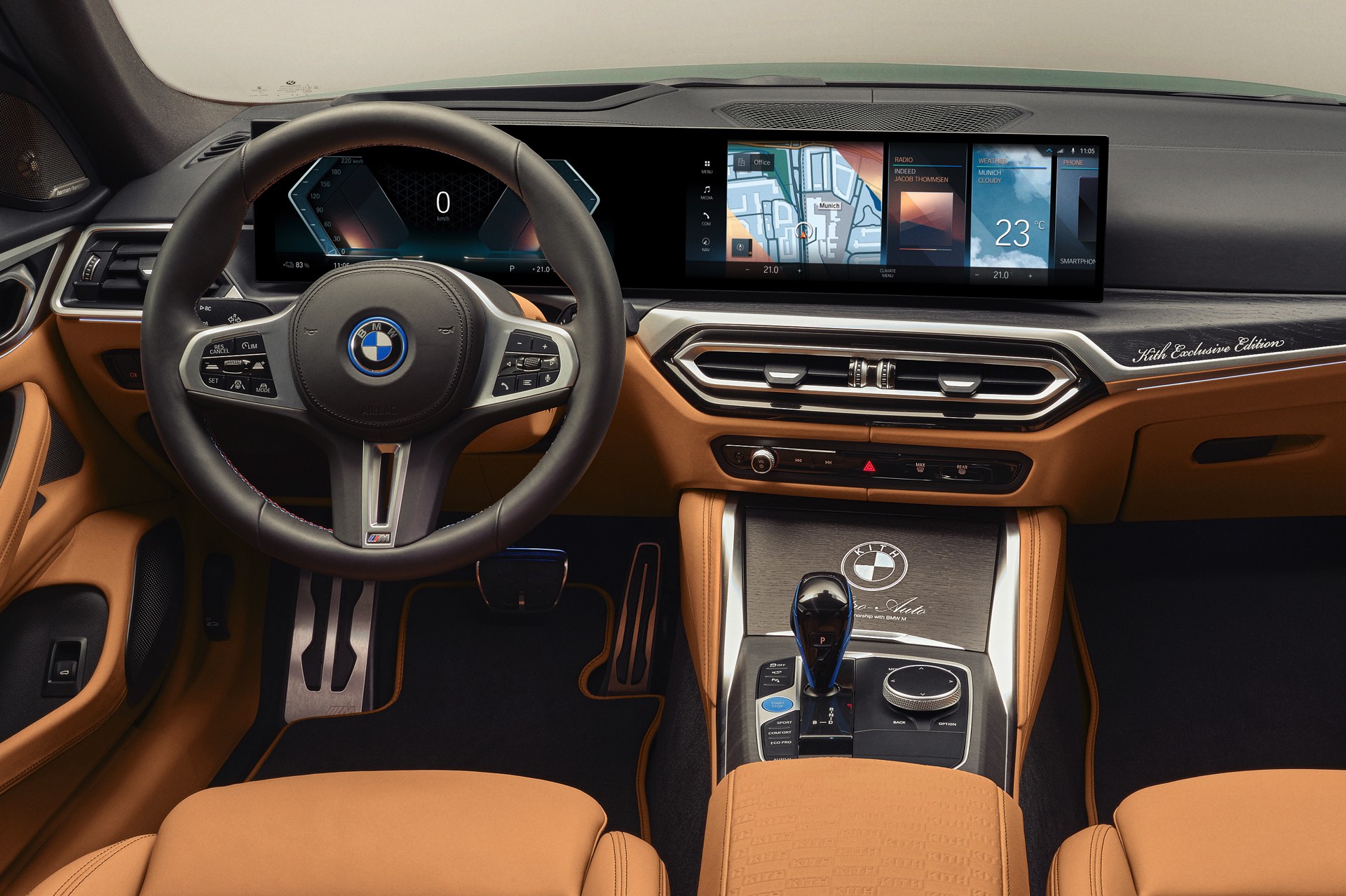 Schon vor 50 Jahren zeigte der BMW 1602 Elektro der Welt, wie ein Elektroauto in der Mittelklasse aussehen kann. Kith vereint den Urahn aller Elektro-BMW nun mit dem aktuellen i4 M50 und zeigt mit seinem jüngsten Projekt, dass es durchaus Gemeinsamkeiten gibt – darunter die Nieren, die in beiden Fällen aufrecht stehen und wesentlich höher als breit sind. Da beide Fahrzeuge im exklusiven Farbton Vitality Green lackiert sind, besteht an der Zusammengehörigkeit beider Modelle schon auf den ersten Blick kein Zweifel. Beim zweiten Blick wird klar, dass auch der Innenraum beider Fahrzeuge ganz ähnlich gestaltet ist, denn hier wie da lädt eine Merino-Lederausstattung im BMW Individual-Farbton Caramel zum Einsteigen ein.