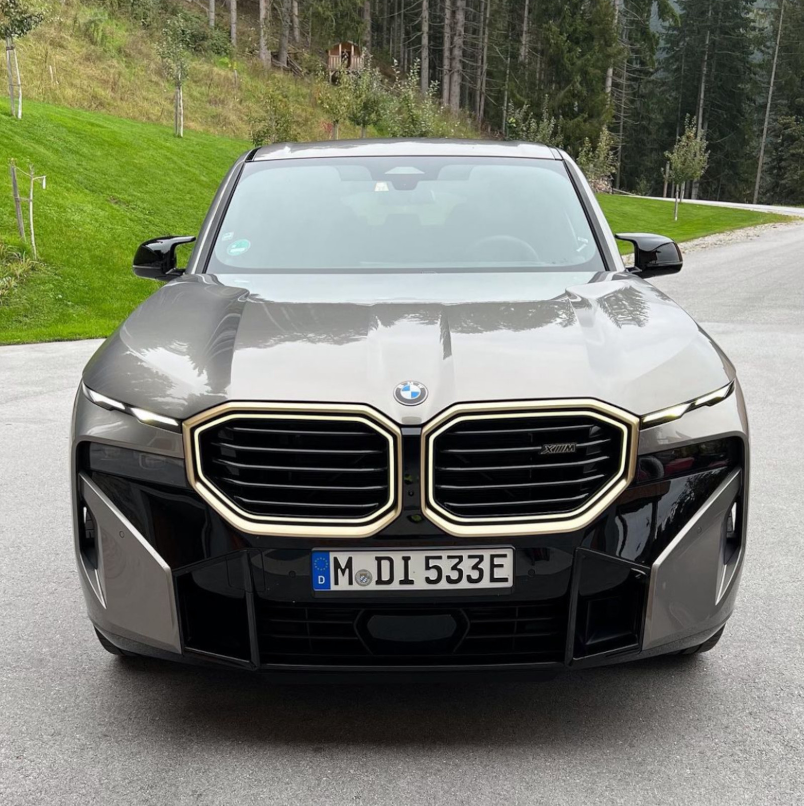 Neben seinen eigenständigen und Formen der markanten Lackierung in Oxidgrau sind es vor allem die goldenen Akzente, die den mindestens 653 PS starken BMW XM aus der automobilen Masse herausheben und zu einem absoluten Hingucker machen. Während die beleuchteten Nieren im hellen Tageslicht keine Rolle spielen und auf den Fotos von Markus Flasch auch das LED-Tagfahrlicht im oberen Teil der Split Headlights deaktiviert ist, wirkt die Front mit ihrer wuchtigen Doppelniere und großen schwarz abgesetzten Flächen ausgesprochen selbstbewusst. "