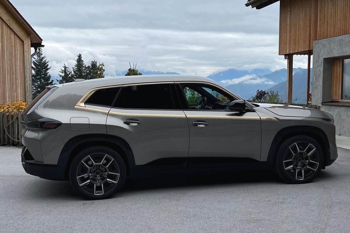 In der Seitenansicht fallen neben dem goldenen Akzentband, das als Fenster-Einfassung und Design-Merkmal gleichermaßen fungiert, vor allem die 22 Zoll großen Leichtmetallräder Doppelspeiche 922 M Bicolor ins Auge. Die Felgen sind sowohl mit Mischbereifung als auch mit ausgewiesenen Sportreifen erhältlich und ohne direkten Vergleich dürfte kaum ein Betrachter vermuten, dass man ab Werk auch noch größere Felgen erhalten könnte – im Fall des BMW XM ist das Ende der Fahnenstange aber selbst hier noch nicht erreicht: Auf Wunsch gibt es auch 23-Zöller, die sogar mit einem extrem auffälligen Finish in Nightgold bestellt werden können.