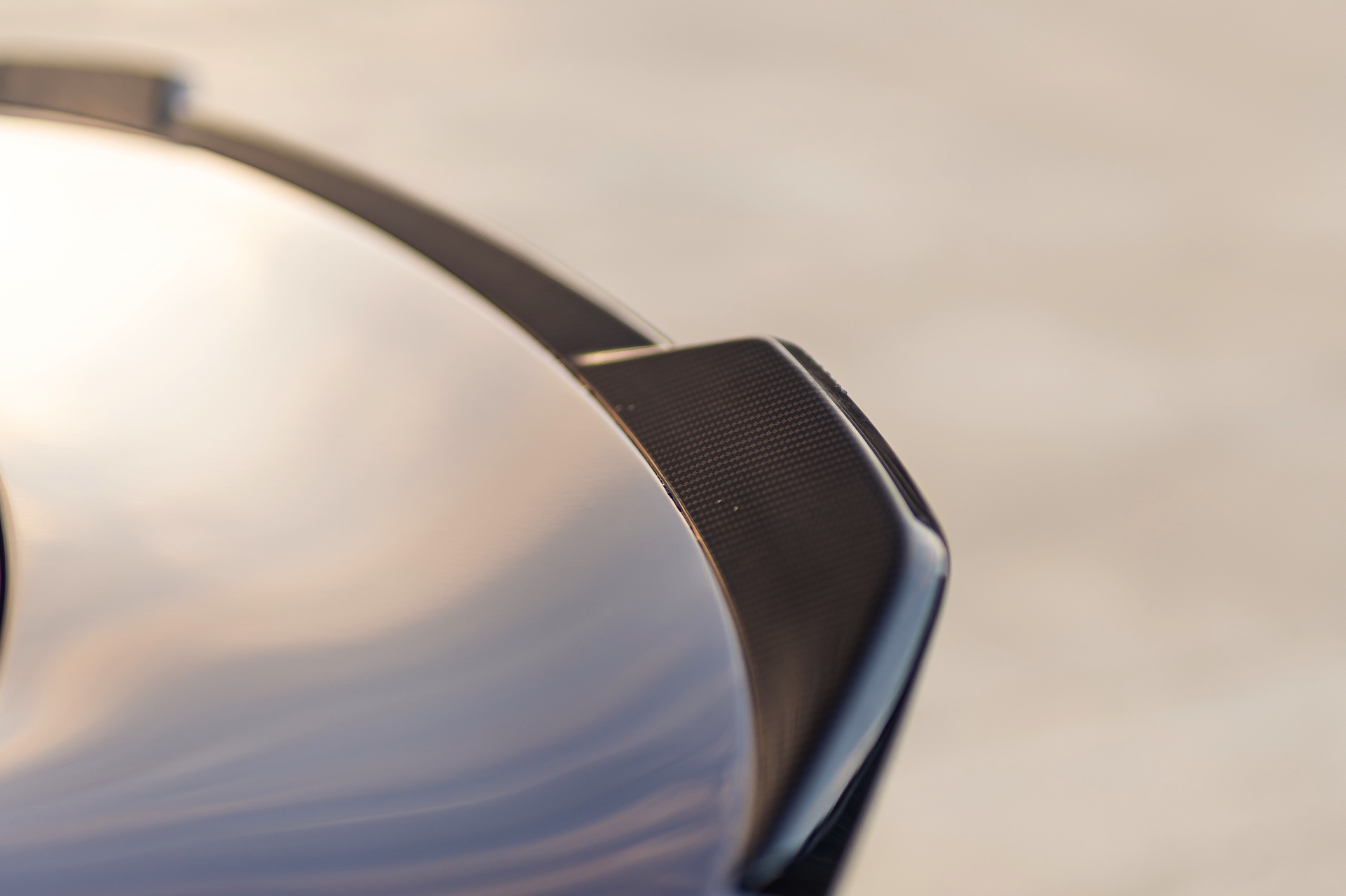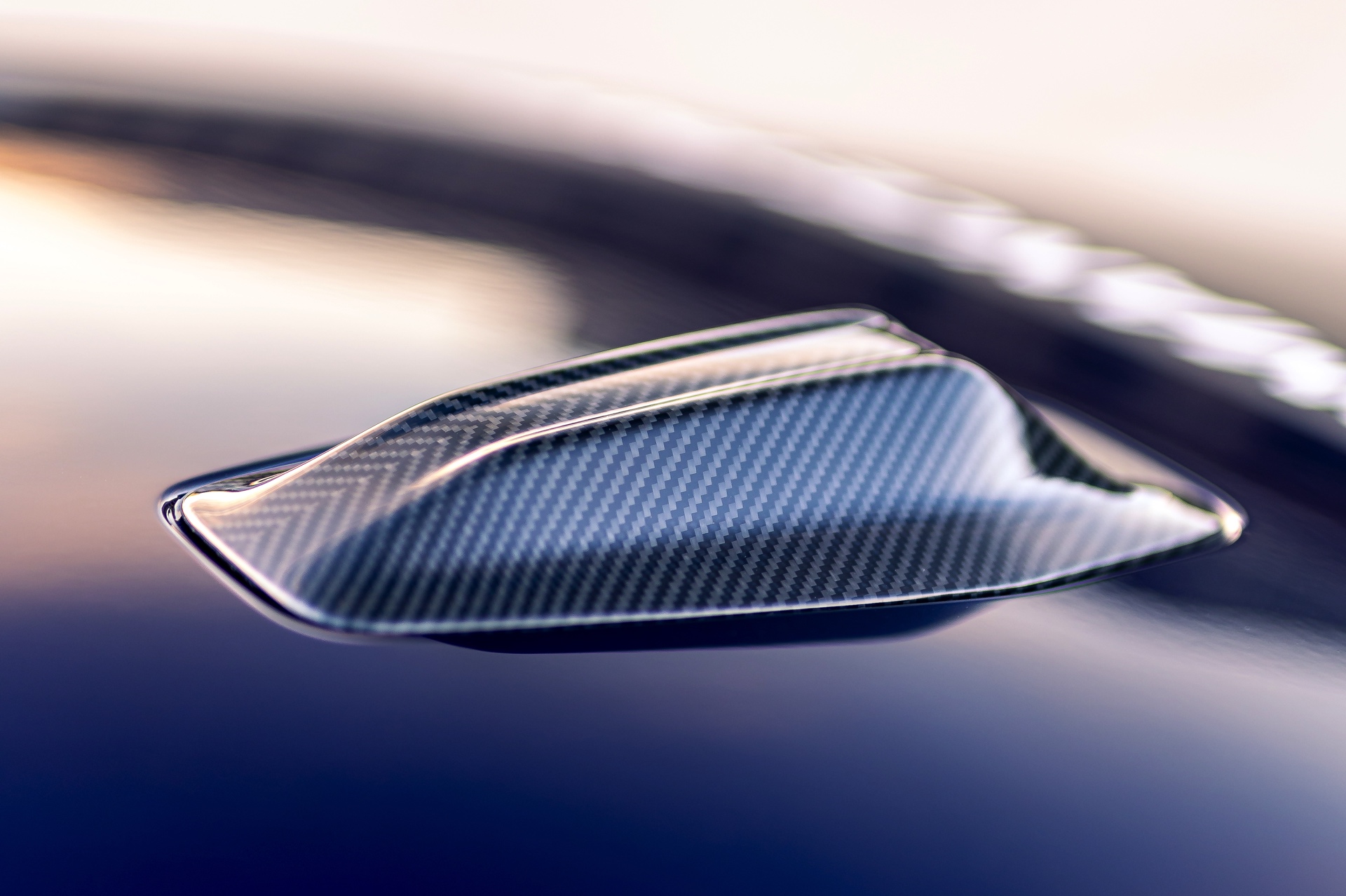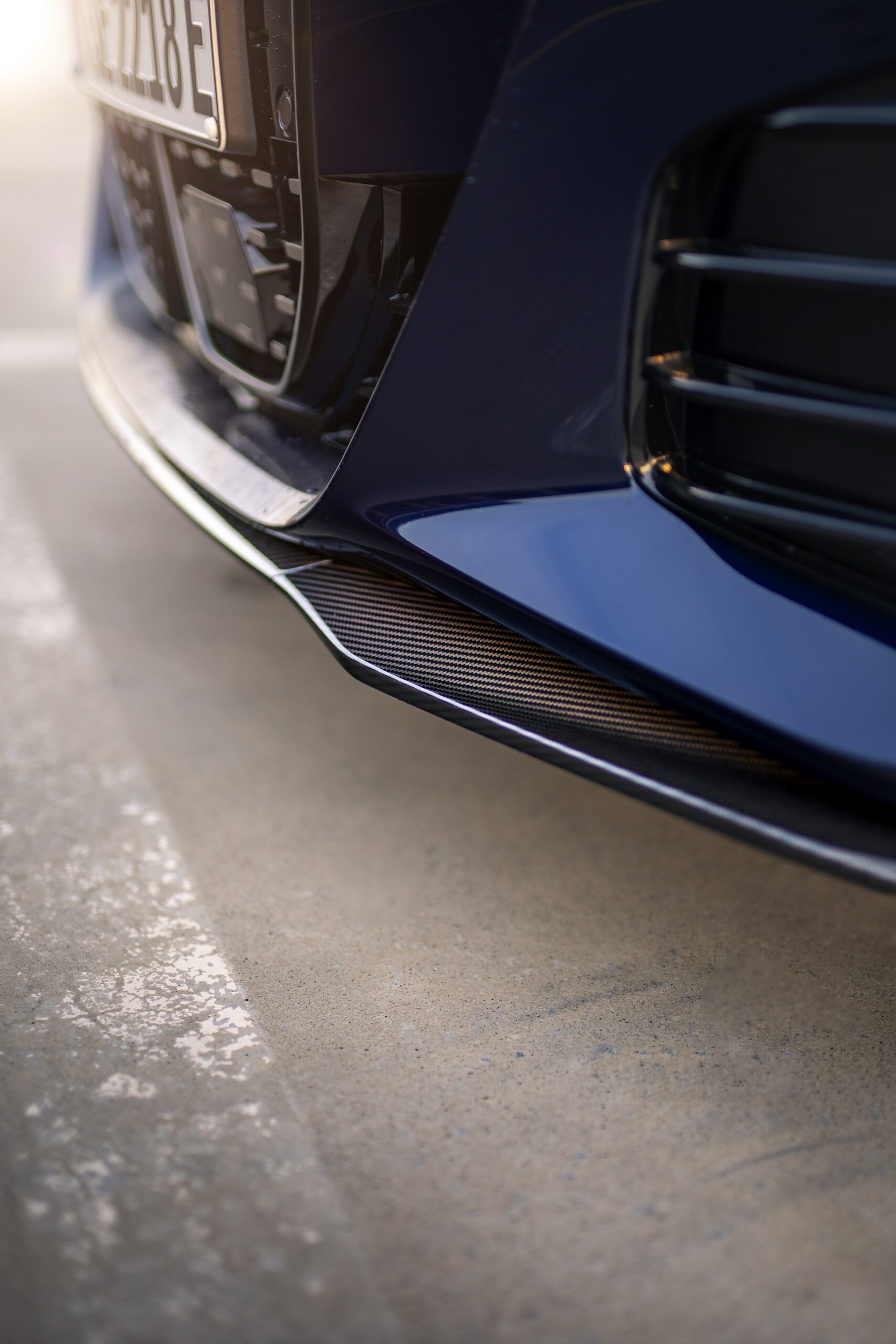 Neben den goldenen 20-Zöllern sind es vor allem die Aerodynamik-Bauteile, die Kennern sofort ins Auge fallen: Frontsplitter und Heckspoiler-Lippe aus Carbon werten die Optik deutlich auf. Noch mehr Motorsport-Flair bringen feine Details wie die Außenspiegel-Kappen aus Carbon und die Antennen-Abdeckung in Carbon-Optik. Bei letzterer kommt aufgrund der unvermeidlichen Nachteile für die Empfangs- und Sendeleistung statt echtem Carbon “nur” eine dunkel eingefärbte Aramid-Faser zum Einsatz, aber selbst bei genauerem Hinsehen ist dieser Unterschied praktisch nicht sichtbar.