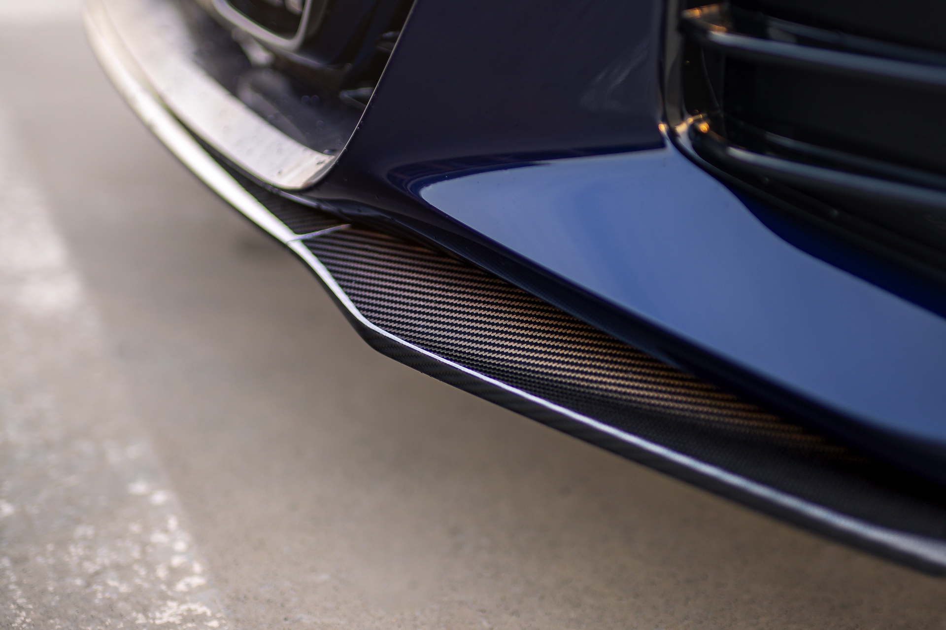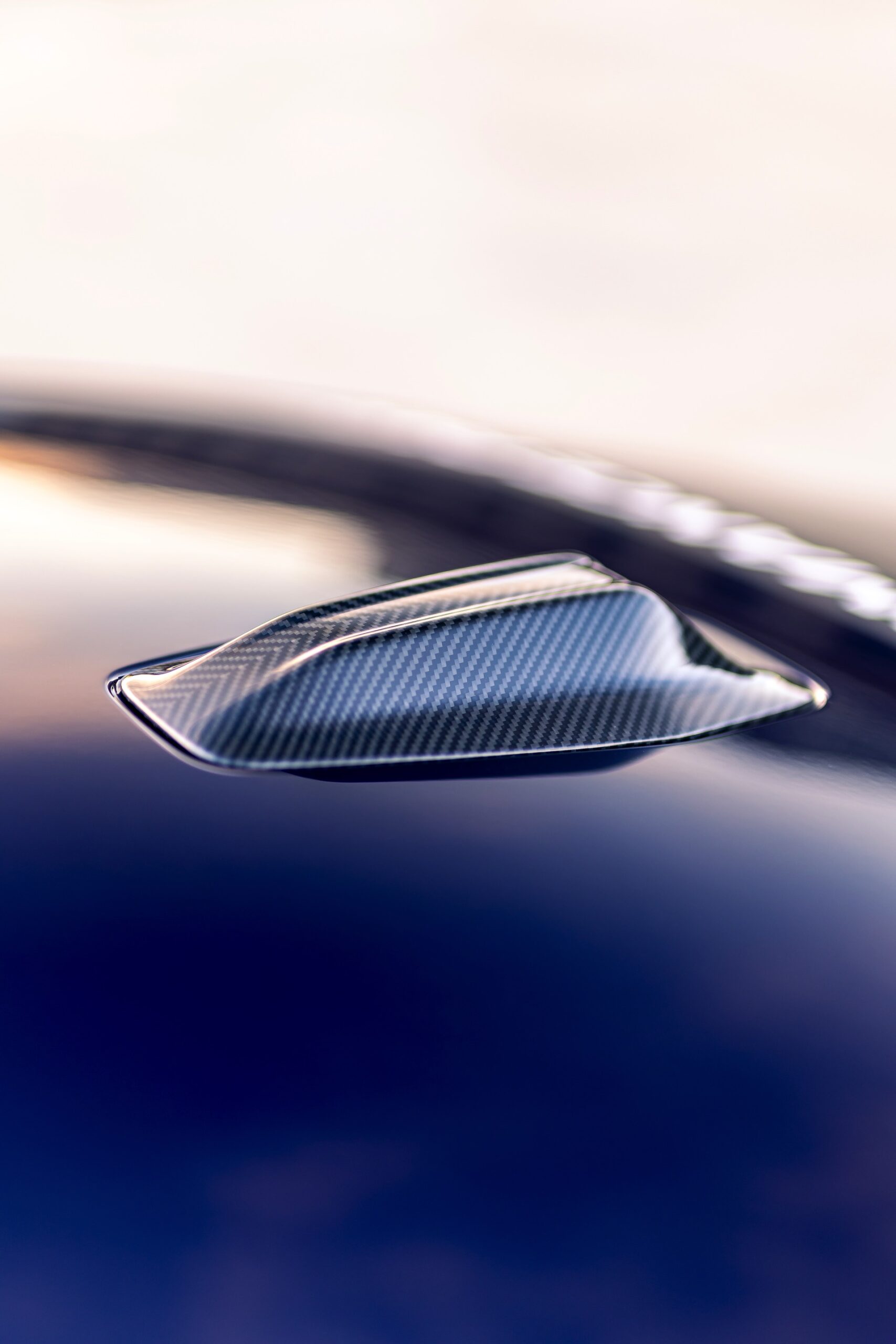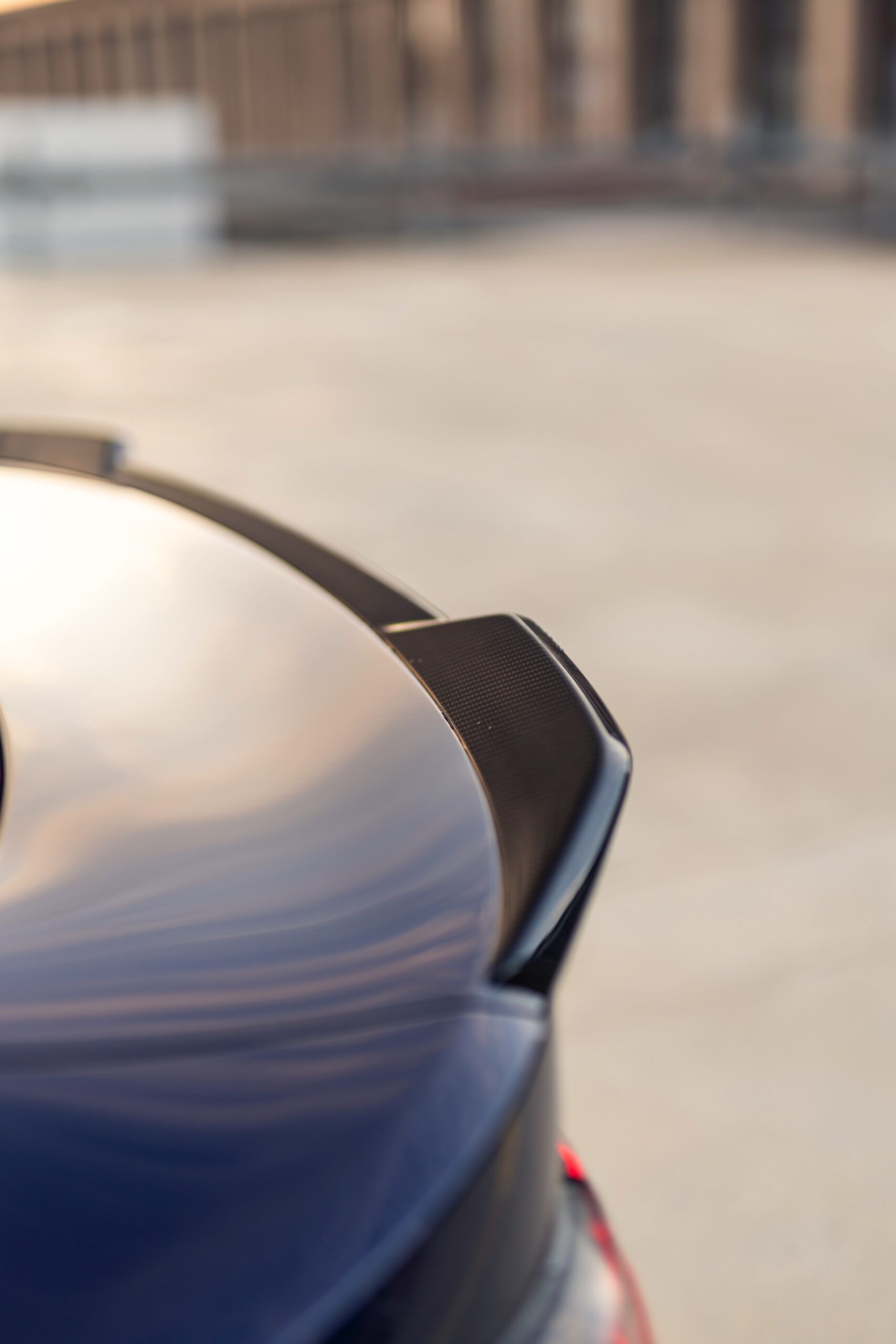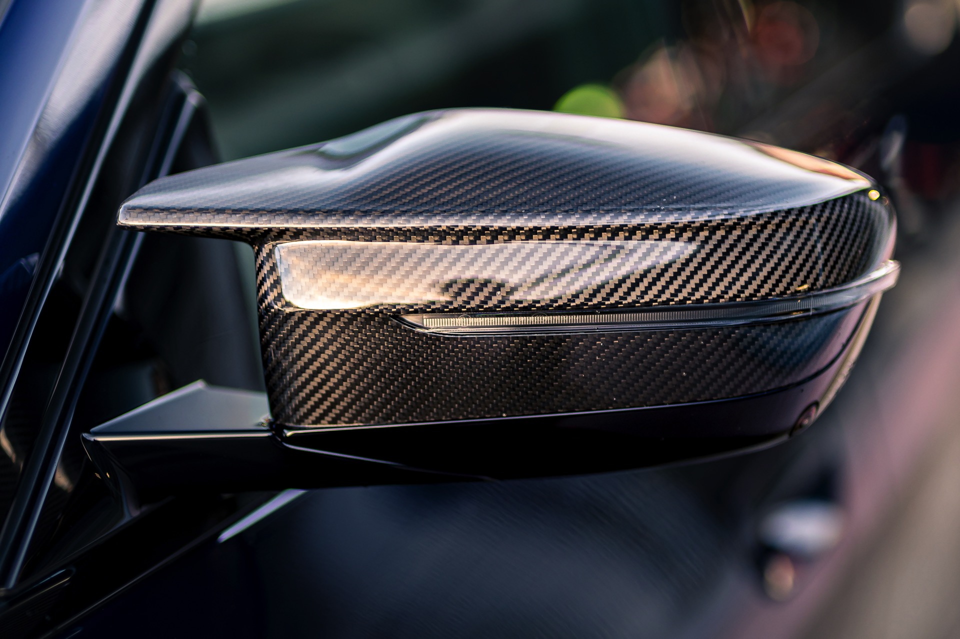 Neben den goldenen 20-Zöllern sind es vor allem die Aerodynamik-Bauteile, die Kennern sofort ins Auge fallen: Frontsplitter und Heckspoiler-Lippe aus Carbon werten die Optik deutlich auf. Noch mehr Motorsport-Flair bringen feine Details wie die Außenspiegel-Kappen aus Carbon und die Antennen-Abdeckung in Carbon-Optik. Bei letzterer kommt aufgrund der unvermeidlichen Nachteile für die Empfangs- und Sendeleistung statt echtem Carbon “nur” eine dunkel eingefärbte Aramid-Faser zum Einsatz, aber selbst bei genauerem Hinsehen ist dieser Unterschied praktisch nicht sichtbar.