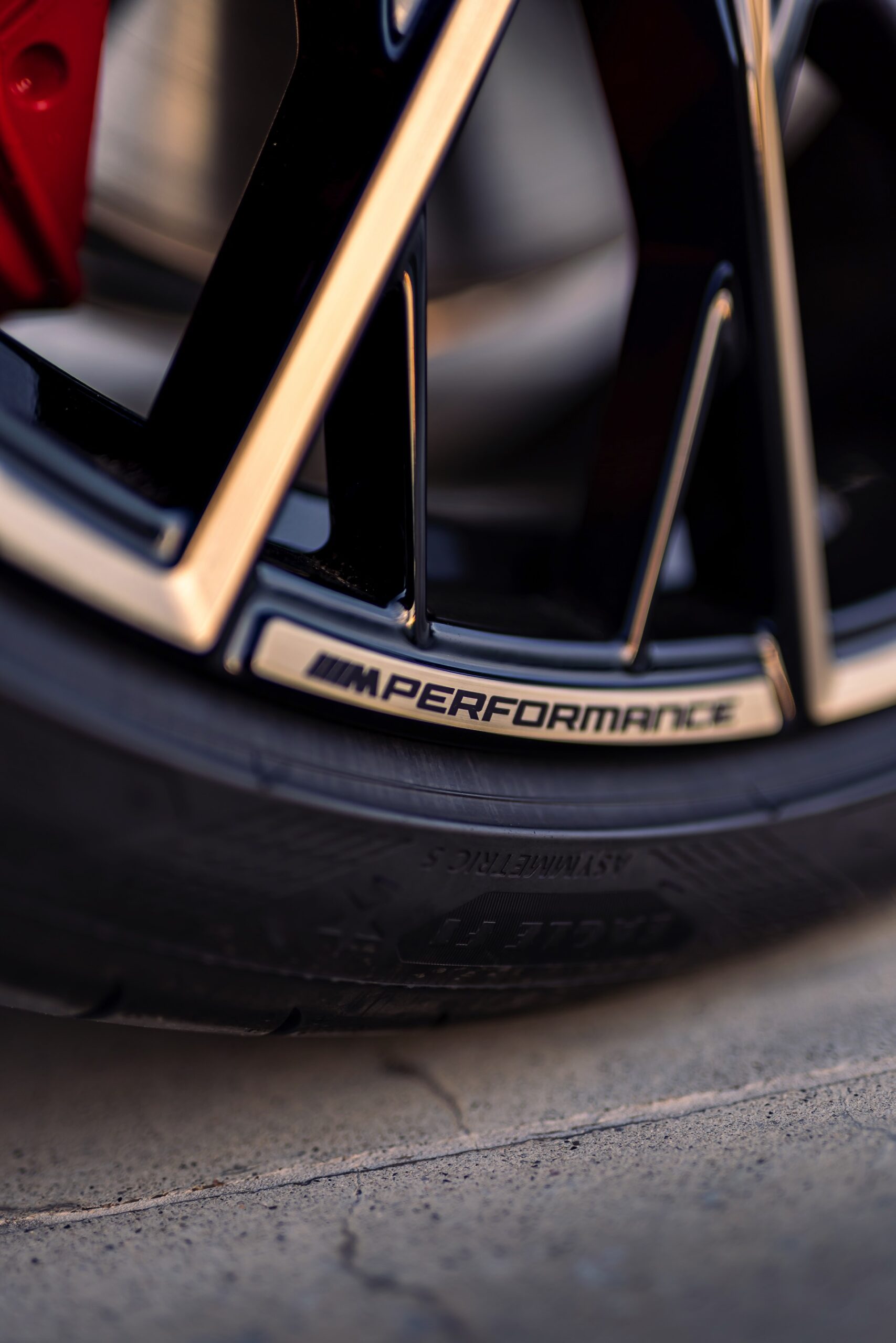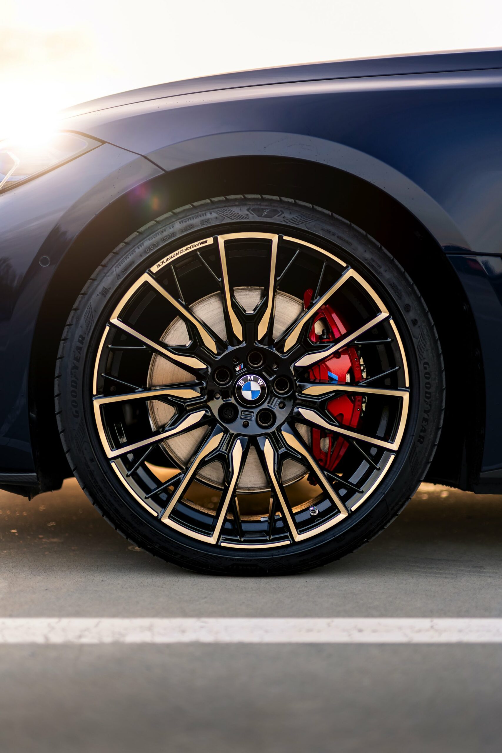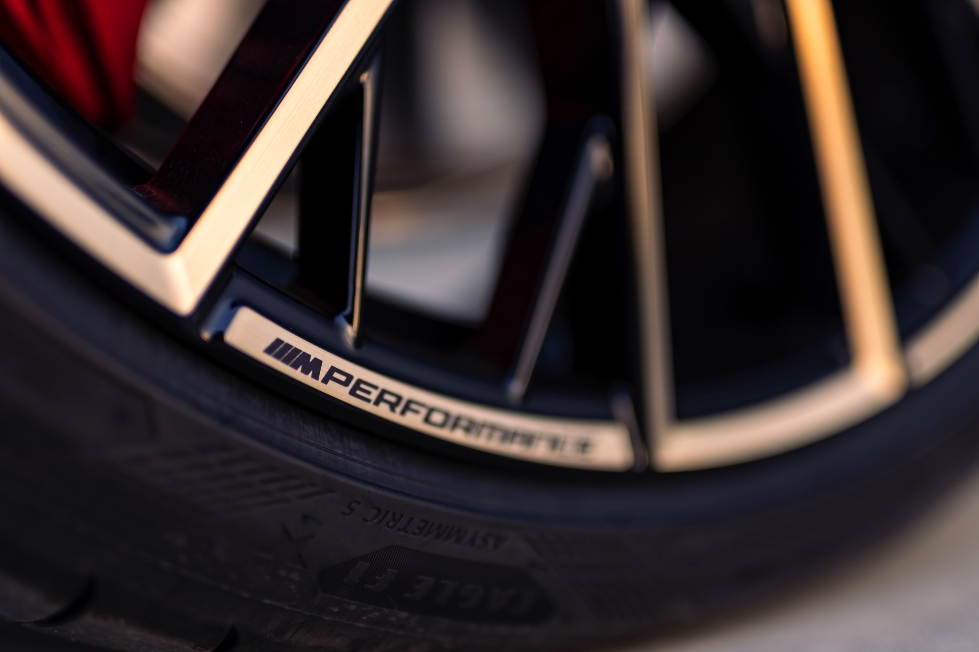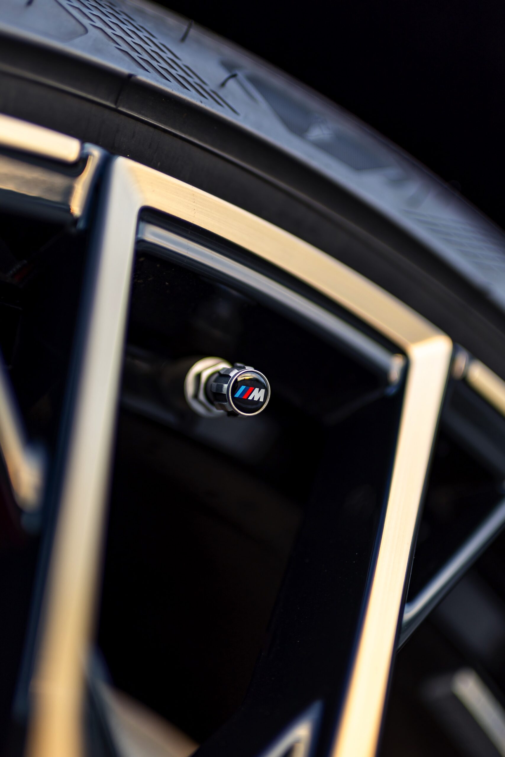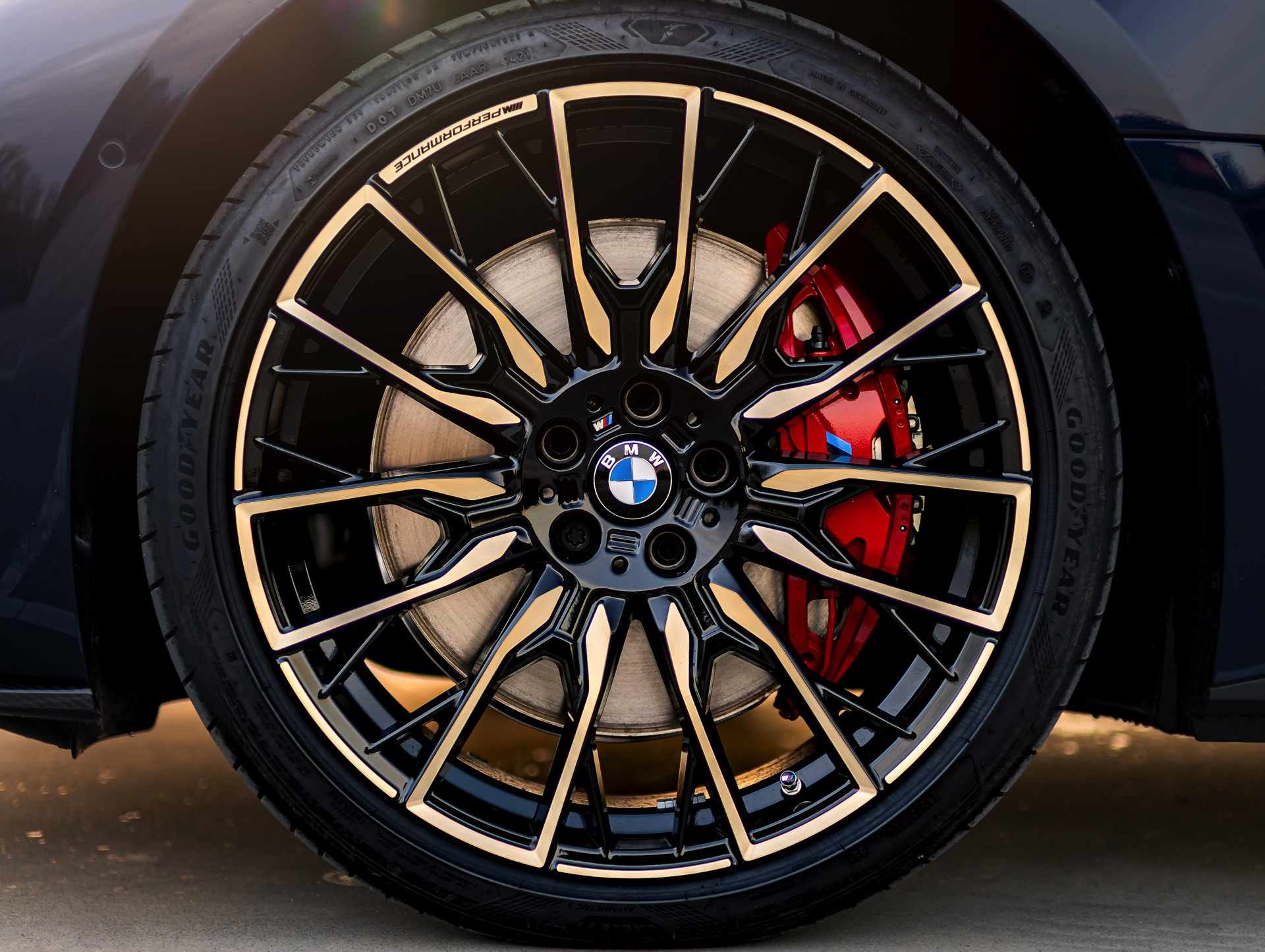 Tuning steht normalerweise nicht im Verdacht, Vorteile bei Effizienz und Reichweite mit sich zu bringen. Im Fall des BMW i4 M50 mit M Performance Tuning kann es unter Umständen aber durchaus dazu kommen, denn das elektrische Gran Coupé steht optional auf 20-Zoll-Felgen mit Mischbereifung. Werden stattdessen die hier gezeigten 20 Zoll großen M Performance-Felgen im Design Doppelspeiche 868 Bicolor in Jet Black und Night Gold verbaut, steigt die Reichweite tatsächlich leicht an – was vor allem an der Bereifung vom Typ Goodyear Eagle F1 Asymmetric 5 liegt, die mit etwas geringerem Rollwiderstand punktet.