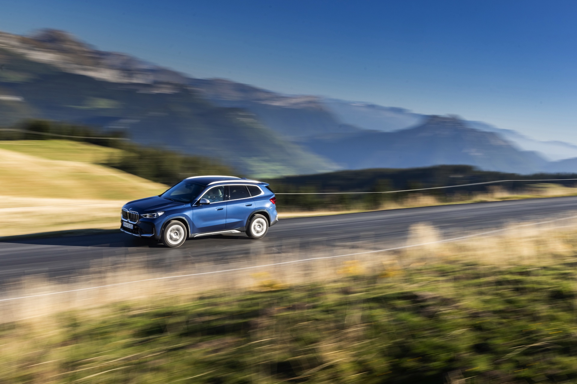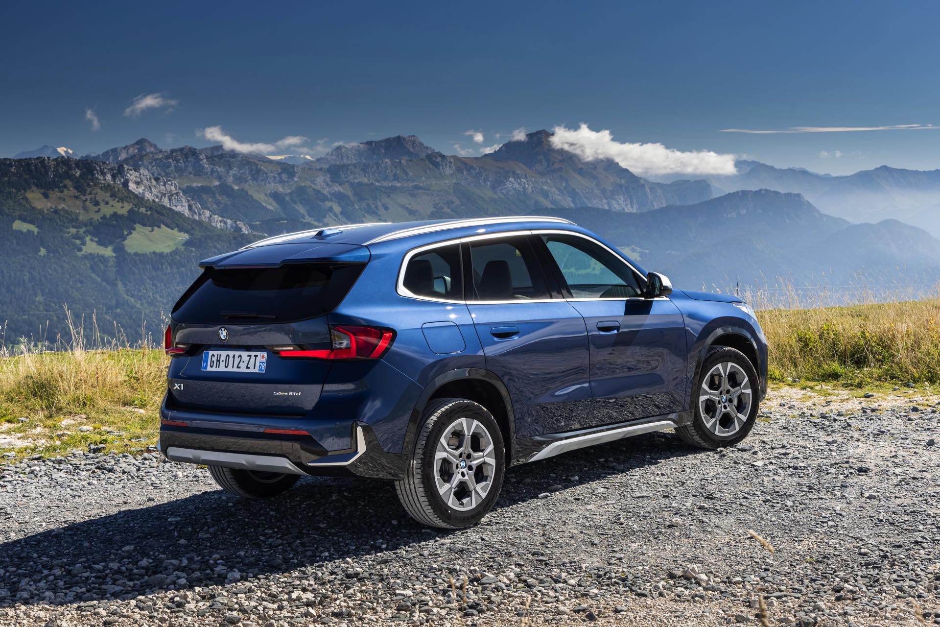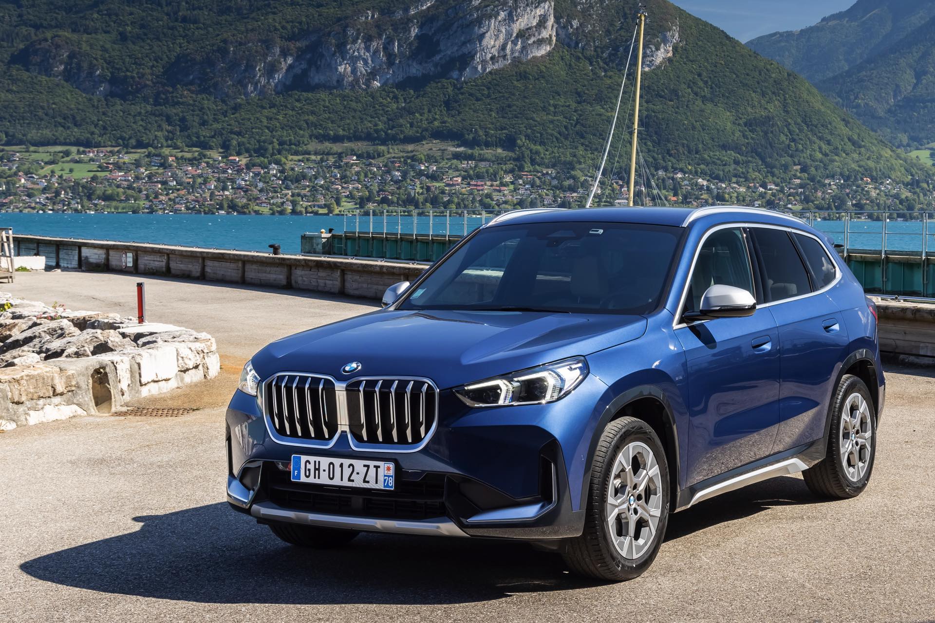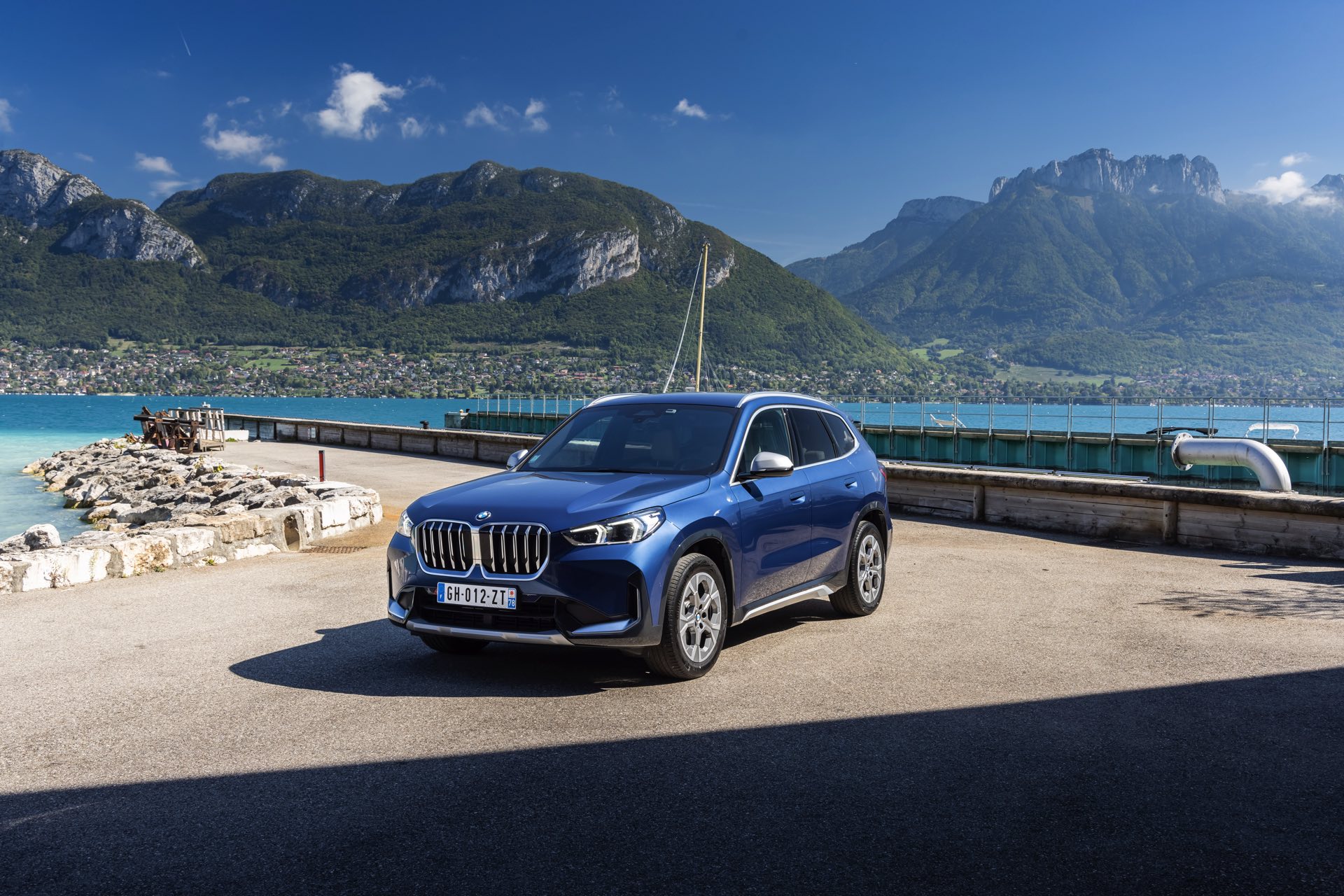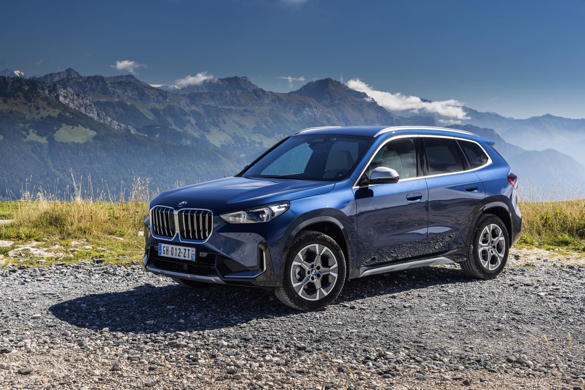 Auf den aktuellen Fotos, die in der Nähe von Annecy im Südosten Frankreichs entstanden sind, erhalten wir auch einen guten Eindruck von der je nach Lichteinfall sehr unterschiedlichen Wirkung der Farbe Phytonic Blue. Im Fall des gezeigten BMW X1 (U11) mit xLine wird das kräftige Blau mit einer Reihe metallisch glänzender Details kombiniert: Die große verchromte Niere wird mit Nieren-Streben in Aluminium aufgewertet, die Außenspiegel-Kappen sind in Glaciersilber lackiert, Front- und Heckschürze erhalten im Sinne eines rustikaleren Auftritts einen angedeuteten Unterfahrschutz in sowie Zierelemente in Perlglanz Chrom und auch die Fenstereinfassung und die Dachreling tragen ein Finish in satiniertem Aluminium: