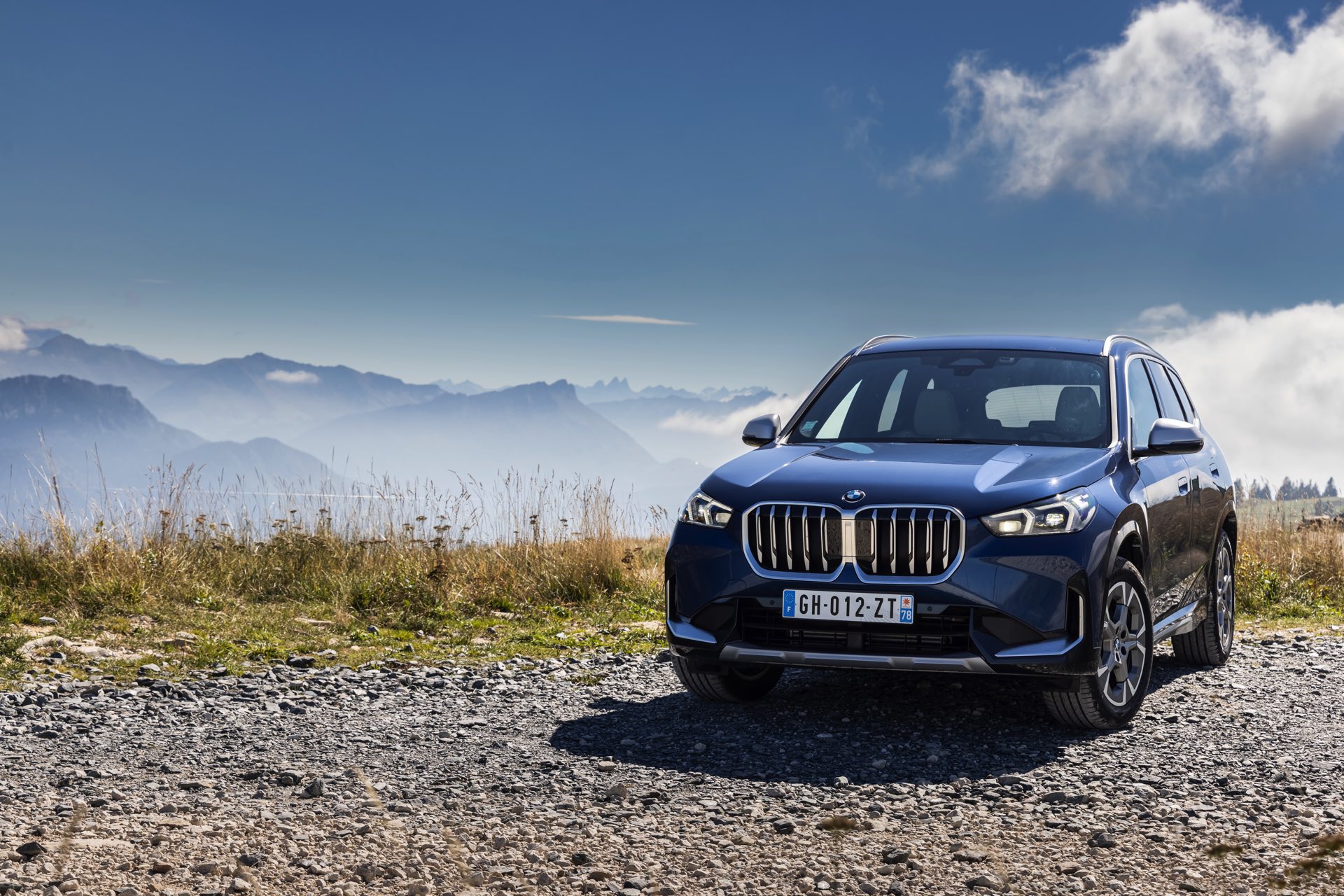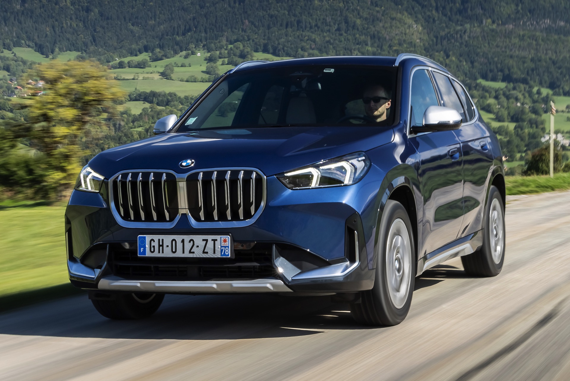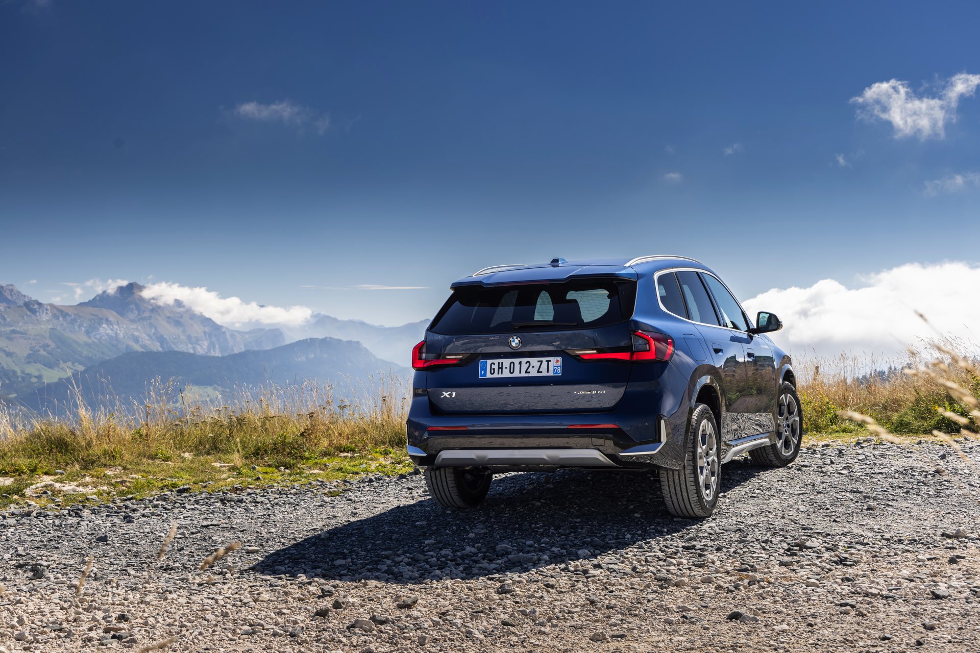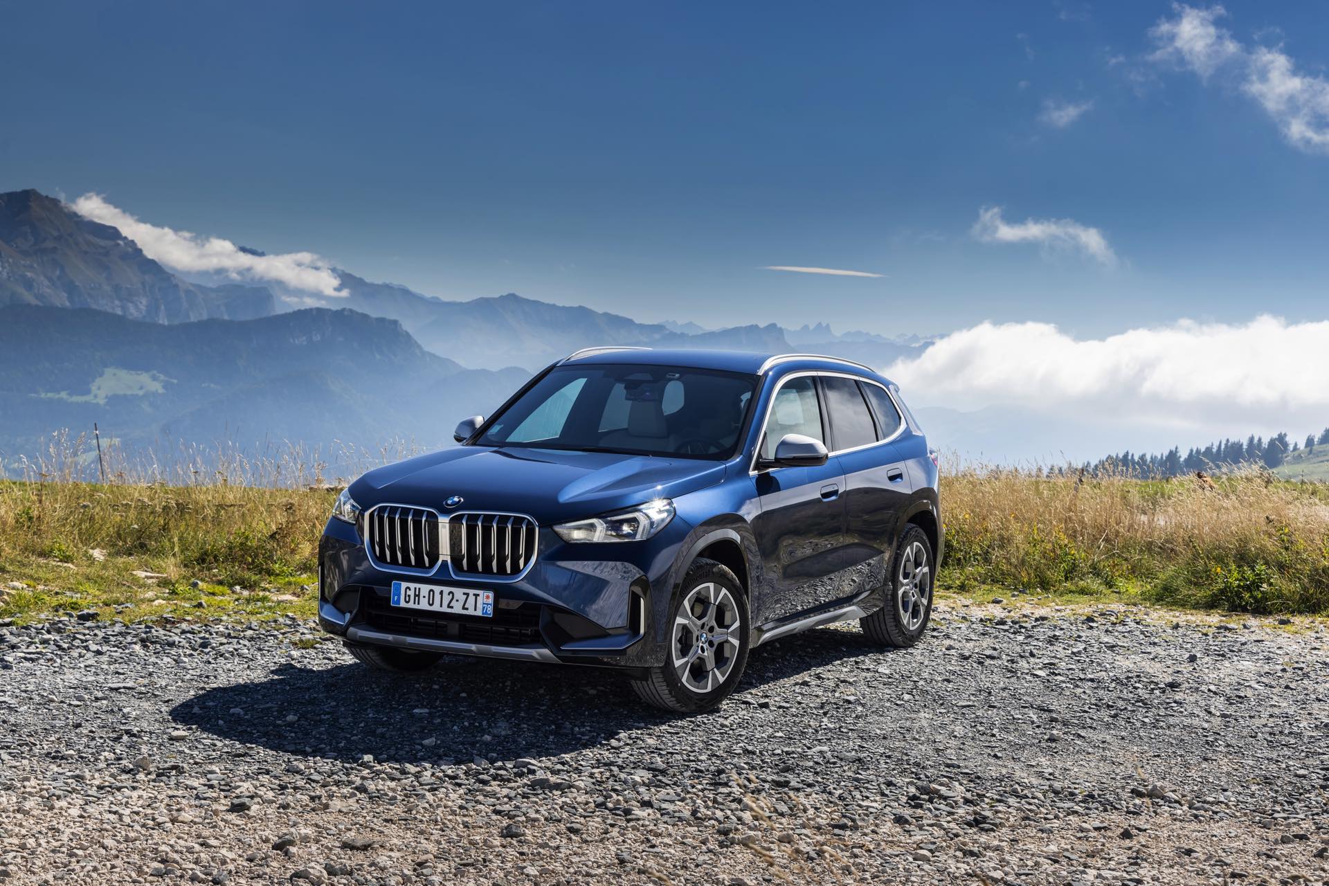 Auf den aktuellen Fotos, die in der Nähe von Annecy im Südosten Frankreichs entstanden sind, erhalten wir auch einen guten Eindruck von der je nach Lichteinfall sehr unterschiedlichen Wirkung der Farbe Phytonic Blue. Im Fall des gezeigten BMW X1 (U11) mit xLine wird das kräftige Blau mit einer Reihe metallisch glänzender Details kombiniert: Die große verchromte Niere wird mit Nieren-Streben in Aluminium aufgewertet, die Außenspiegel-Kappen sind in Glaciersilber lackiert, Front- und Heckschürze erhalten im Sinne eines rustikaleren Auftritts einen angedeuteten Unterfahrschutz in sowie Zierelemente in Perlglanz Chrom und auch die Fenstereinfassung und die Dachreling tragen ein Finish in satiniertem Aluminium: