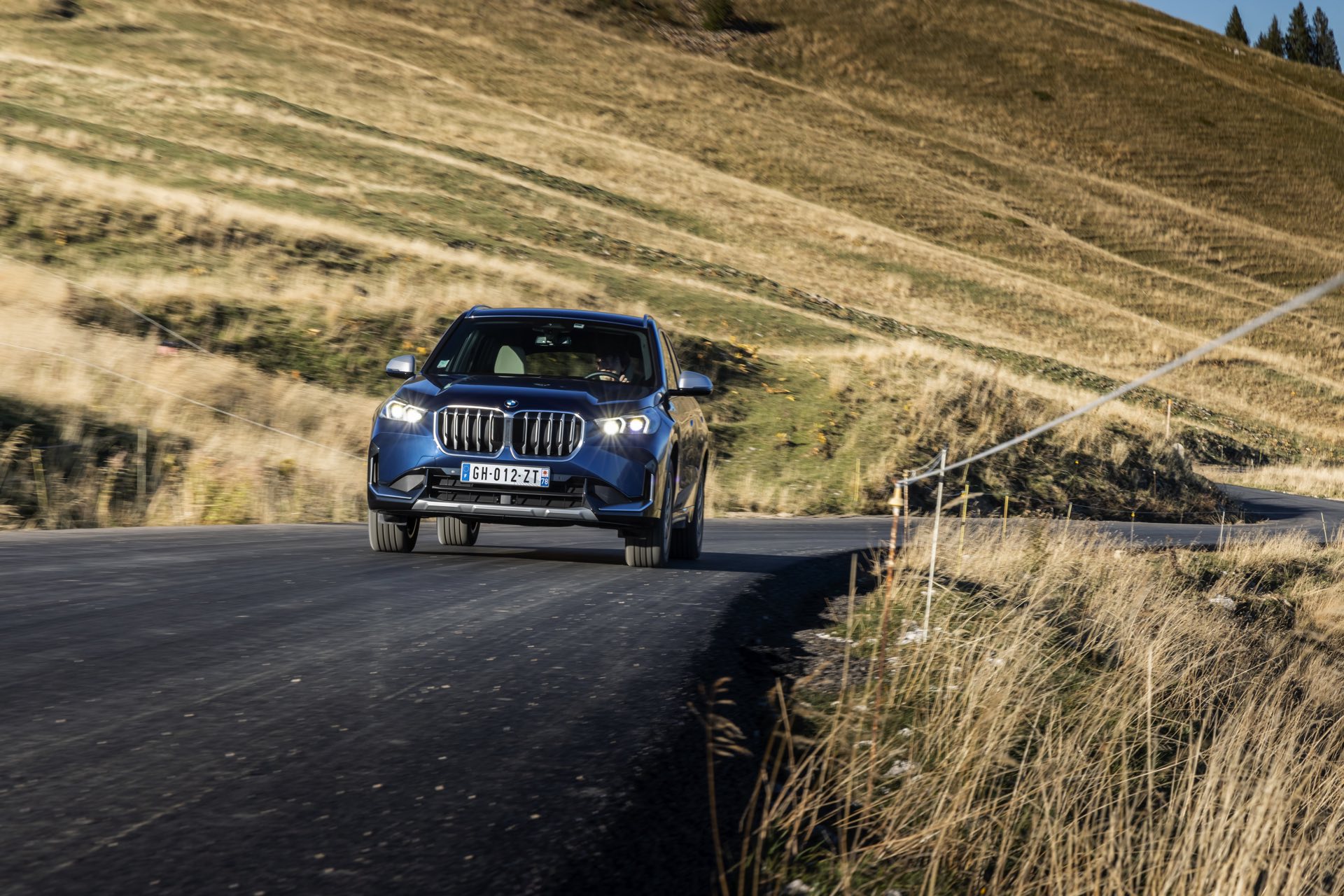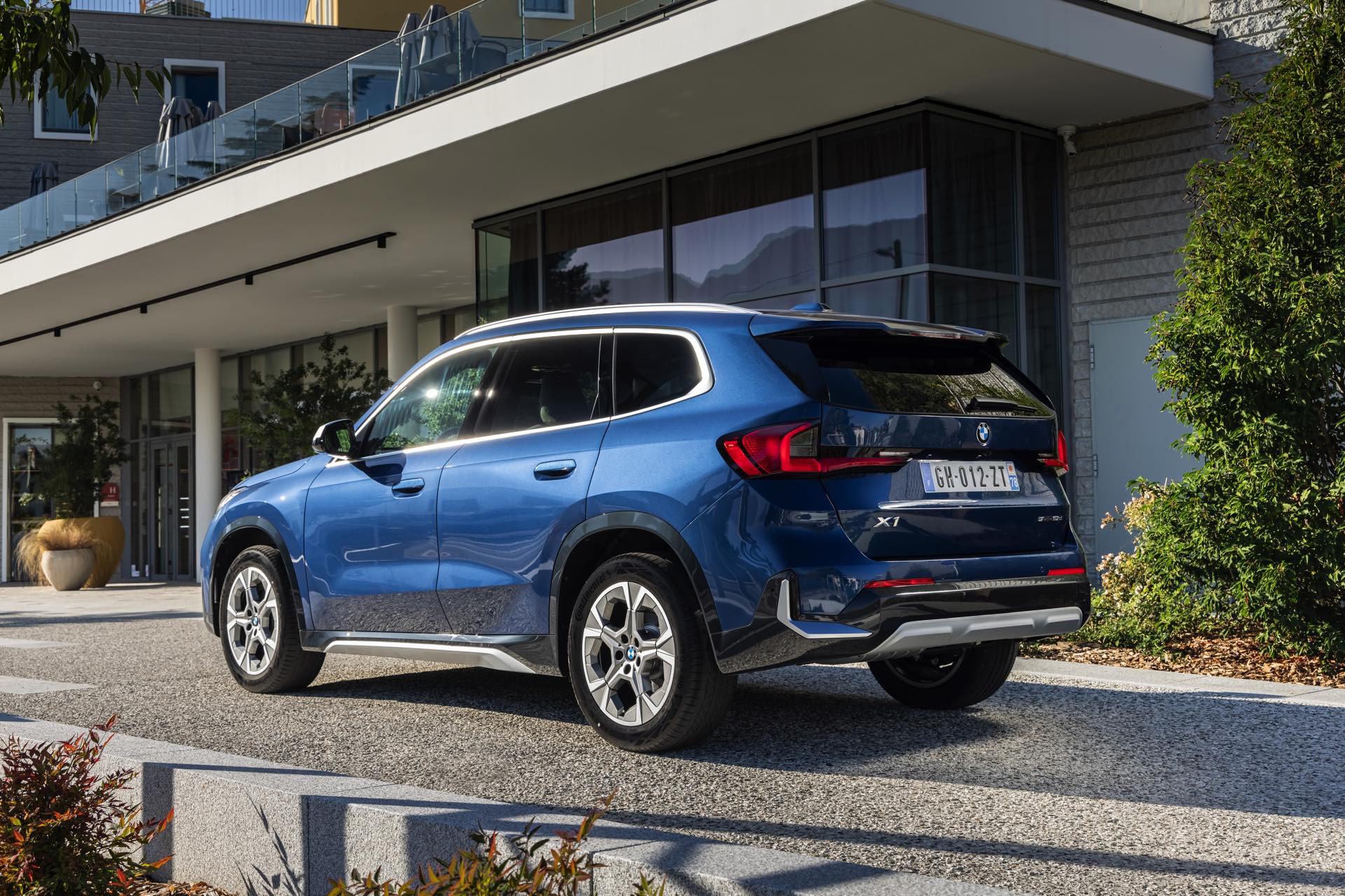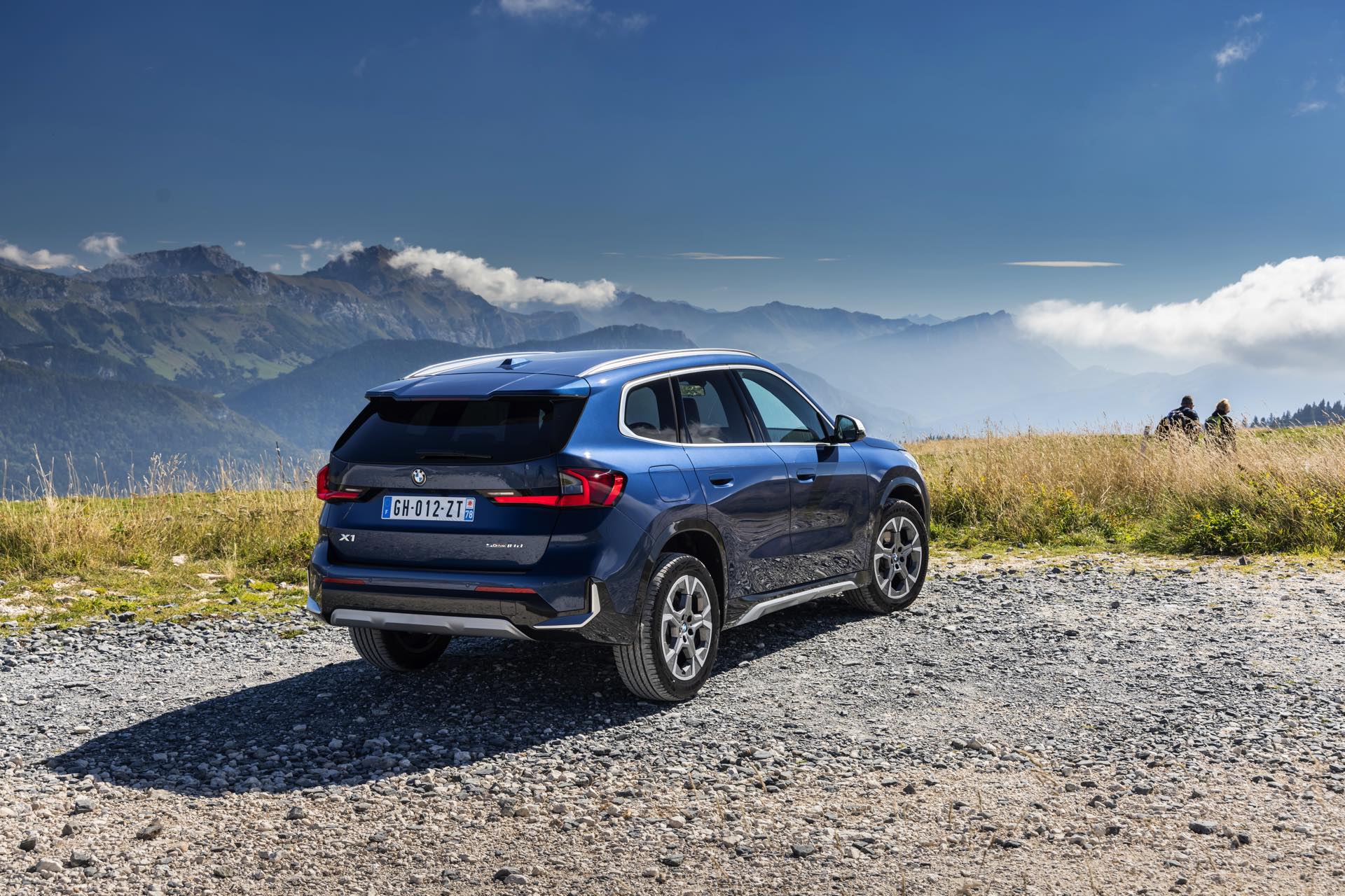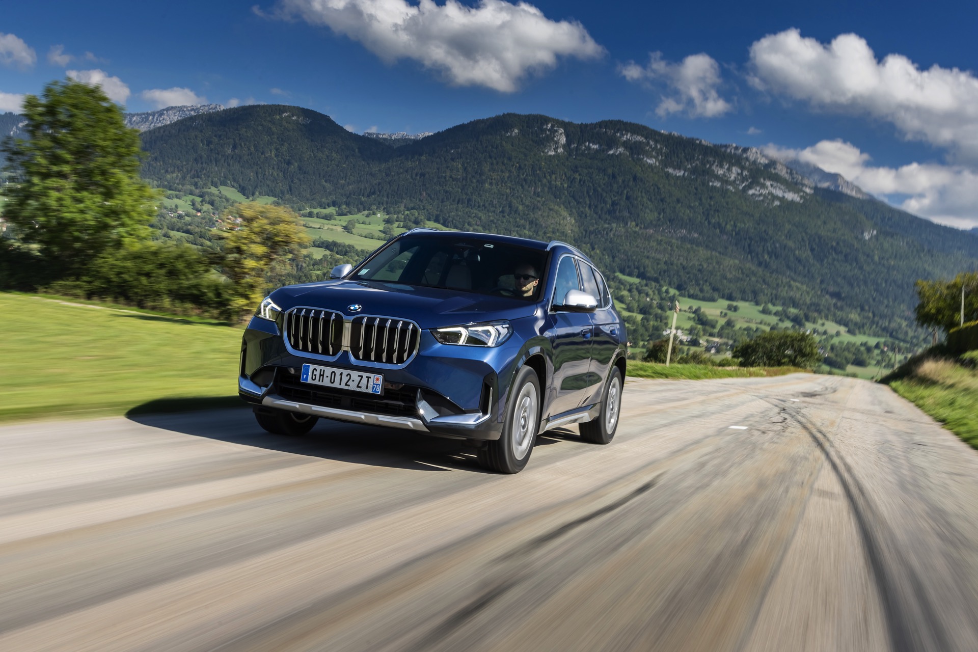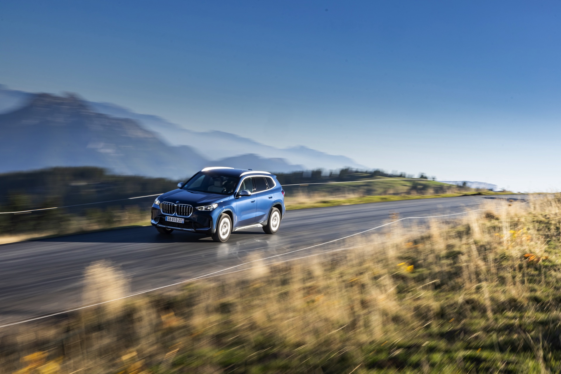 Auf den aktuellen Fotos, die in der Nähe von Annecy im Südosten Frankreichs entstanden sind, erhalten wir auch einen guten Eindruck von der je nach Lichteinfall sehr unterschiedlichen Wirkung der Farbe Phytonic Blue. Im Fall des gezeigten BMW X1 (U11) mit xLine wird das kräftige Blau mit einer Reihe metallisch glänzender Details kombiniert: Die große verchromte Niere wird mit Nieren-Streben in Aluminium aufgewertet, die Außenspiegel-Kappen sind in Glaciersilber lackiert, Front- und Heckschürze erhalten im Sinne eines rustikaleren Auftritts einen angedeuteten Unterfahrschutz in sowie Zierelemente in Perlglanz Chrom und auch die Fenstereinfassung und die Dachreling tragen ein Finish in satiniertem Aluminium: