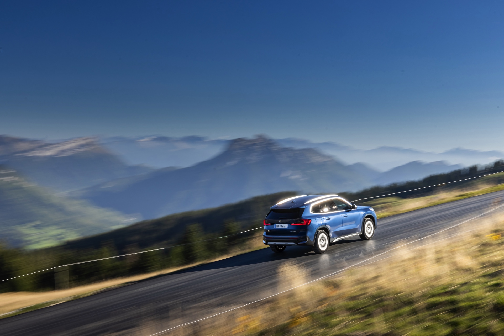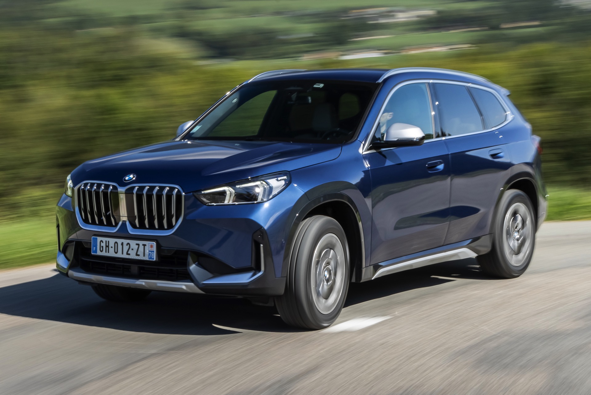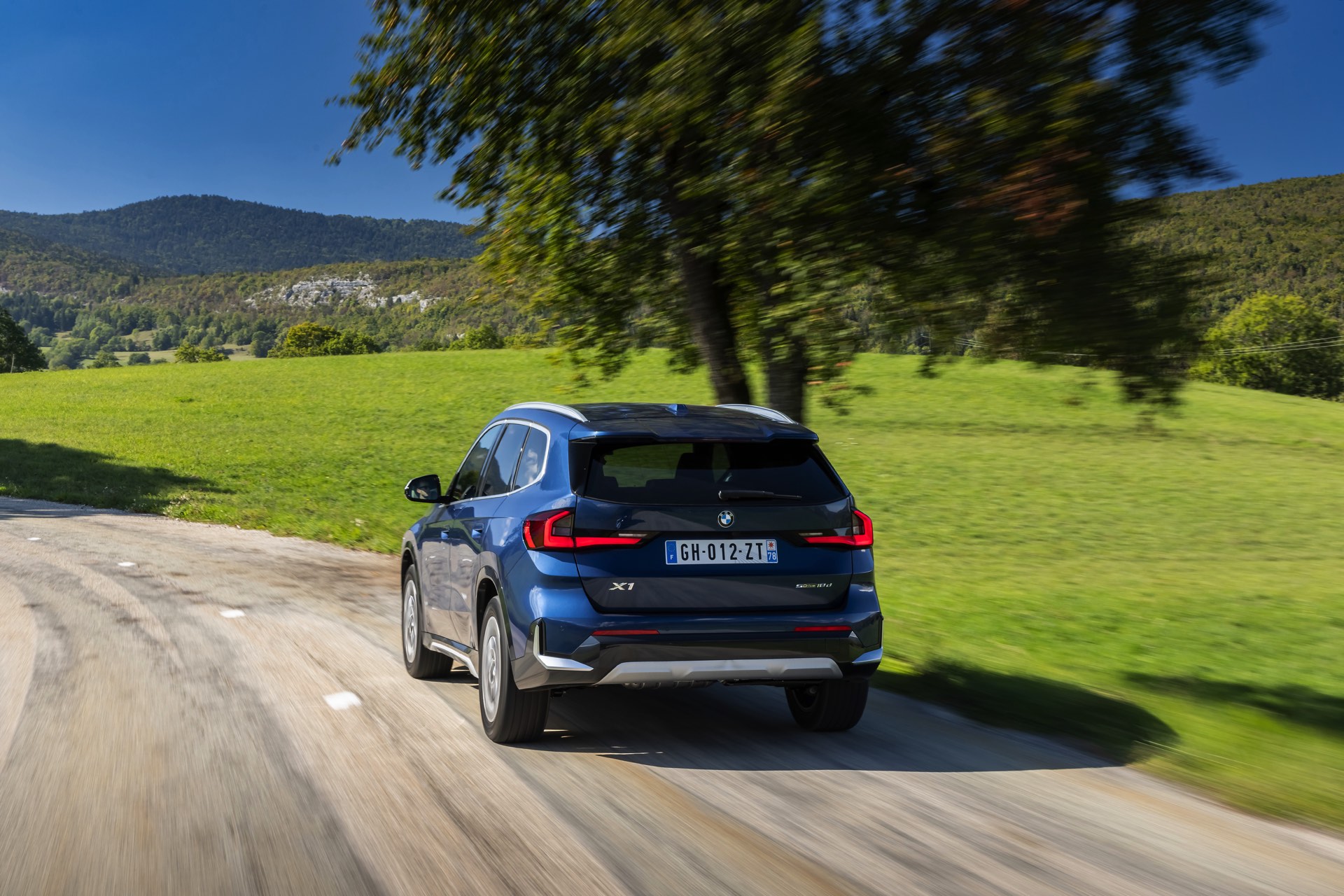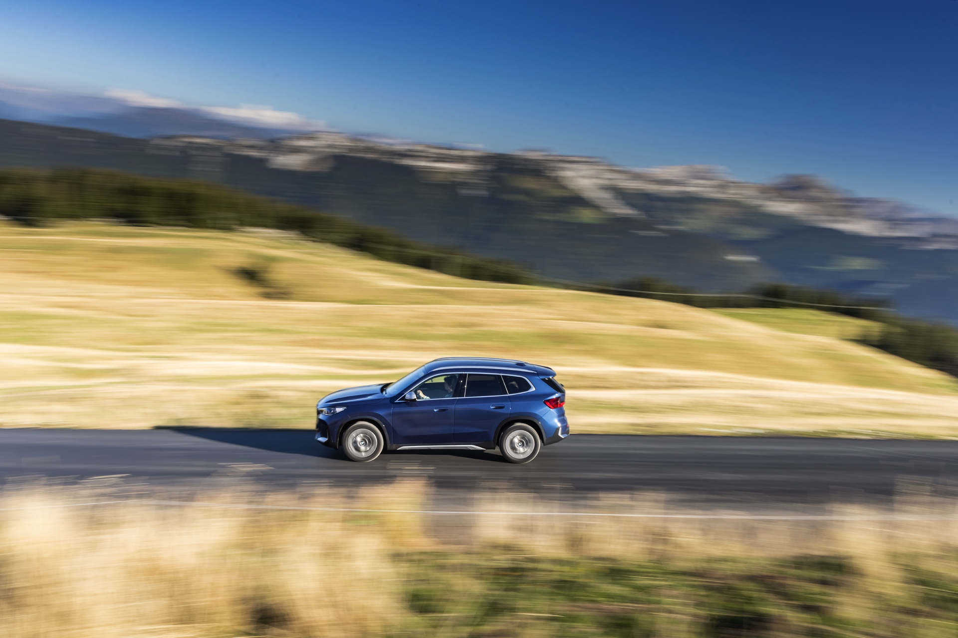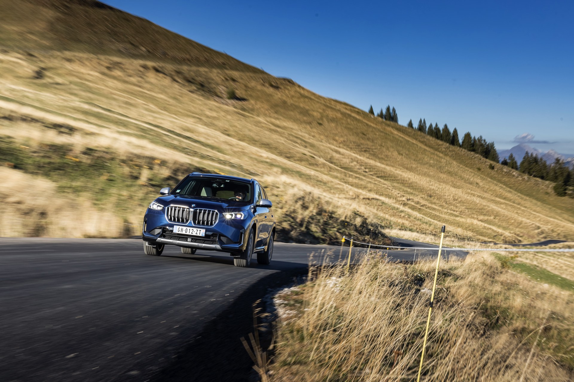 Auf den aktuellen Fotos, die in der Nähe von Annecy im Südosten Frankreichs entstanden sind, erhalten wir auch einen guten Eindruck von der je nach Lichteinfall sehr unterschiedlichen Wirkung der Farbe Phytonic Blue. Im Fall des gezeigten BMW X1 (U11) mit xLine wird das kräftige Blau mit einer Reihe metallisch glänzender Details kombiniert: Die große verchromte Niere wird mit Nieren-Streben in Aluminium aufgewertet, die Außenspiegel-Kappen sind in Glaciersilber lackiert, Front- und Heckschürze erhalten im Sinne eines rustikaleren Auftritts einen angedeuteten Unterfahrschutz in sowie Zierelemente in Perlglanz Chrom und auch die Fenstereinfassung und die Dachreling tragen ein Finish in satiniertem Aluminium: