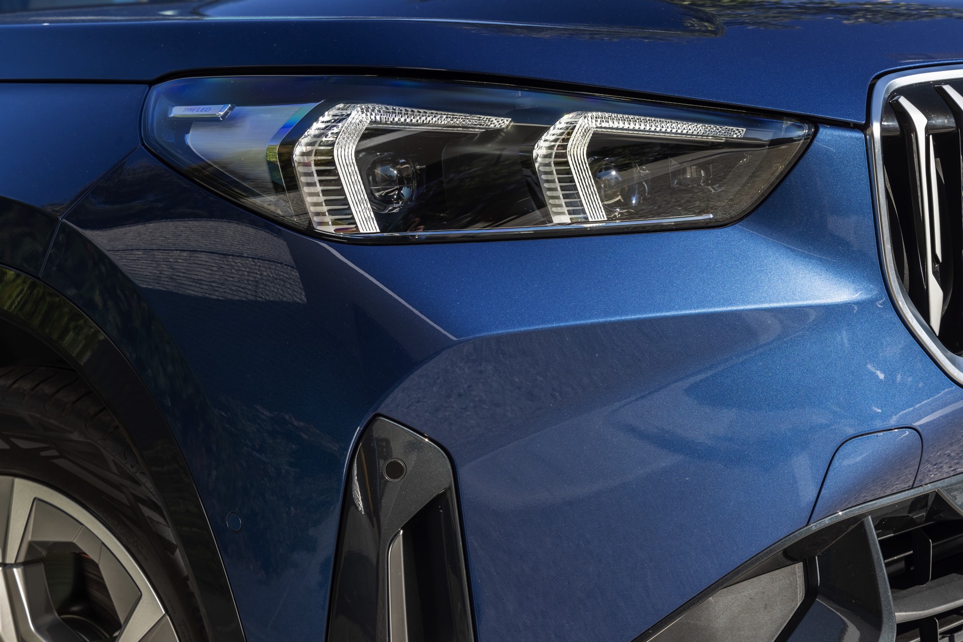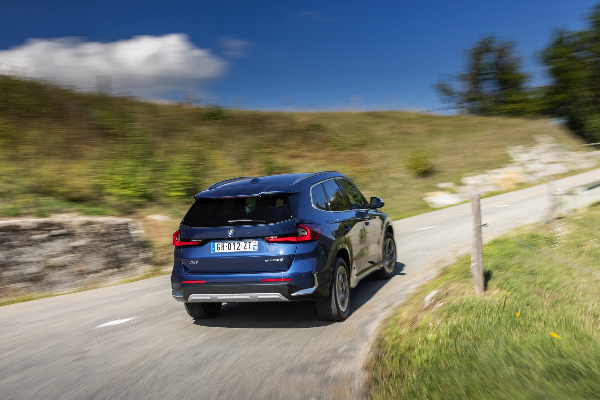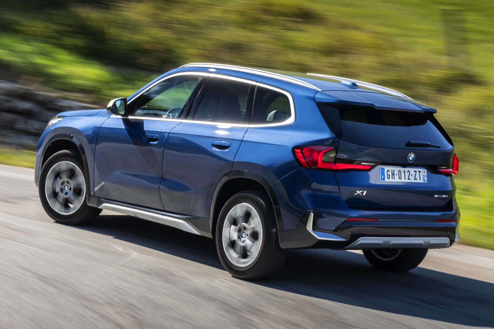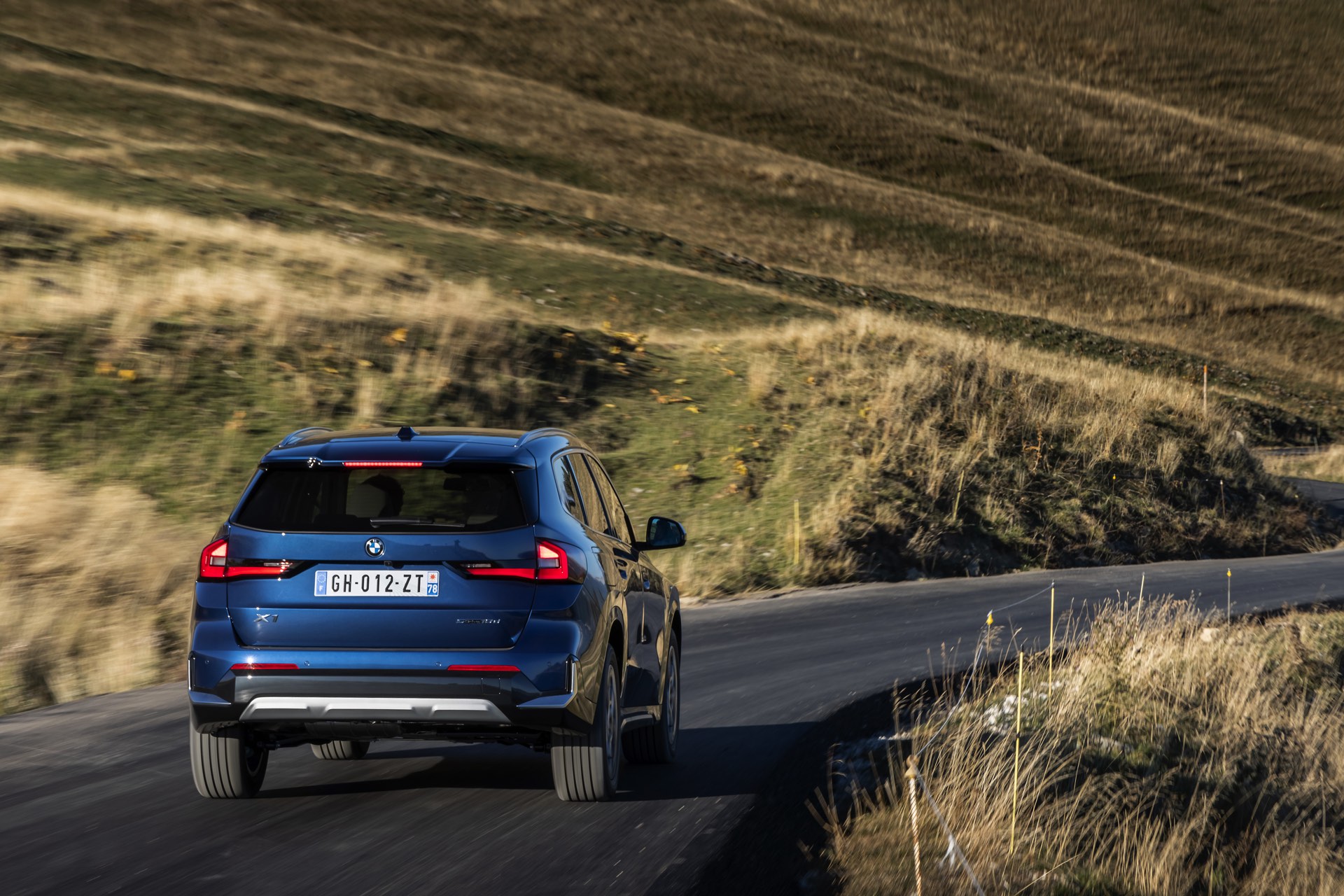 Auf den aktuellen Fotos, die in der Nähe von Annecy im Südosten Frankreichs entstanden sind, erhalten wir auch einen guten Eindruck von der je nach Lichteinfall sehr unterschiedlichen Wirkung der Farbe Phytonic Blue. Im Fall des gezeigten BMW X1 (U11) mit xLine wird das kräftige Blau mit einer Reihe metallisch glänzender Details kombiniert: Die große verchromte Niere wird mit Nieren-Streben in Aluminium aufgewertet, die Außenspiegel-Kappen sind in Glaciersilber lackiert, Front- und Heckschürze erhalten im Sinne eines rustikaleren Auftritts einen angedeuteten Unterfahrschutz in sowie Zierelemente in Perlglanz Chrom und auch die Fenstereinfassung und die Dachreling tragen ein Finish in satiniertem Aluminium: