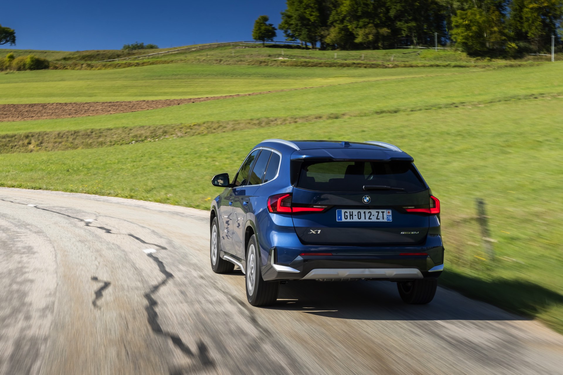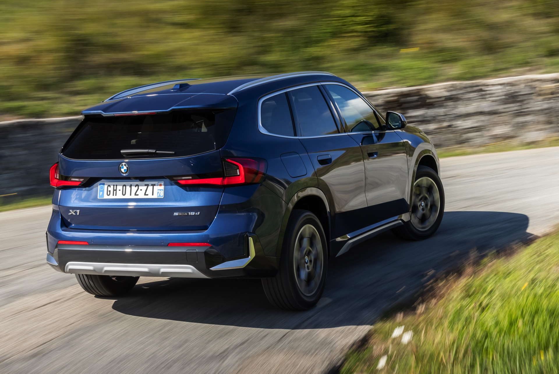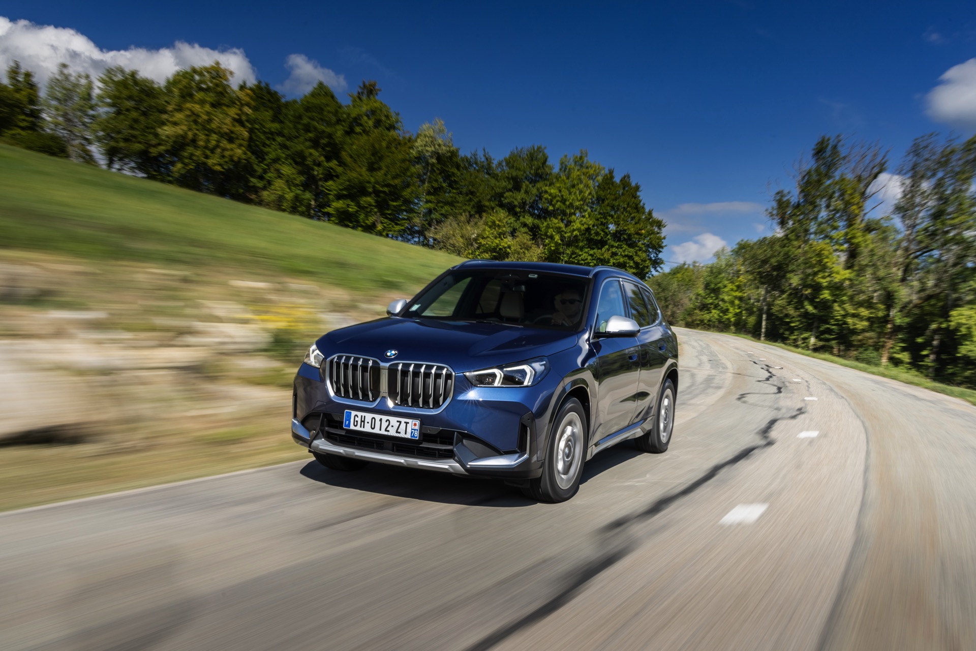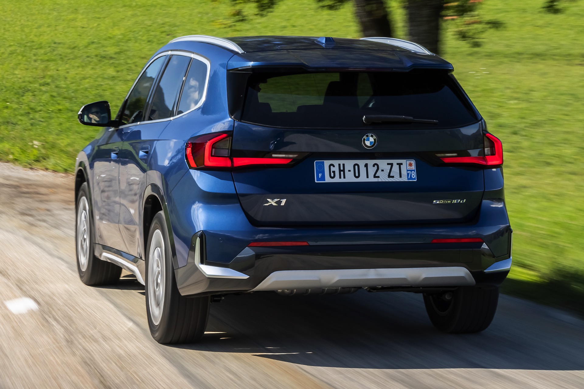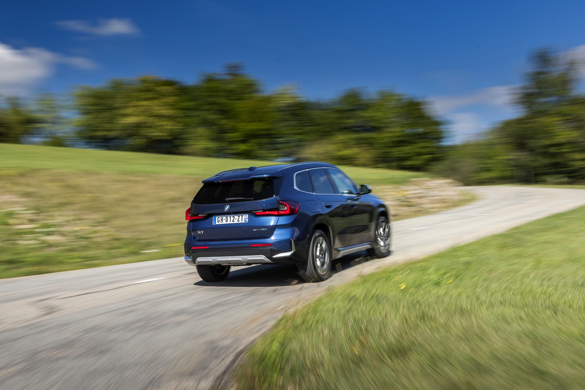 Auf den aktuellen Fotos, die in der Nähe von Annecy im Südosten Frankreichs entstanden sind, erhalten wir auch einen guten Eindruck von der je nach Lichteinfall sehr unterschiedlichen Wirkung der Farbe Phytonic Blue. Im Fall des gezeigten BMW X1 (U11) mit xLine wird das kräftige Blau mit einer Reihe metallisch glänzender Details kombiniert: Die große verchromte Niere wird mit Nieren-Streben in Aluminium aufgewertet, die Außenspiegel-Kappen sind in Glaciersilber lackiert, Front- und Heckschürze erhalten im Sinne eines rustikaleren Auftritts einen angedeuteten Unterfahrschutz in sowie Zierelemente in Perlglanz Chrom und auch die Fenstereinfassung und die Dachreling tragen ein Finish in satiniertem Aluminium: