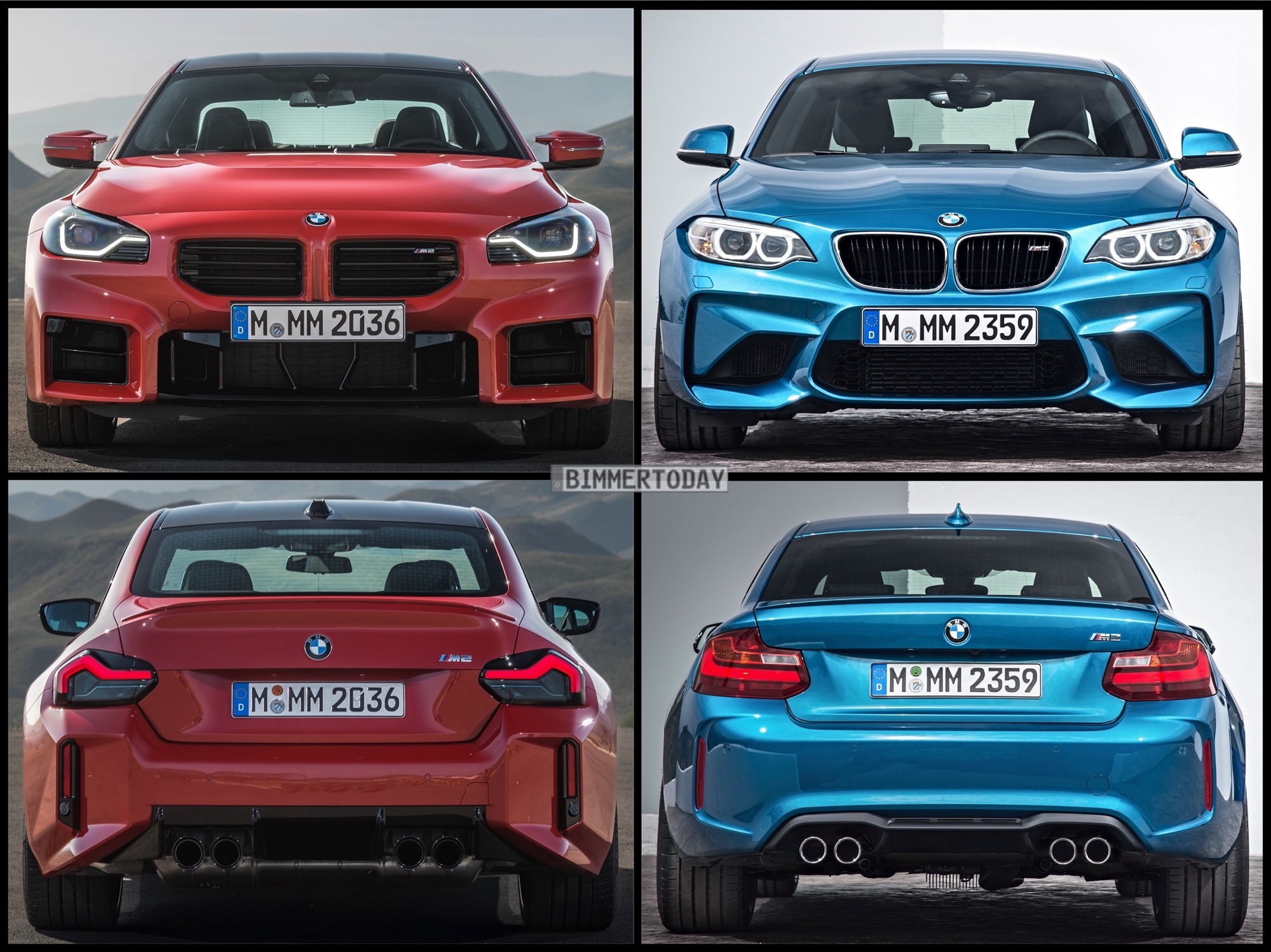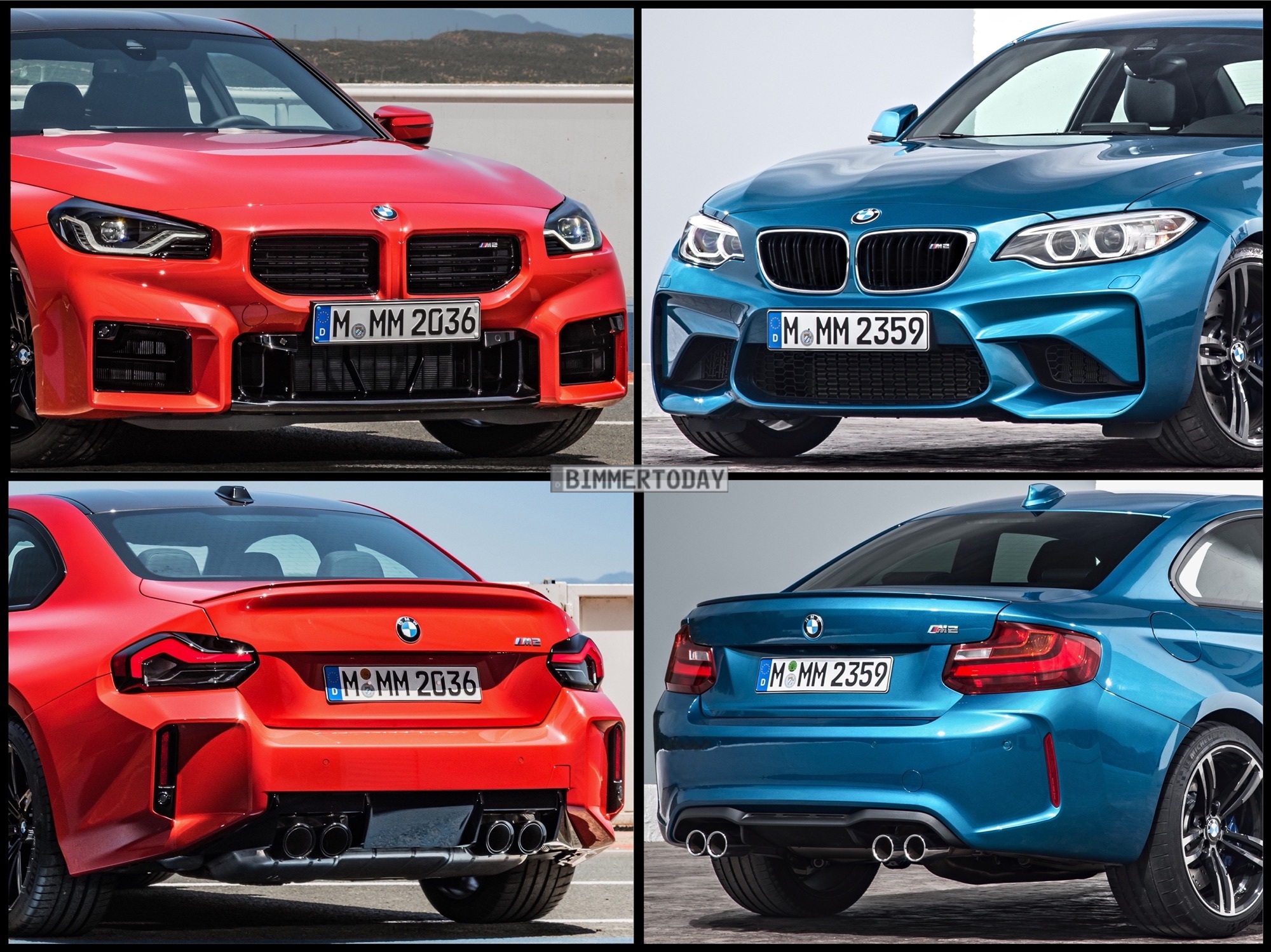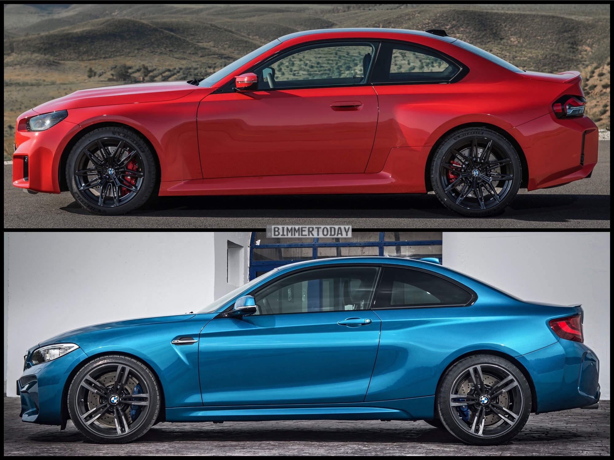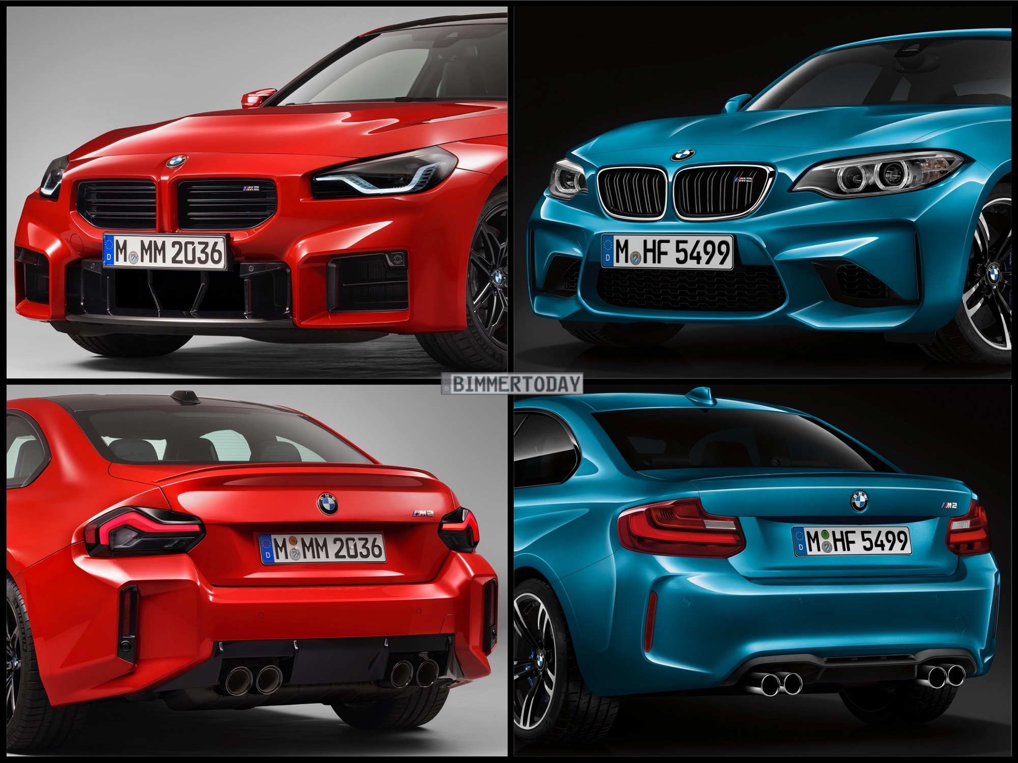 Eine komplett eigenständige Front mit veränderter Nierenform und horizontalen Streben, modifizierten Scheinwerfern und beinahe rechteckigen Lufteinlässen darunter werden mit noch markanter ausgestellten Kotflügeln und einem aggressiven Heck kombiniert, sodass Verwechslungen mit einem regulären 2er Coupé (G42) aus jedem Blickwinkel ausgeschlossen sind. Im Vergleich zu seinem harmonisch gezeichneten Vorgänger wirkt der neue BMW M2 geradezu provokant brutal und scheint gar nicht erst zu versuchen, jedermann zu gefallen. Der kantige Ansatz wird auch in der Seitenansicht deutlich: Die erheblich verbreiterten Kotflügel sind beim zweiten M2 noch stärker ausgeformt, während sie beim Vorgänger vergleichsweise sanft ins Gesamtbild integriert wurden.