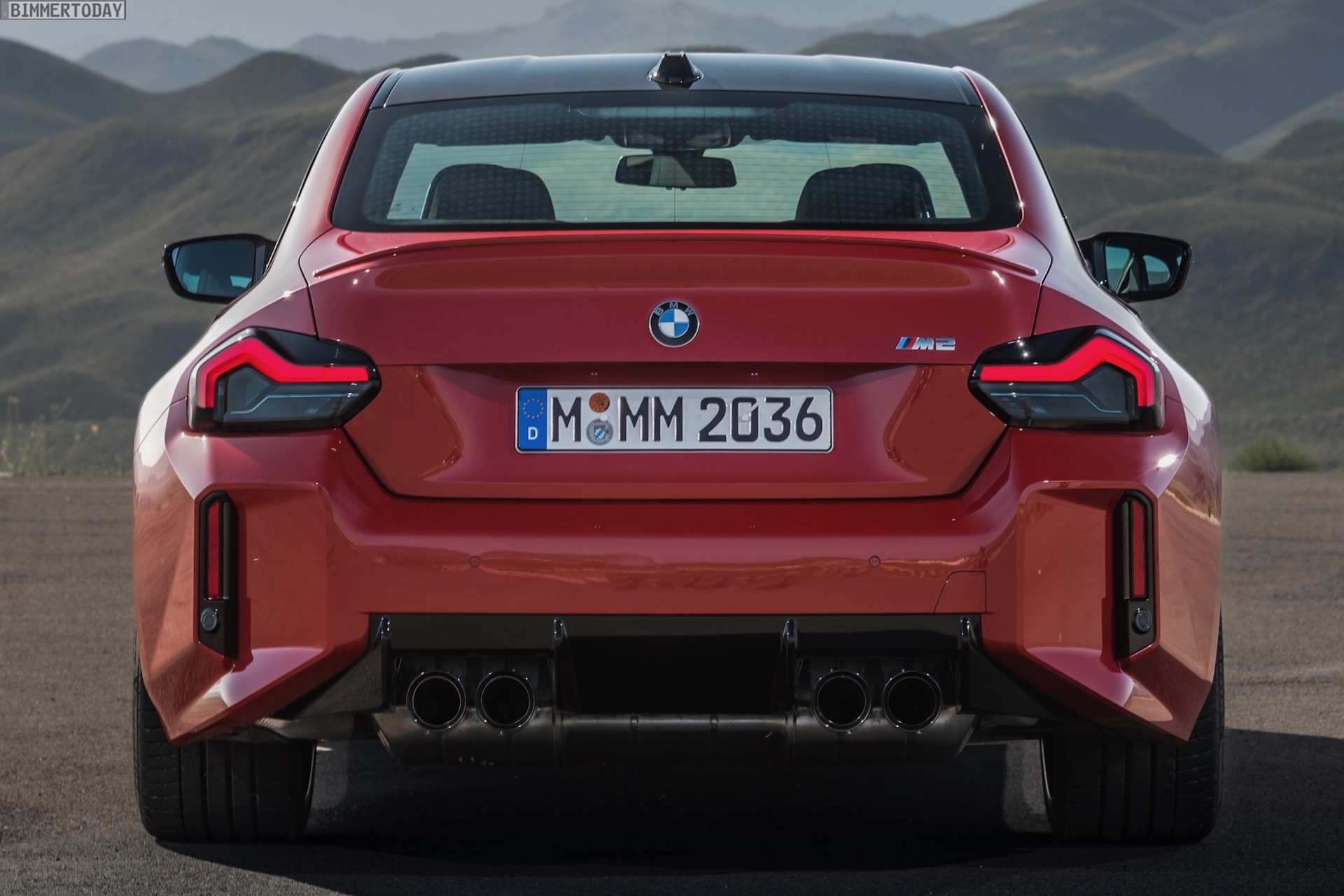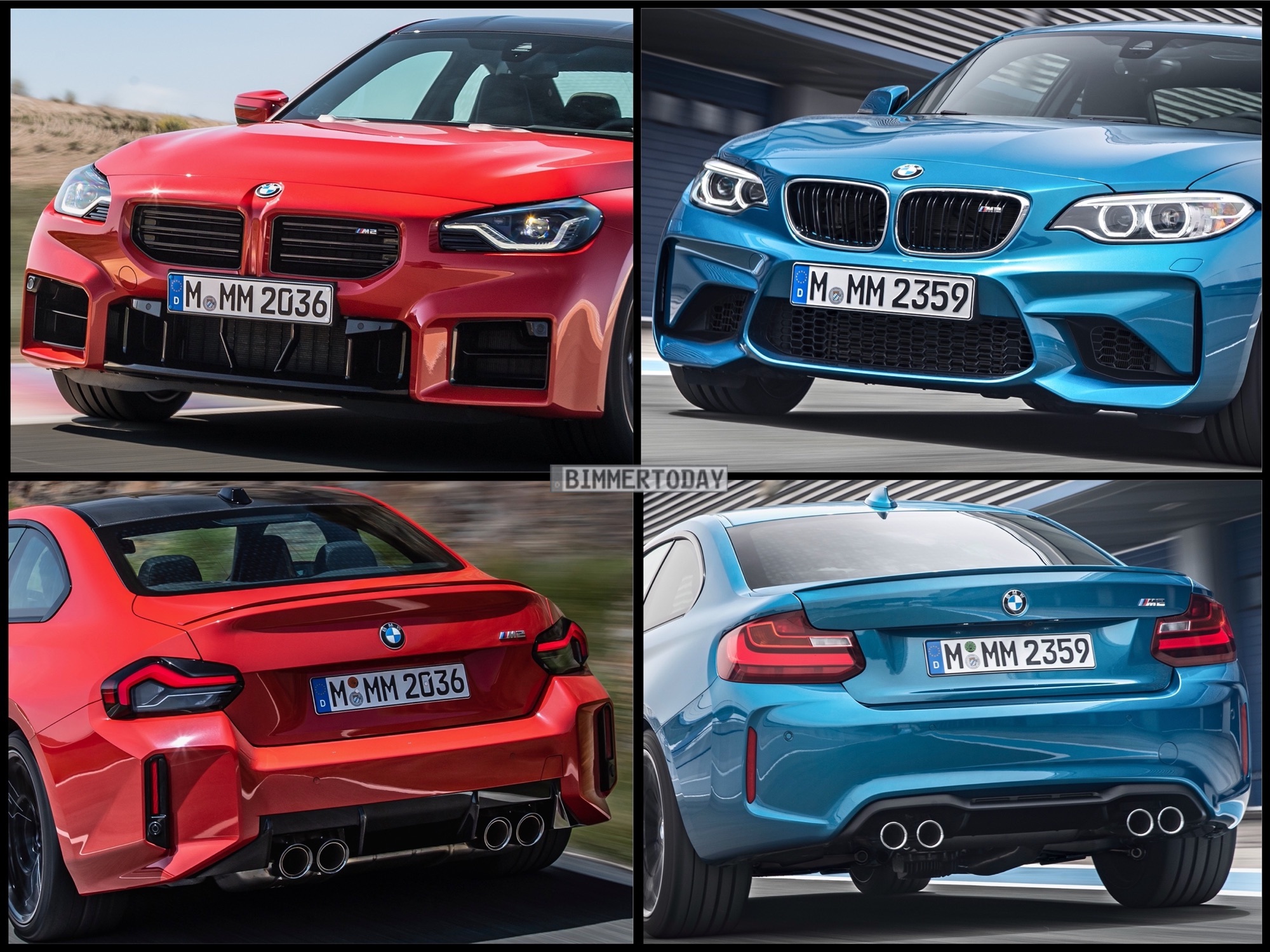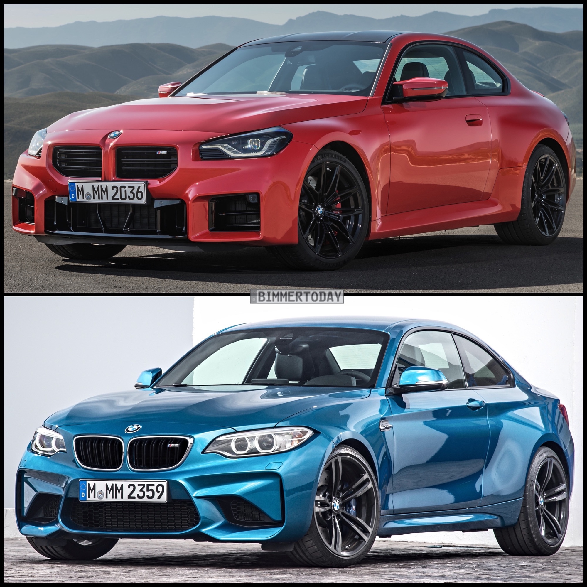 Eine komplett eigenständige Front mit veränderter Nierenform und horizontalen Streben, modifizierten Scheinwerfern und beinahe rechteckigen Lufteinlässen darunter werden mit noch markanter ausgestellten Kotflügeln und einem aggressiven Heck kombiniert, sodass Verwechslungen mit einem regulären 2er Coupé (G42) aus jedem Blickwinkel ausgeschlossen sind. Im Vergleich zu seinem harmonisch gezeichneten Vorgänger wirkt der neue BMW M2 geradezu provokant brutal und scheint gar nicht erst zu versuchen, jedermann zu gefallen. Der kantige Ansatz wird auch in der Seitenansicht deutlich: Die erheblich verbreiterten Kotflügel sind beim zweiten M2 noch stärker ausgeformt, während sie beim Vorgänger vergleichsweise sanft ins Gesamtbild integriert wurden.