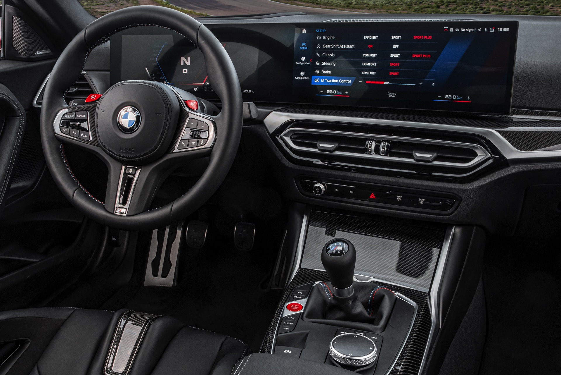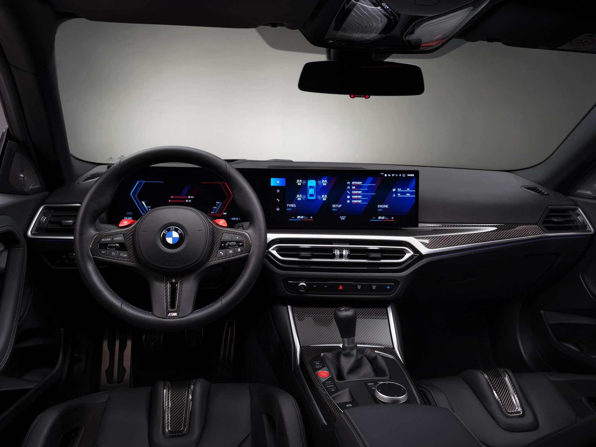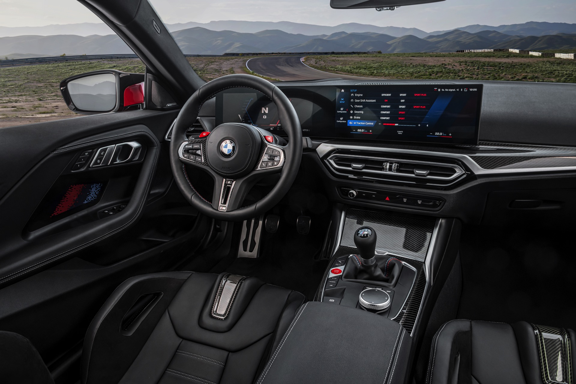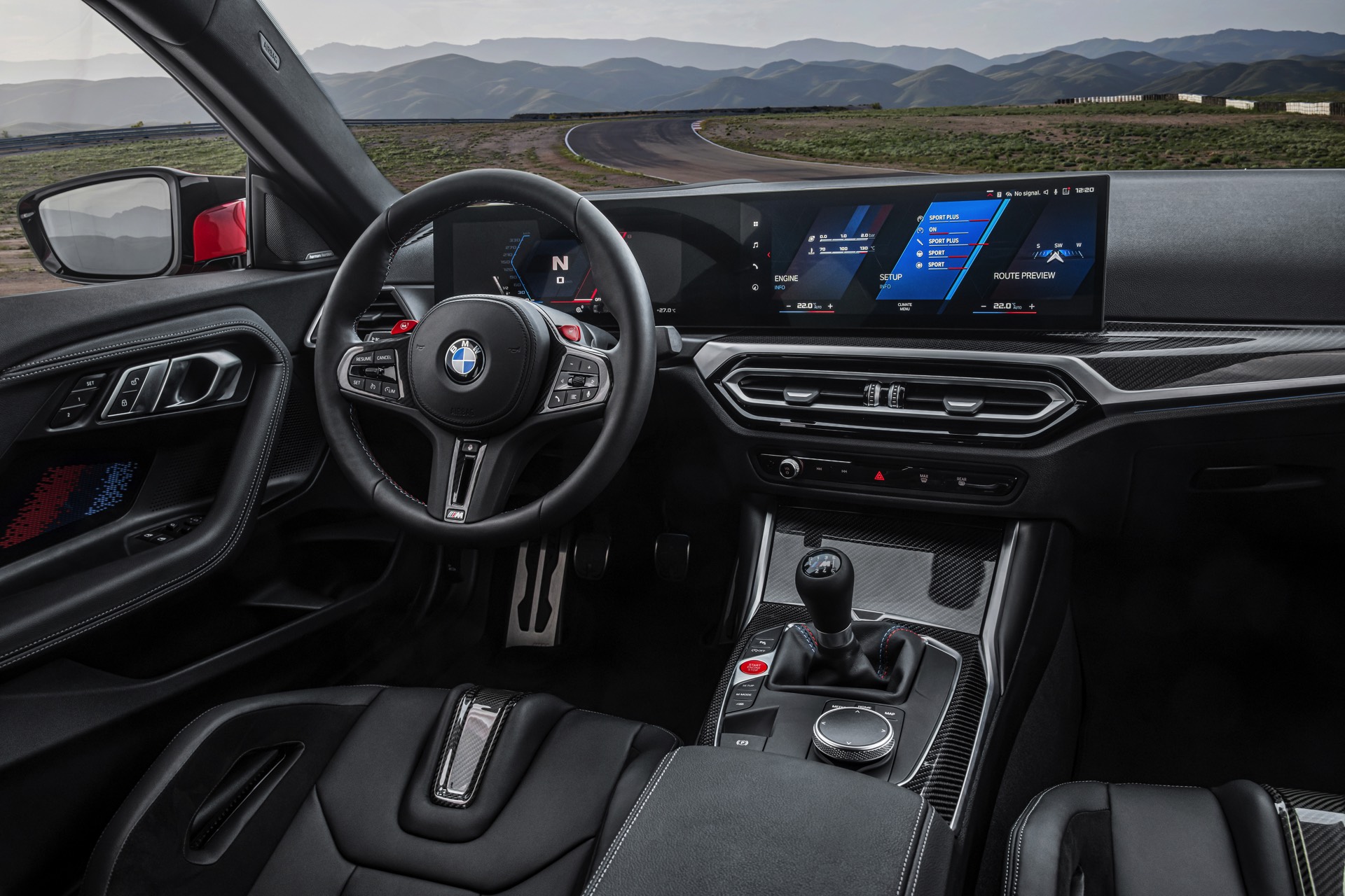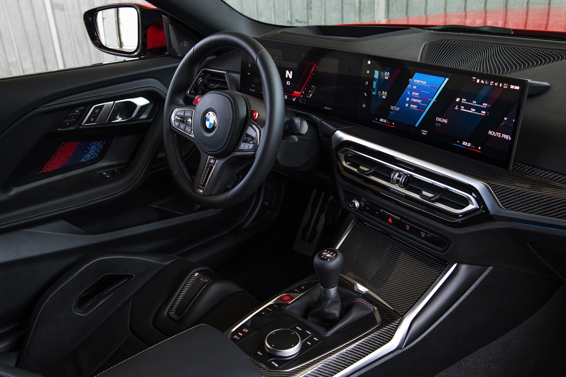 Highlights im Innenraum sind je nach Perspektive und persönlicher Gewichtung entweder das Curved-Display, die optionalen M Carbon-Schalensitze mit beleuchteten Logos und Details in M-Farben oder auch der im hochmodernen Cockpit fast etwas antiquiert wirkende Wählhebel für das manuelle Sechsgang-Getriebe. Traditionell überschaubar bleibt die Farbpalette für den Einstiegs-M: Mit Toronto Rot und Zandvoort Blau stehen zwei markante Farben zur Wahl, außerdem gibt es mit Alpinweiß, Saphirschwarz und Brooklyn Grau auch drei etwas gedecktere Farben.