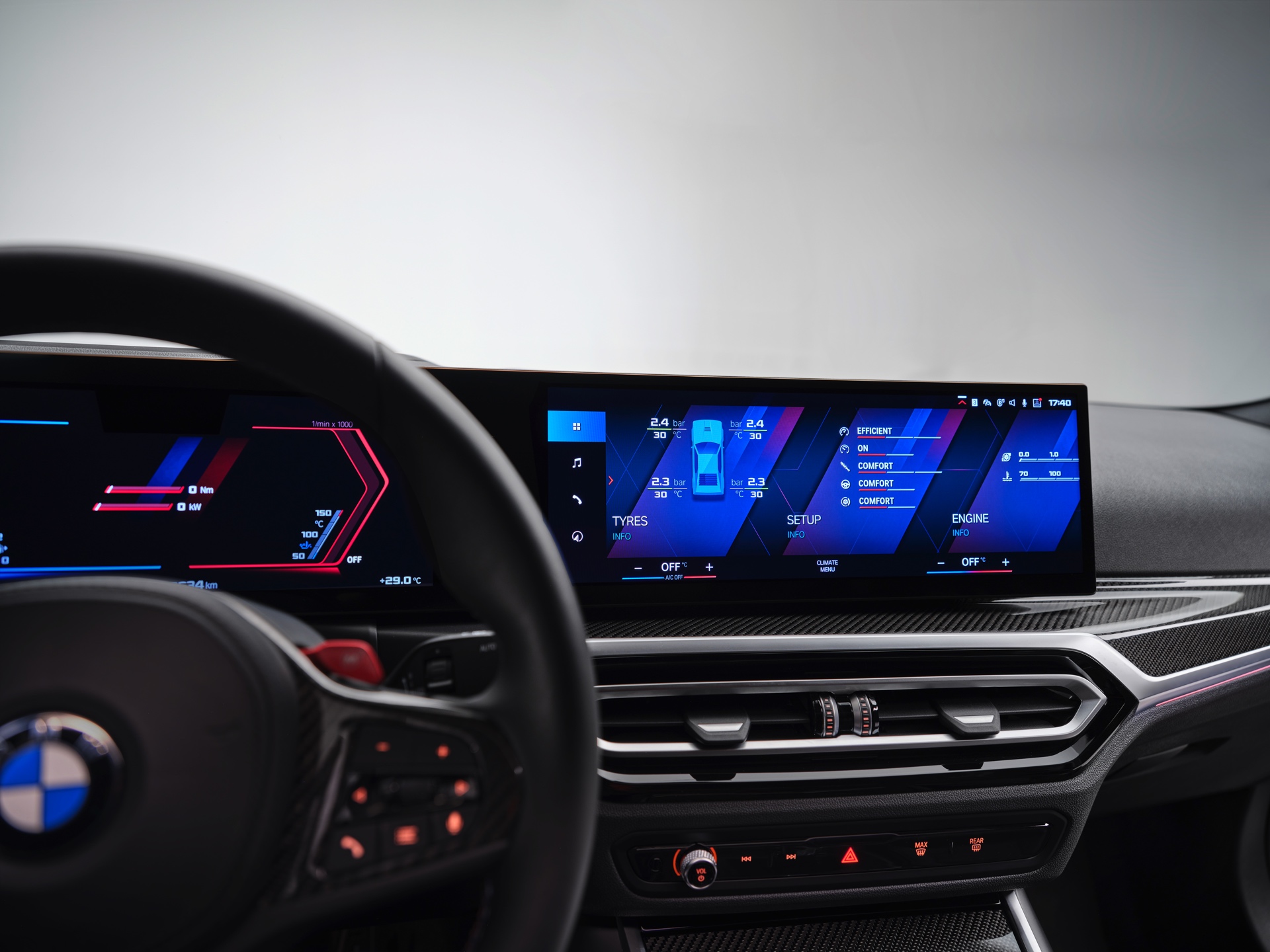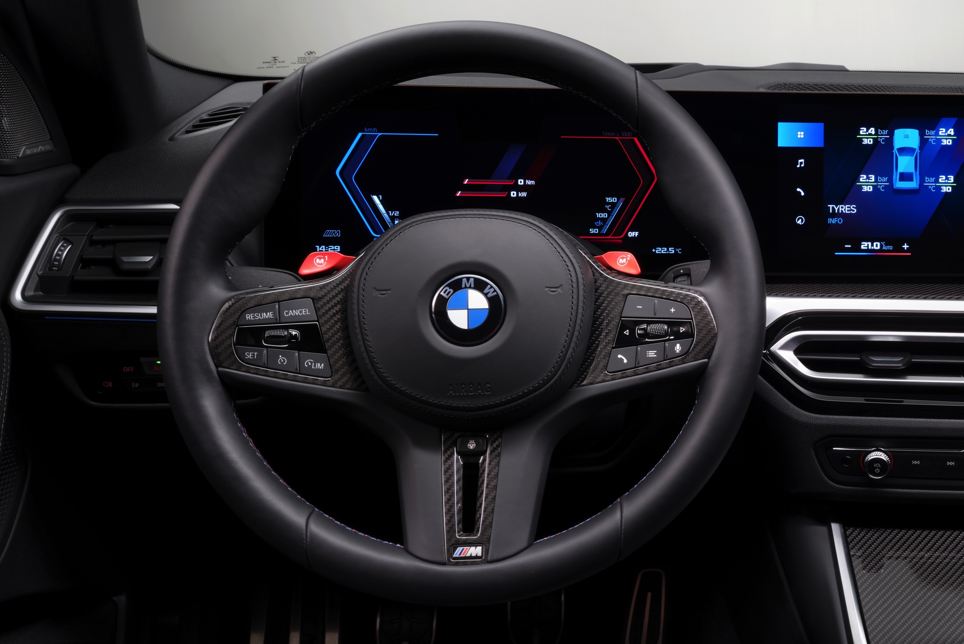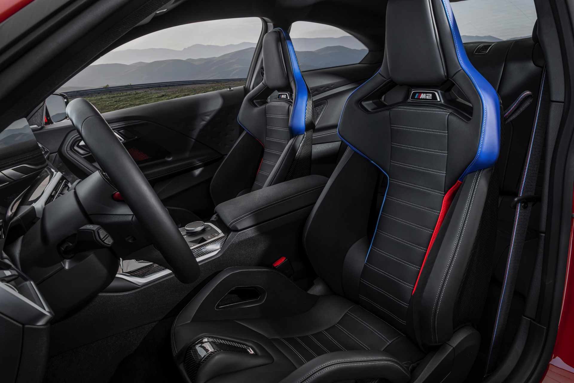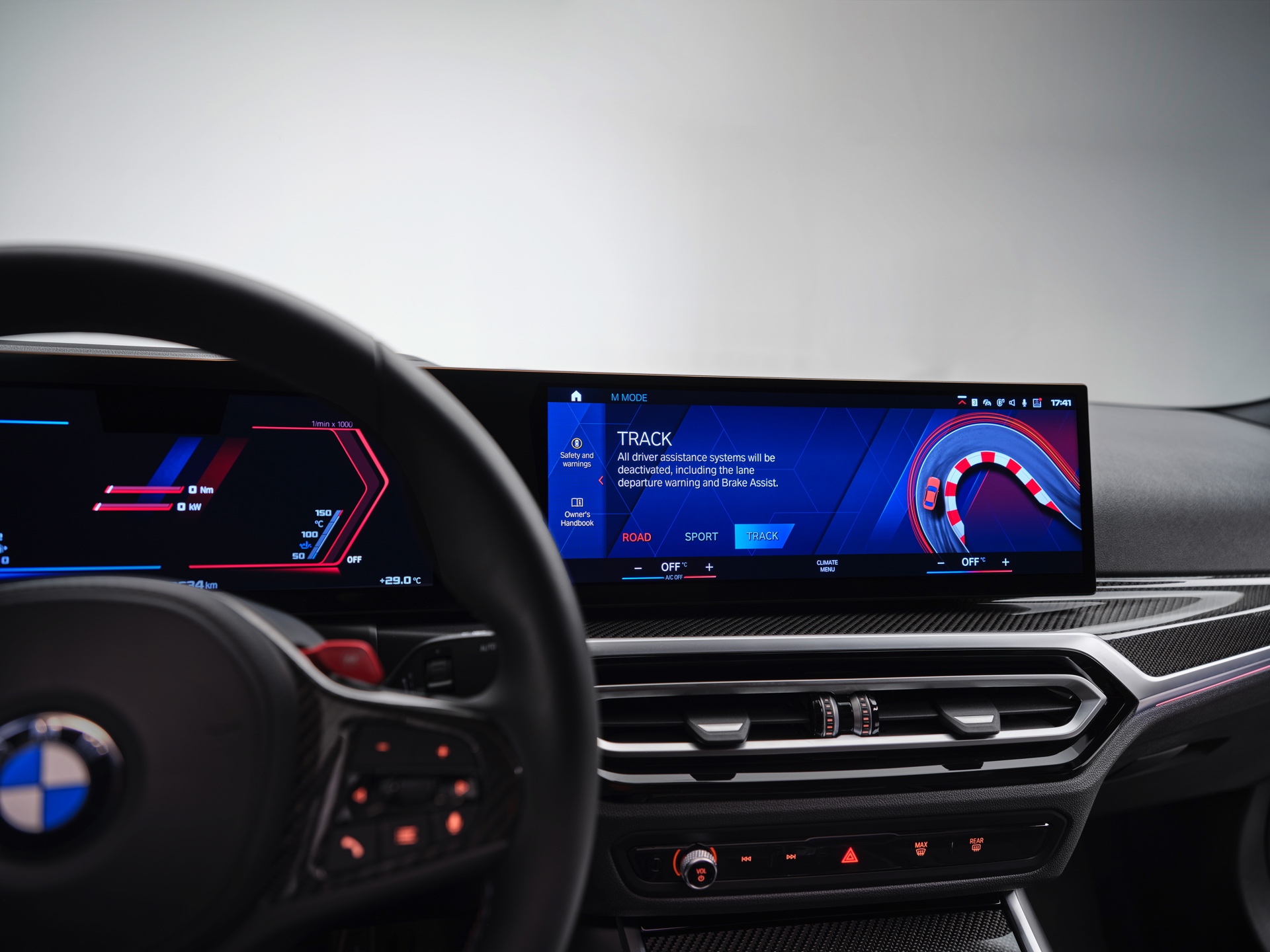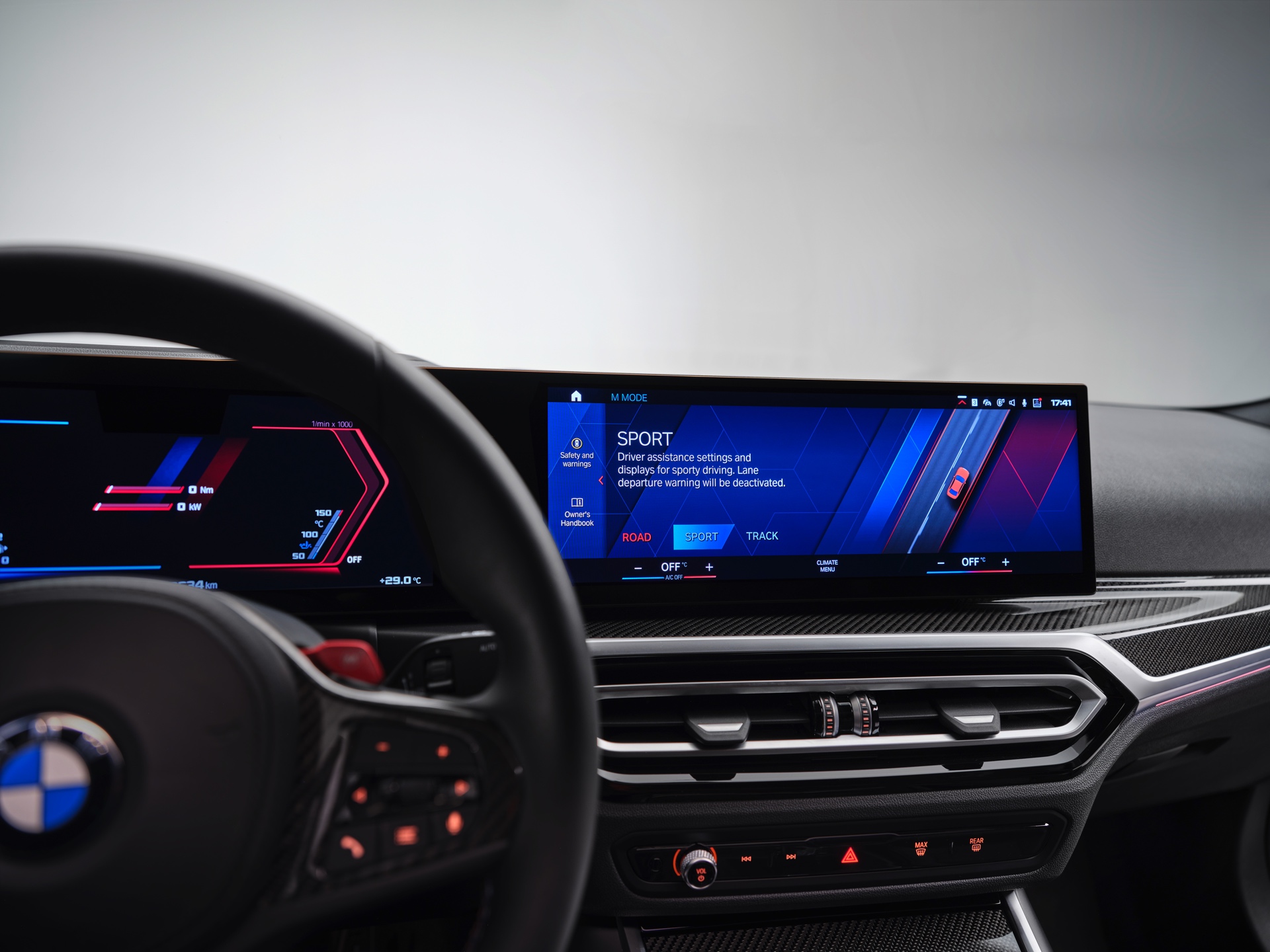 Highlights im Innenraum sind je nach Perspektive und persönlicher Gewichtung entweder das Curved-Display, die optionalen M Carbon-Schalensitze mit beleuchteten Logos und Details in M-Farben oder auch der im hochmodernen Cockpit fast etwas antiquiert wirkende Wählhebel für das manuelle Sechsgang-Getriebe. Traditionell überschaubar bleibt die Farbpalette für den Einstiegs-M: Mit Toronto Rot und Zandvoort Blau stehen zwei markante Farben zur Wahl, außerdem gibt es mit Alpinweiß, Saphirschwarz und Brooklyn Grau auch drei etwas gedecktere Farben.