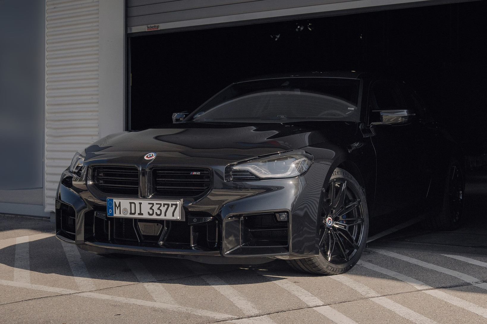 Ebenfalls in tiefem Schwarz glänzen die serienmäßig verbauten Felgen: Die vorne 19 und hinten 20 Zoll großen Leichtmetallräder im Design Doppelspeiche 930 M werden nur auf Wunsch und gegen 200 Euro Aufpreis mit glanzgedrehten Flächen ausgeliefert. Nur erahnen lässt sich auf den ersten Fotos, dass der schwarze BMW M2 auch über das optionale Carbon-Dach verfügt: Das Leichtbau-Feature an der höchsten Stelle des Fahrzeugs spart gegenüber dem Serien-Dach sechs Kilogramm ein und kostet 2.600 Euro Aufpreis, rein optisch wird es in Verbindung mit helleren Lackierungen aber naturgemäß stärker in Szene gesetzt.
