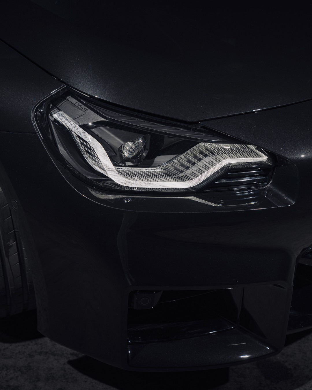 Beinahe ohne jeden farbigen Akzent und ganz in Schwarz präsentiert sich der neue BMW M2 (G87) auf den ersten Fotos, die den Kompaktsportler in Saphirschwarz Metallic zeigen. Wie schon M3 und M4 verzichtet auch der 460 PS starke M2 auf eine Einfassung für die Nieren, sodass die Karosseriefarbe direkt bis an die Lufteinlässe heranreicht. Auch die horizontalen Streben der Niere, deren Form und Look sich grundlegend vom regulären 2er Coupé (G42) unterscheidet, sind serienmäßig in Schwarz gehalten.