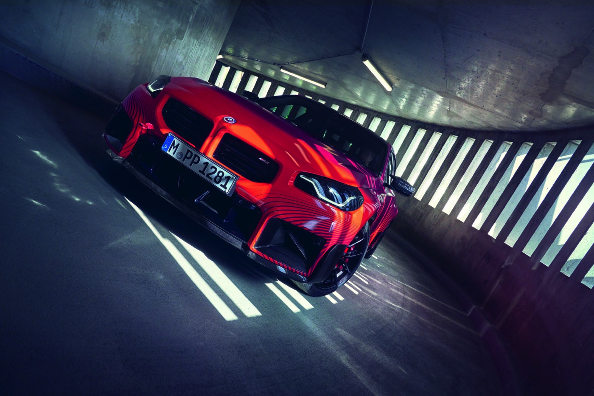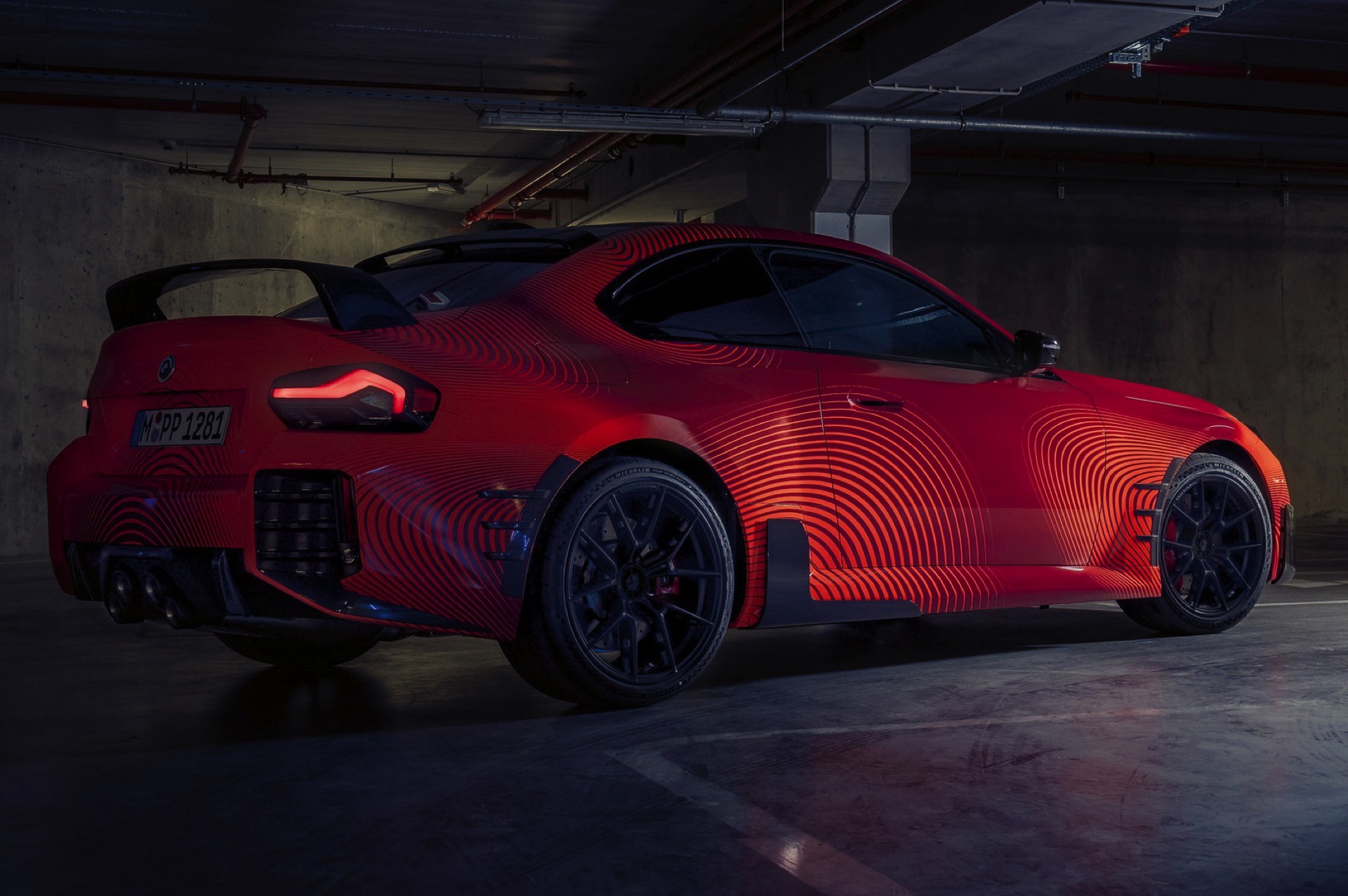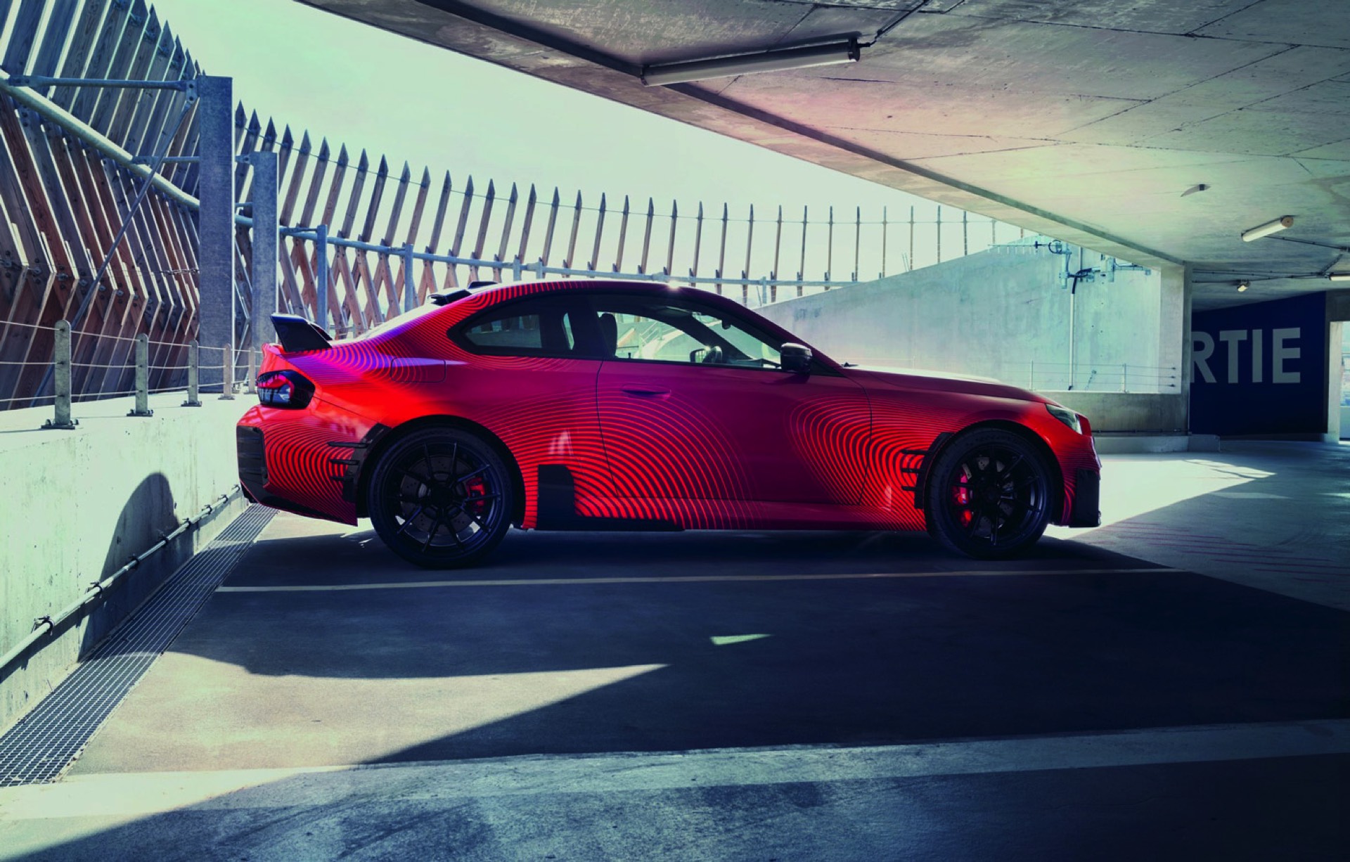 Wie viel Power im neuen BMW M2 (G87) steckt, soll man dem Kompaktsportler auf den ersten Blick ansehen. Dennoch gibt es Kunden, die immer nach einem noch lauteren Auftritt suchen – und genau diese sind die Zielgruppe für die M Performance Parts, die als erstes offizielles Tuning-Zubehör für die zweite M2-Generation angeboten werden. Auf den ersten offiziellen Fotos sehen wir den BMW M2 erneut mit Lackierung in Toronto Rot, aber die kräftige Farbe wird mit einer auffälligen Dekor-Beklebung kombiniert, die beinahe einen Mittelweg zwischen dem Look eines Rennwagens im Motorsport und einer Tarn-Folierung zu suchen scheint.