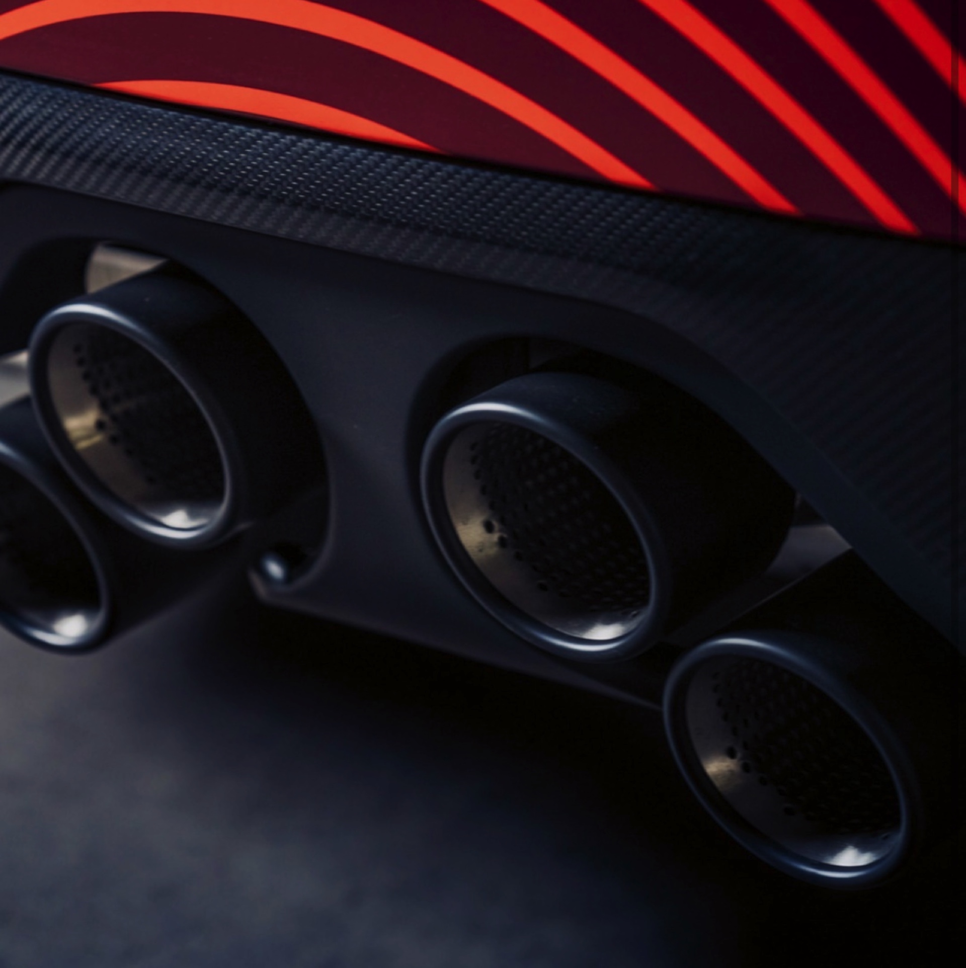 Wie im Rennsport präsentieren sich auch die Aerodynamik-Anbauteile, die den Look des BMW M2 (G87) nochmals dramatisch schärfen: Frontsplitter und seitliche Flaps für die Frontschürze, Aero-Aufsätze vor und hinter den angetriebenen Hinterrädern und ein mächtiger Einsatz für die äußeren Elemente der Heckschürze bewegen sich nah am Asphalt, eine Etage weiter oben sehen wir einen großen Dachkanten-Spoiler und einen noch größeren Heckflügel zur Steigerung der aerodynamischen Stabilität an der Hinterachse. Gekrönt wird der fulminante Auftritt von der BMW M Performance Abgas-Anlage mit vier Endrohren, die in Trapezform angeordnet sind und den endgültigen Abschied von jeder Form der Zurückhaltung betonen.