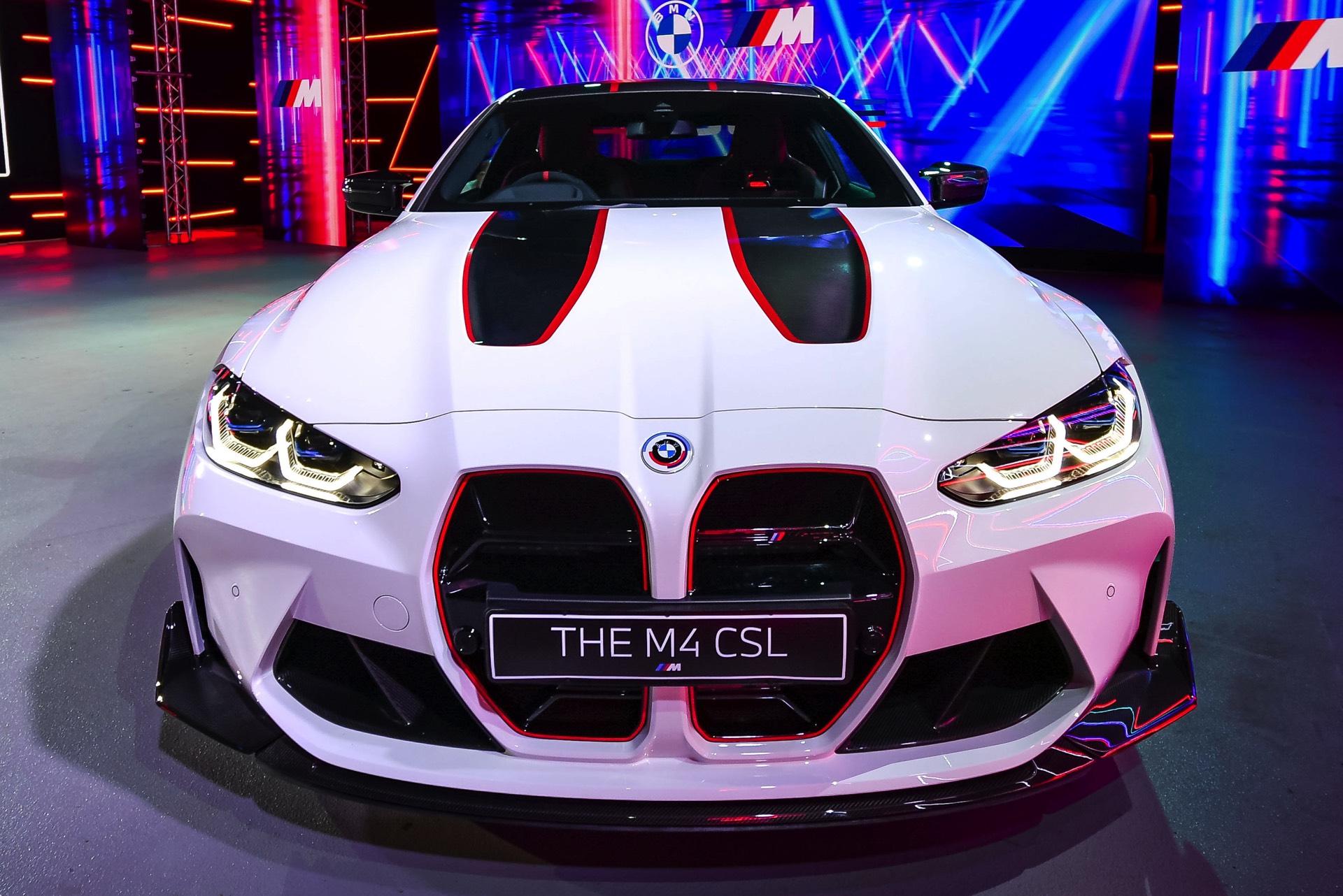 Die bisher am seltensten gezeigte Farbe für den BMW M4 CSL (G82) ist ohne Frage Alpinweiß, aber neben Frozen Brooklyn Grey und Saphirschwarz besitzt auch Weiß ganz spezielle Reize: Vor allem die sichtbaren Carbon-Elemente, an einigen Stellen von einer dünnen roten Akzentlinie eingefasst, sorgen dabei für scharfe Kontraste zur hellen Lackierung und weisen besonders stark auf die besonderen Details des CSL hin. Hingucker Nummer 1 ist dabei zweifellos die Carbon-Motorhaube, deren Flächen in Sicht-Carbon die von der großen Doppel-Niere gesetzten Linien aufgreifen und den Blick in Richtung des ebenfalls aus Carbon gefertigten Dachs lenken.