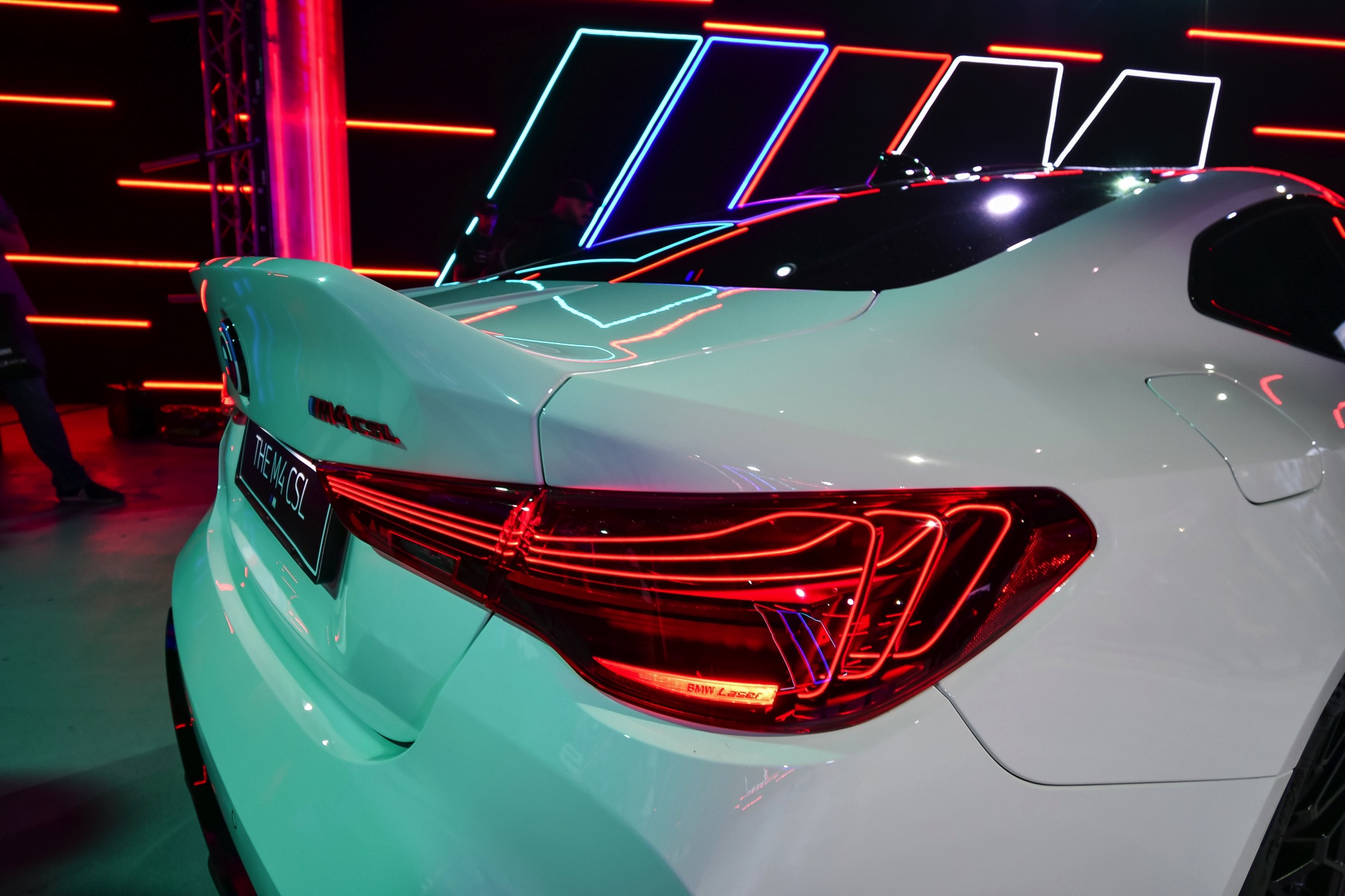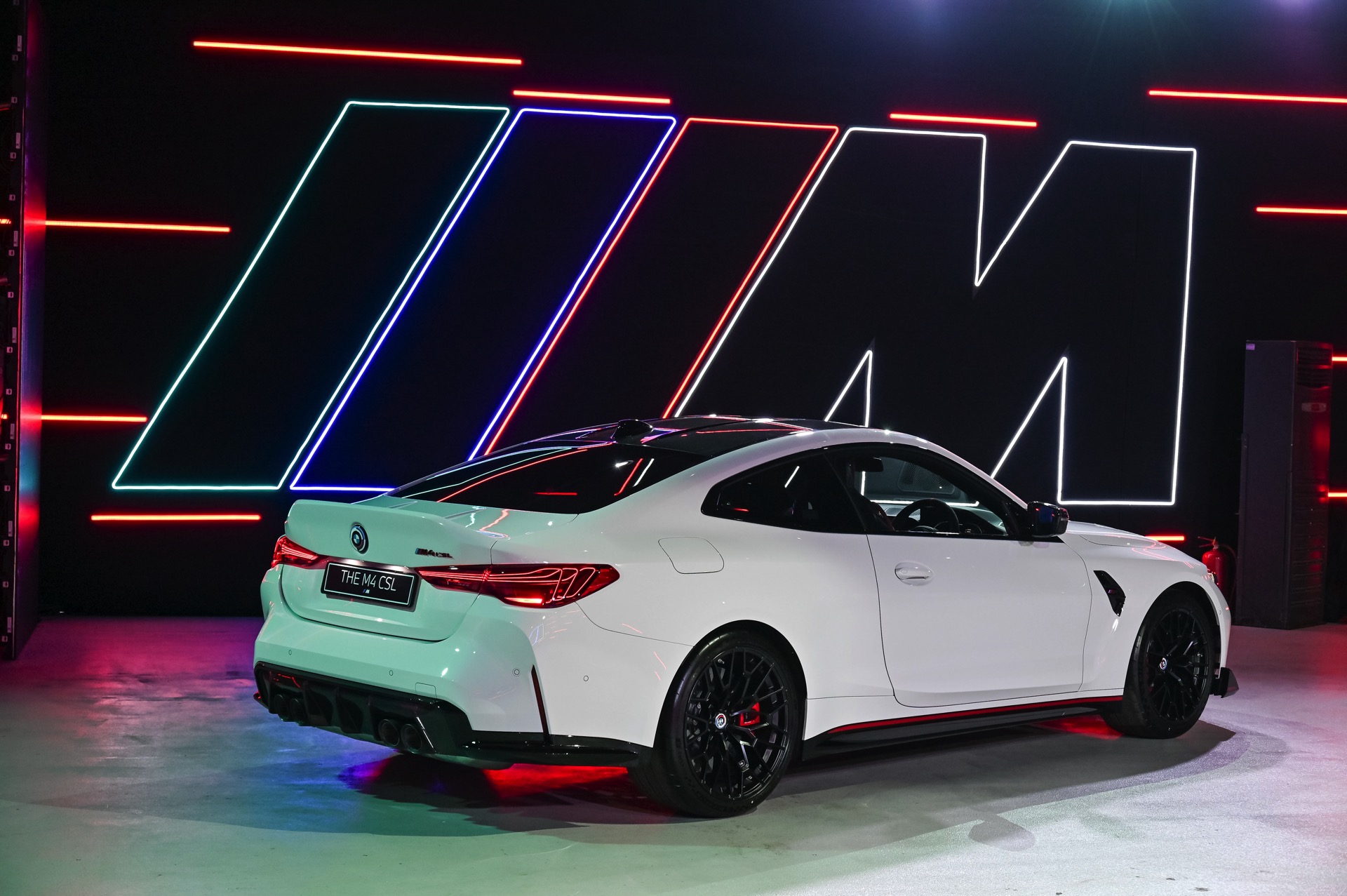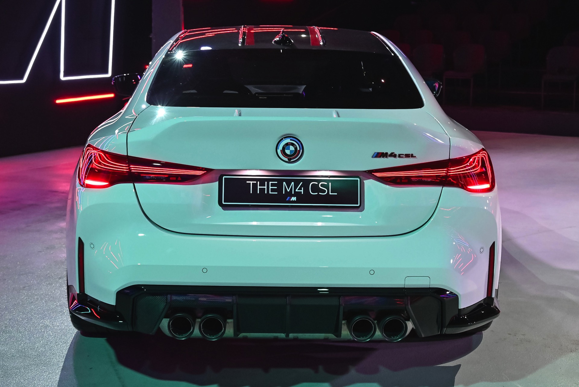 Auch der Frontsplitter und die Seitenschweller verfügen genau wie die Niereneinfassung über rote Akzente, die den besonderen Anspruch des BMW M4 CSL unterstreichen. Absolutes Highlight am Heck ist die Kofferraum-Haube aus Carbon, die mit ihrem markanten Bürzel Aerodynamik sichtbar macht. Bei Dunkelheit rücken außerdem die exklusiv dem CSL vorbehaltenen Heckleuchten mit ihren filigranen Laser-Elementen in den Fokus und sorgen für eine weitere Abgrenzung vom “gewöhnlichen” M4.