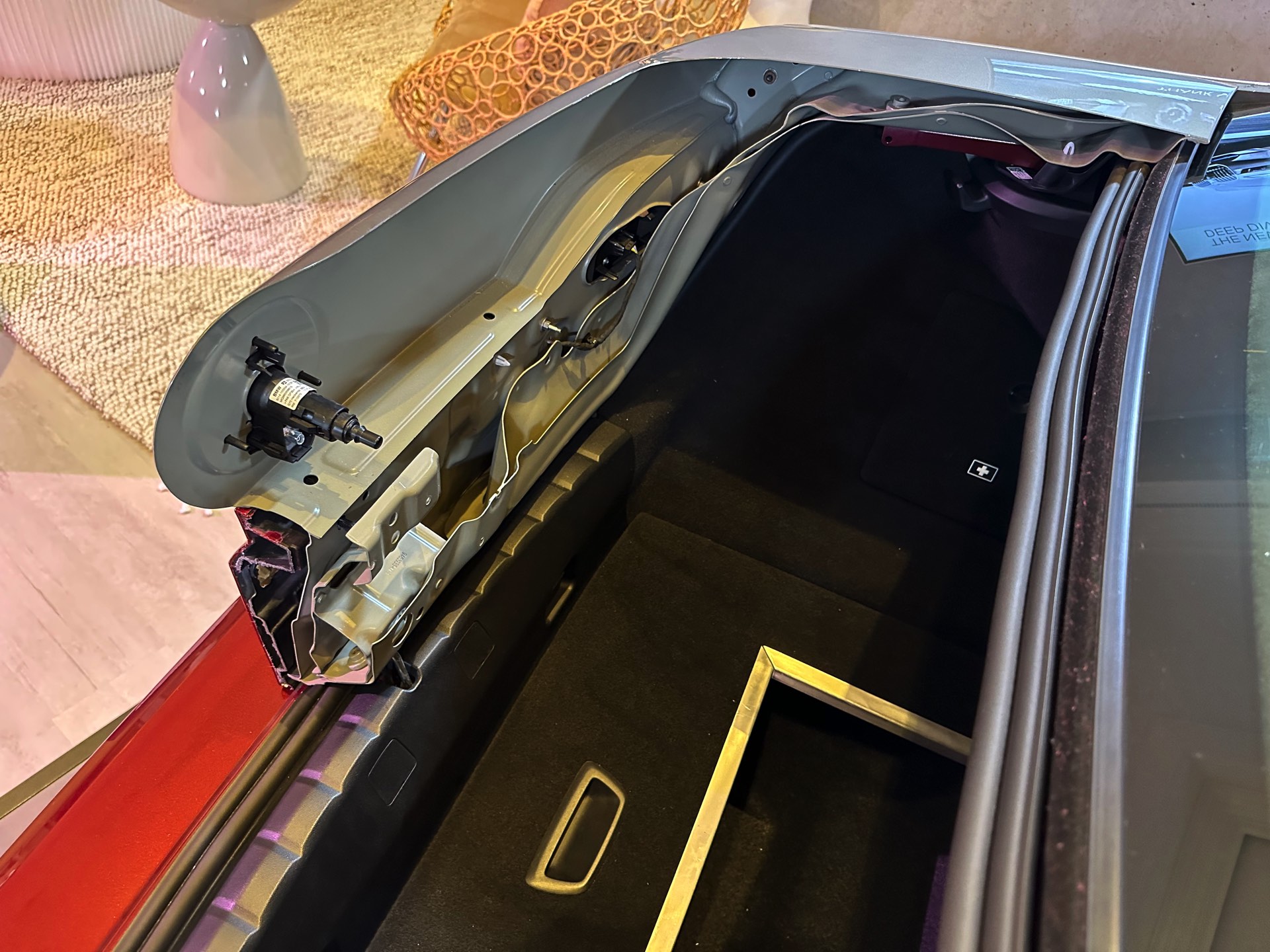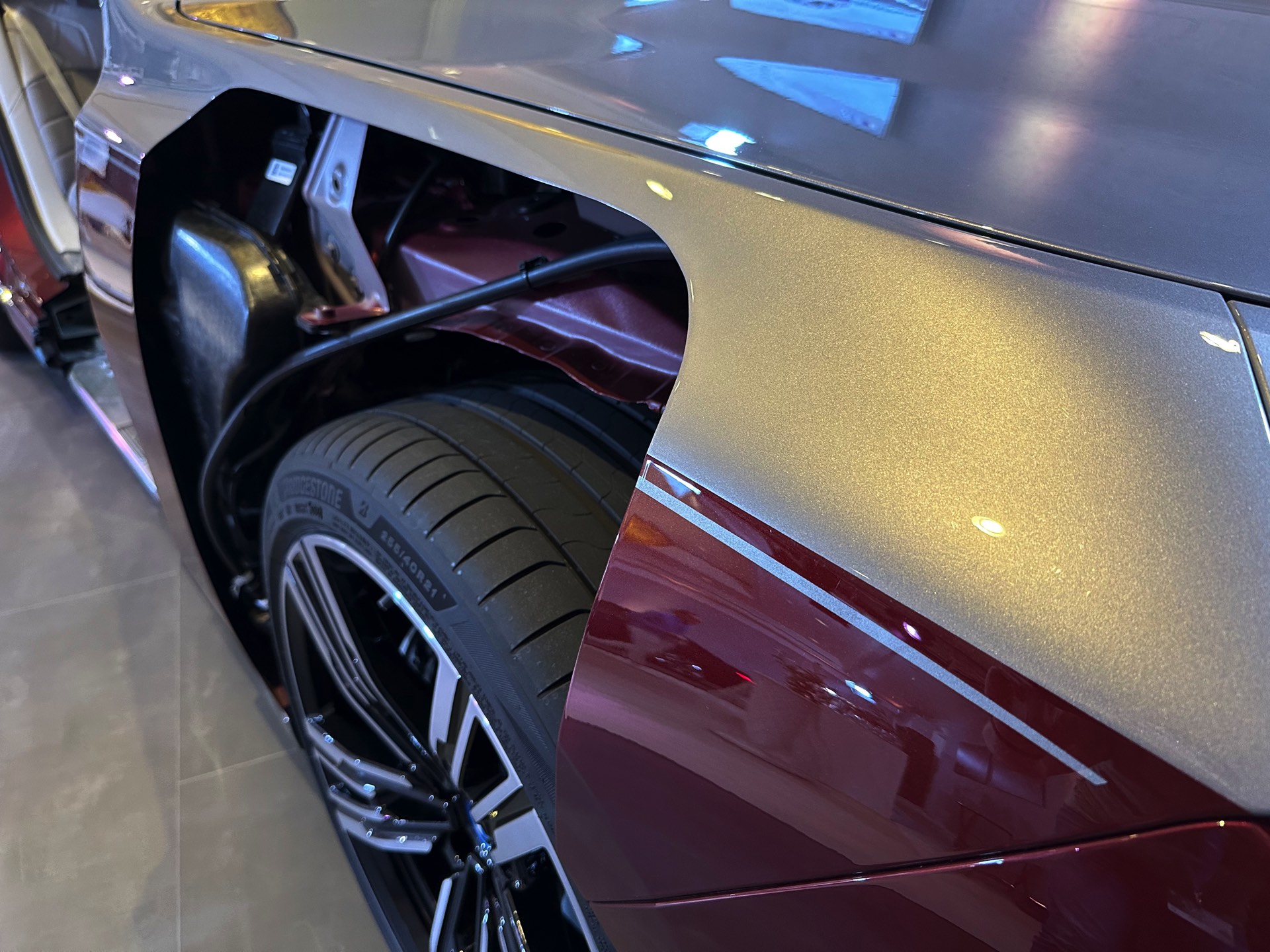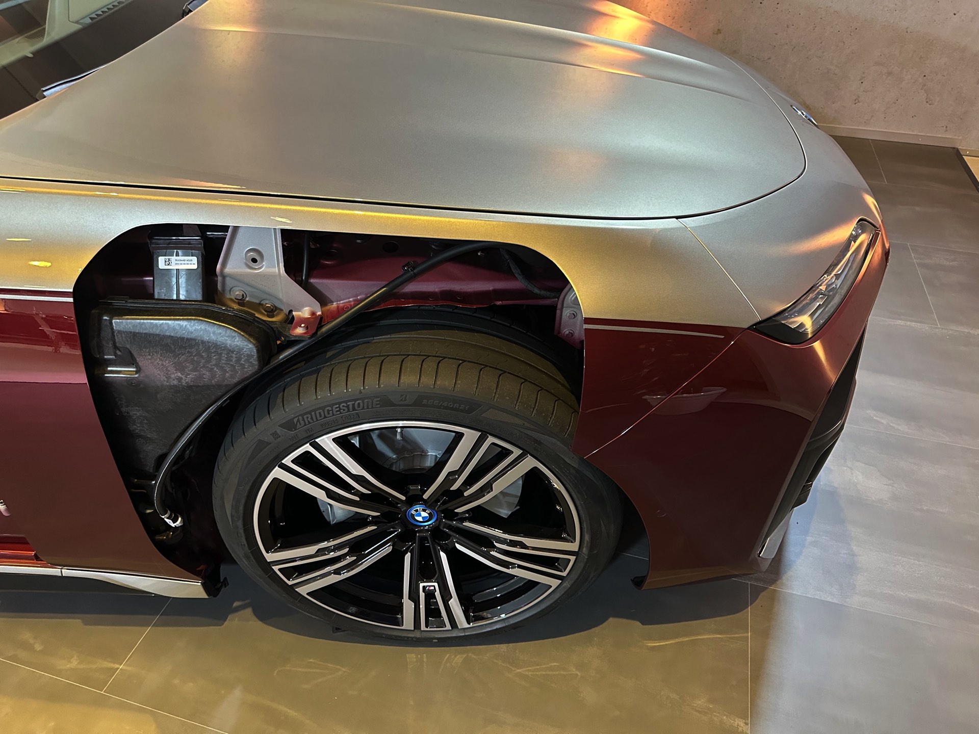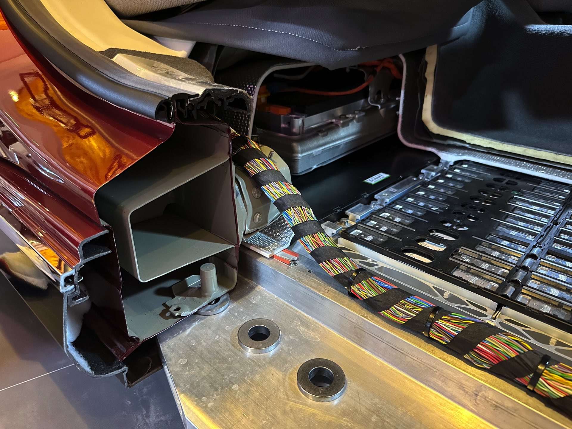 Um den Akku auch im Fall schwerer Unfälle bestmöglich zu schützen, ist er von verschweißten Aluminium-Strangpress-Profilen umgeben. Im Normalfall bleiben diese aber genau wie viele andere Details ihr komplettes Autoleben lang unsichtbar unter der Außenhaut verborgen, während sich die Blicke neugieriger Betrachter an der Two-Tone-Lackierung in Oxidsilber und Aventurinrot erfreuen können.