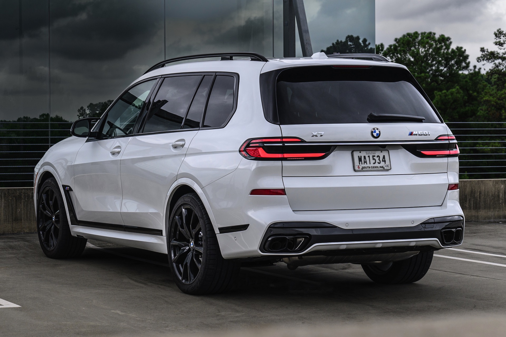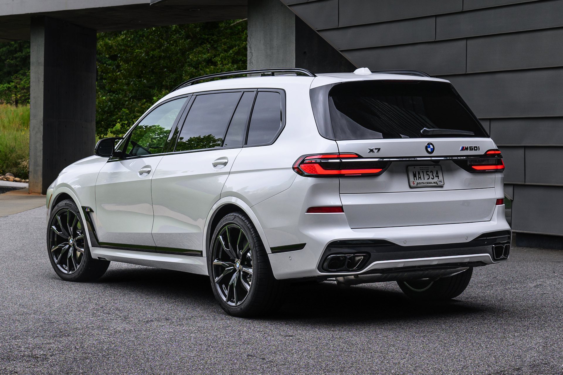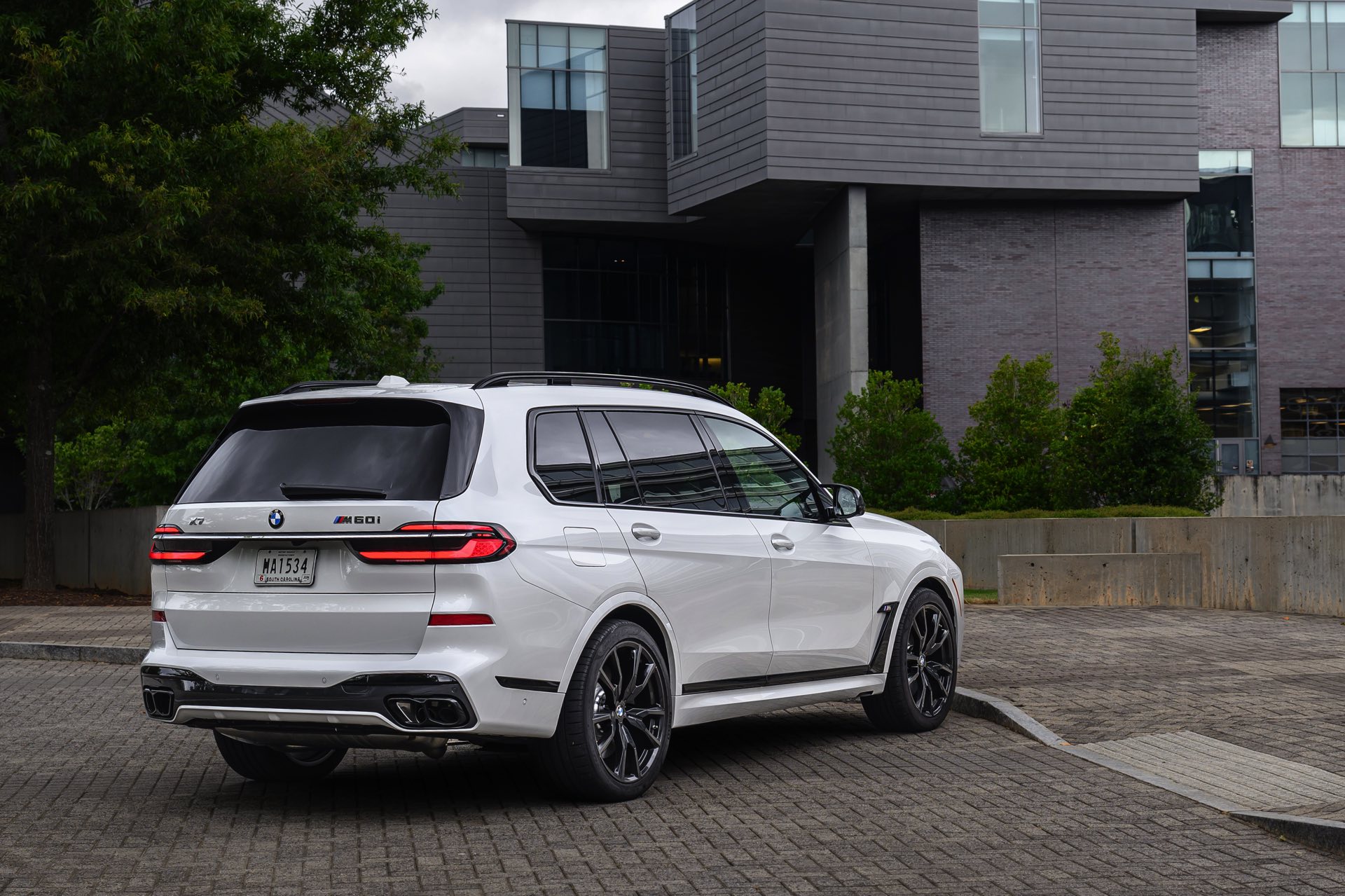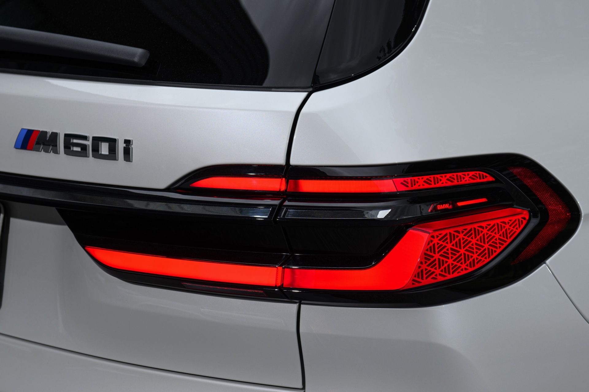Am Heck trägt der überarbeitete X7 neue Heckleuchten und eine zum Teil unter ihrem Glas verborgene Zierleiste auf voller Breite, Hingucker des gezeigten Fahrzeugs sind aber zweifellos die vier Endrohre des Topmodells M60i.