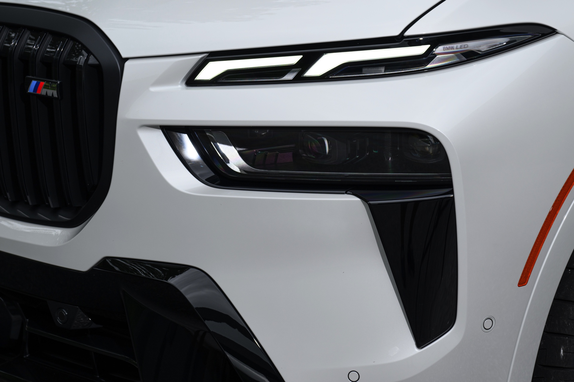 Einen genaueren Blick verdienen die Split Headlights, die den X7 seit dem Facelift noch stärker in die Nähe der 7er-Reihe rücken und damit von den kleineren Baureihen abgrenzen: In Verbindung mit der weißen Lackierung entsteht unterhalb der schmalen Tagfahrlicht- und Blinker-Elemente eine Art schwarzer Haken in umgekehrter L-Form, der neben den eigentlichen Hauptscheinwerfern auch die Lufteinlässe für die Air Curtains rund um die Vorderräder beherbergt. "