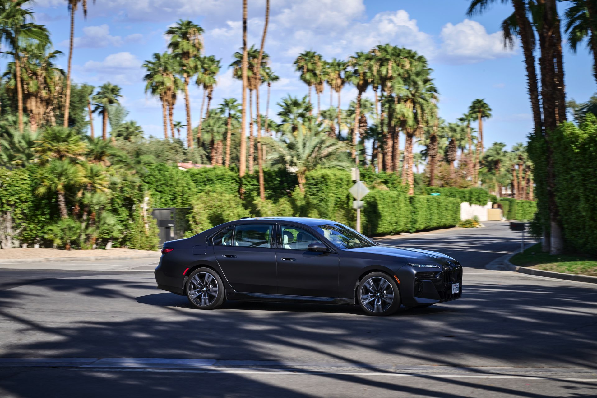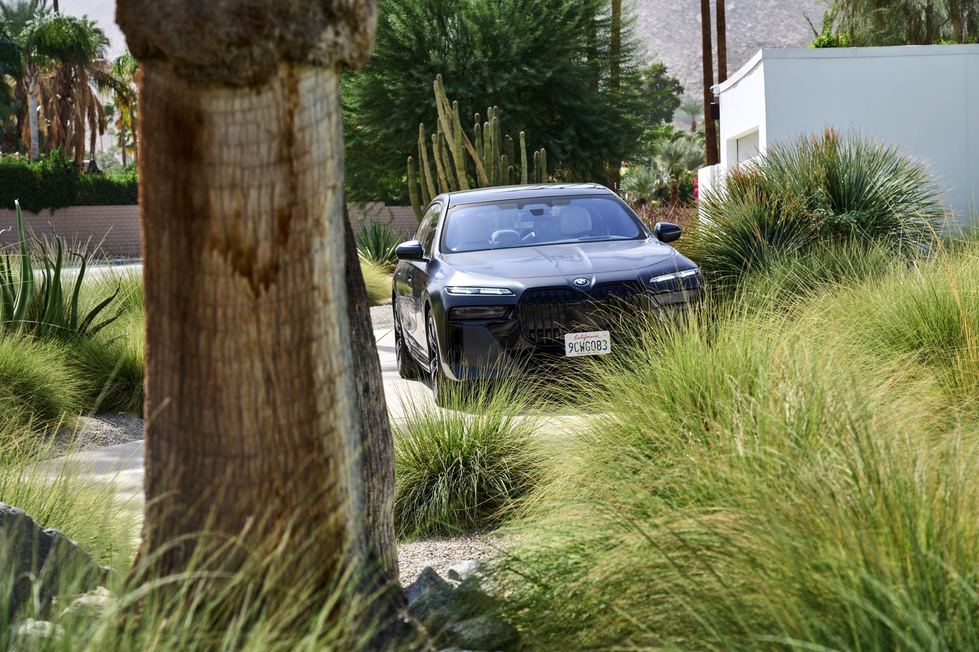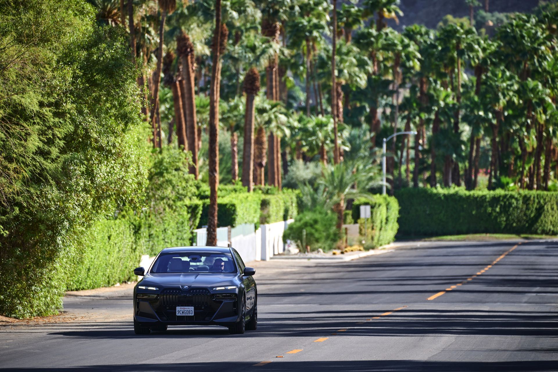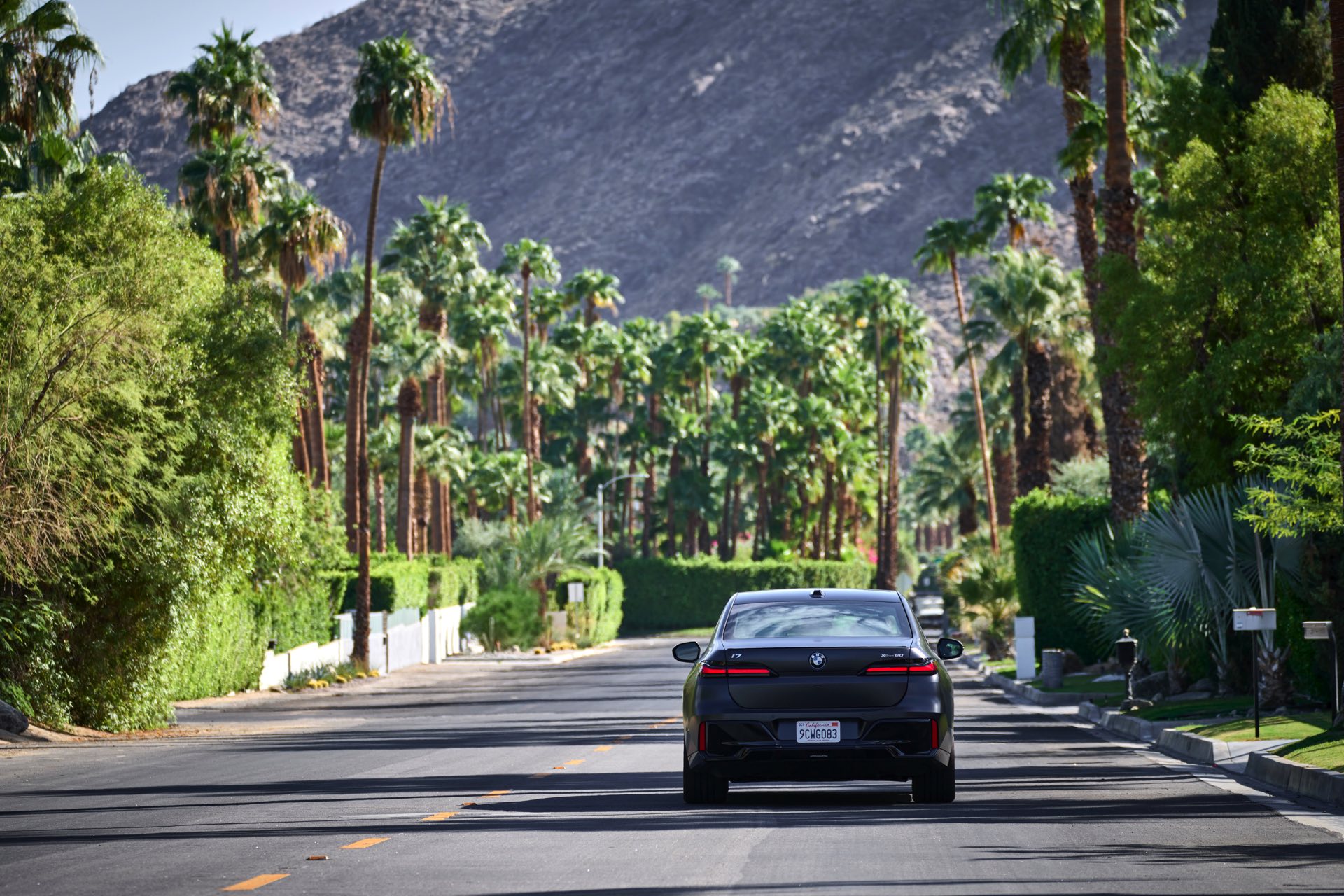 Komfort allein genügt allerdings nicht, um die Kunden eines BMW 7er zu überzeugen: Wer sich für den Bayern und gegen die Mercedes S-Klasse entscheidet, darf auch mehr Freude am Fahren erwarten. Auf den kurvigen Bergstraßen rund um Palm Springs kann der BMW i7 bereits andeuten, dass er diesem Anspruch Gerecht werden will: Wer den MyMode Sport aktiviert, wechselt den Charakter der Limousine auf Knopfdruck und verabschiedet sich mit Nachdruck vom komfortablen Gleiter, in dem er eben noch saß: Die aggressivere Gaspedalkennlinie, die mehr Kraft fordernde Lenkung und das straffer ansprechende Fahrwerk machen den i7 sofort erheblich fahraktiver.