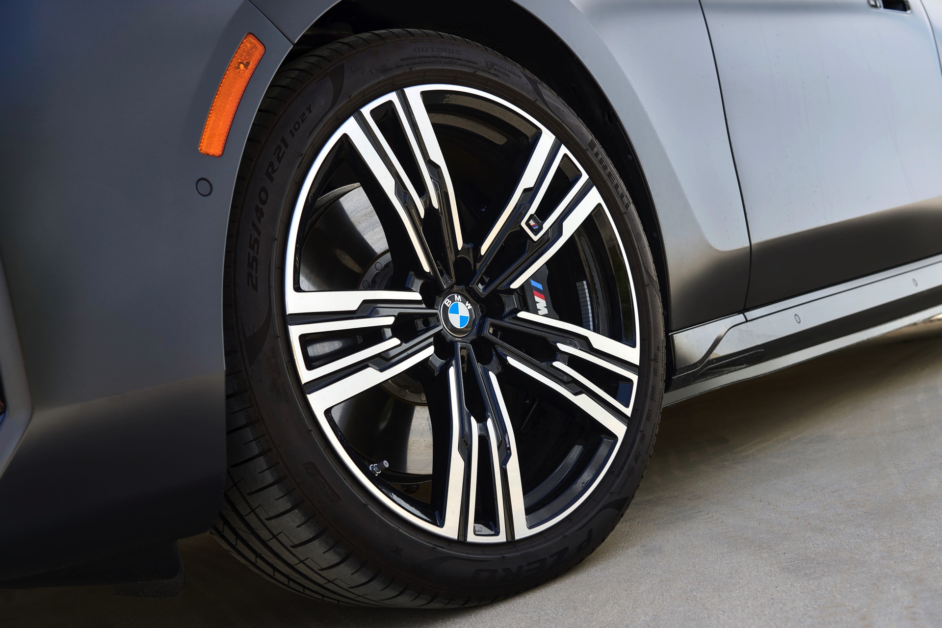 Ebenso unmissverständlich ist die Präsenz, mit der der neue BMW i7 auftritt. Unser Testwagen mit matter Lackierung in Frozen Deep Grey sowie M Sportpaket Pro wirkt auf den ersten Blick wie der Dienstwagen von Darth Vader, vermeidet fast jede unnötige Reflektion und blickt mit seinen extrem schmal gezeichneten Scheinwerfer-Elementen fokussiert nach vorn. In der Realität ist die Wirkung noch dramatischer, schließlich überragt die Luxuslimousine mit einer Länge von 5,39 Metern selbst die Langversion des Vorgängers um stattliche 13 Zentimeter und hat auch in Höhe und Breite um jeweils fünf Zentimeter zugelegt. Dass selbst 21 Zoll große Felgen in den Radhäusern der neuen 7er-Reihe beinahe etwas zierlich wirken, unterstreicht die Dimensionen des Fahrzeugs eindrucksvoll.