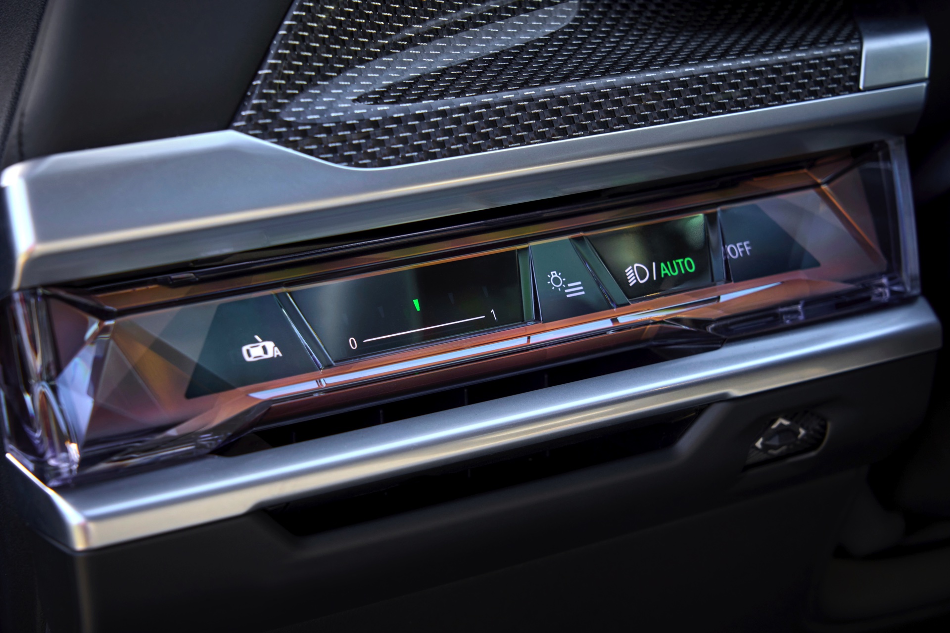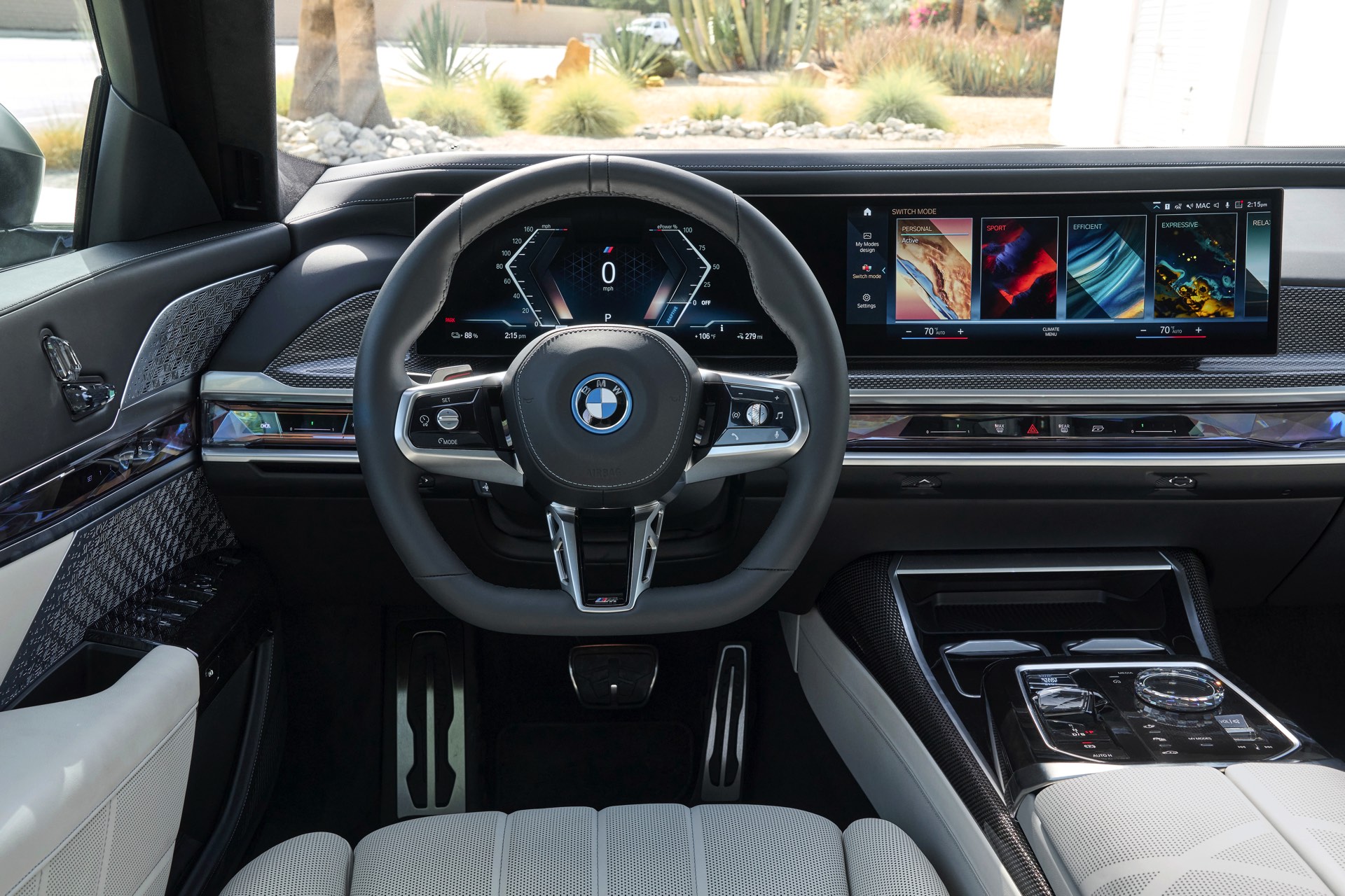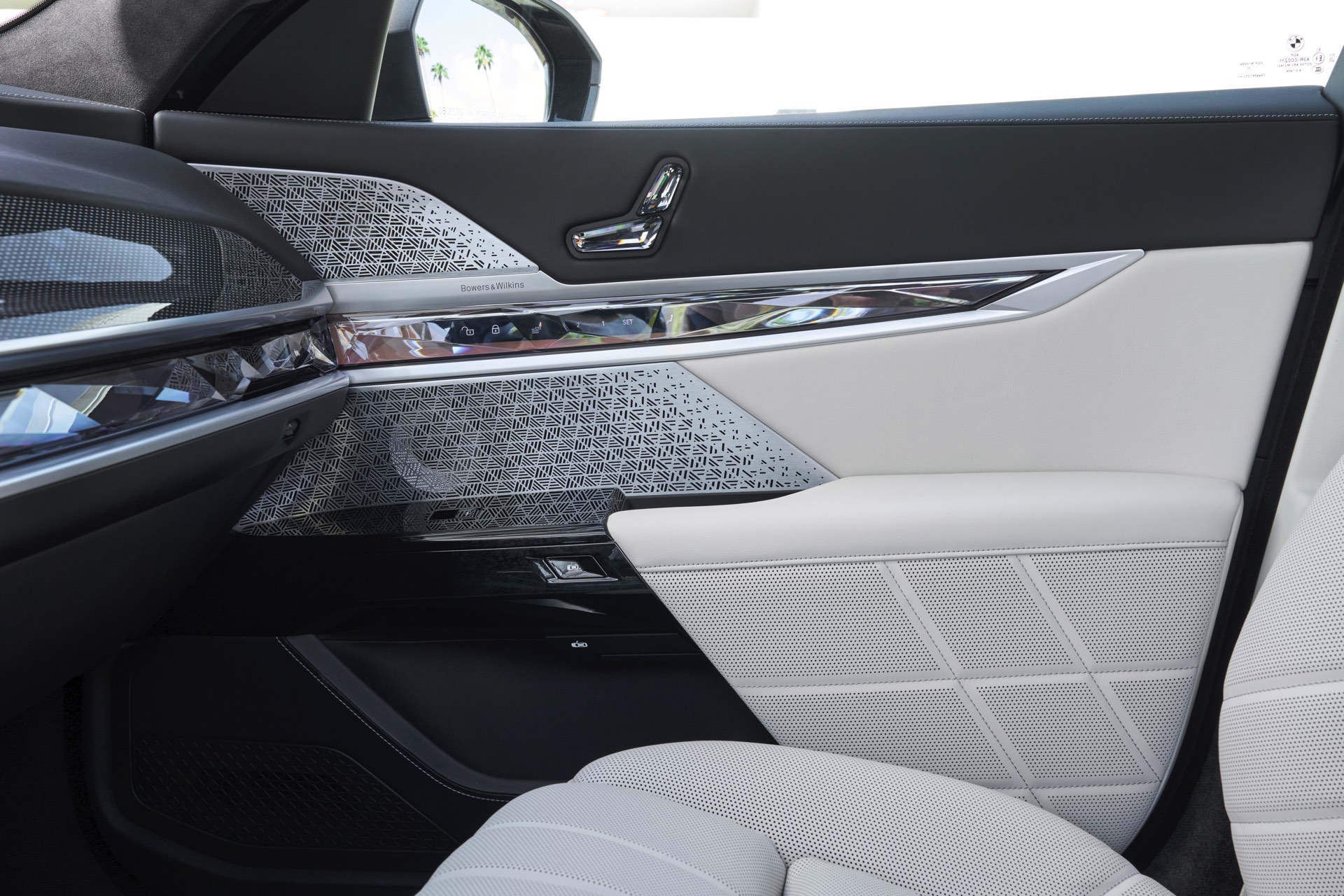 Aber zurück in die erste Reihe: Wer den iX und andere aktuelle Modelle kennt, fühlt sich im Cockpit des BMW i7 sofort heimisch. Das große Curved-Display und die neue Mittelkonsole sind inzwischen vertraute Elemente, neu ist lediglich die sogenannte Interaction Bar unterhalb des großen Displays. Die interaktive Interieurleiste lässt sich nicht nur farbig beleuchten, sie ist auch mit diversen Funktionen belegt. Hinzu kommt eine deutlich tiefere Sitzposition als im iX, wodurch der i7 den Fahrer deutlich stärker einbindet.