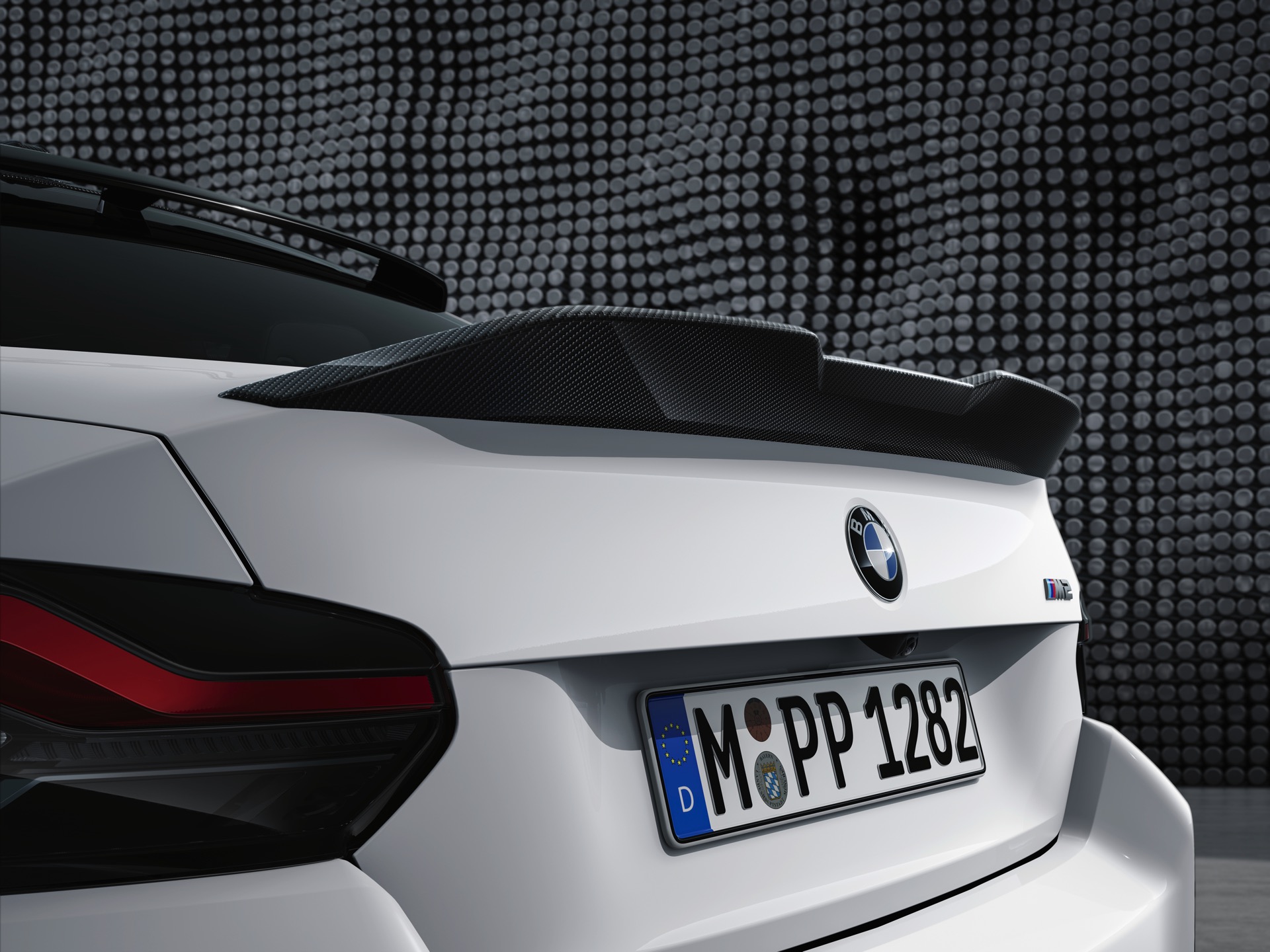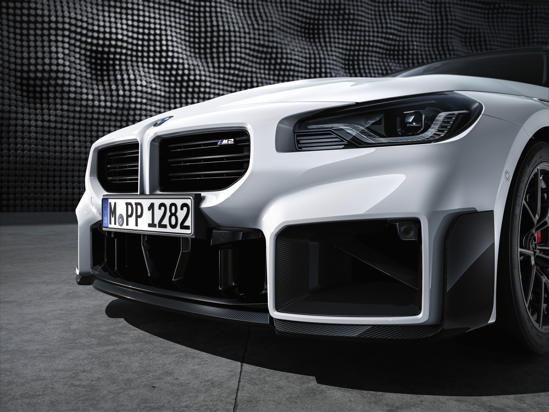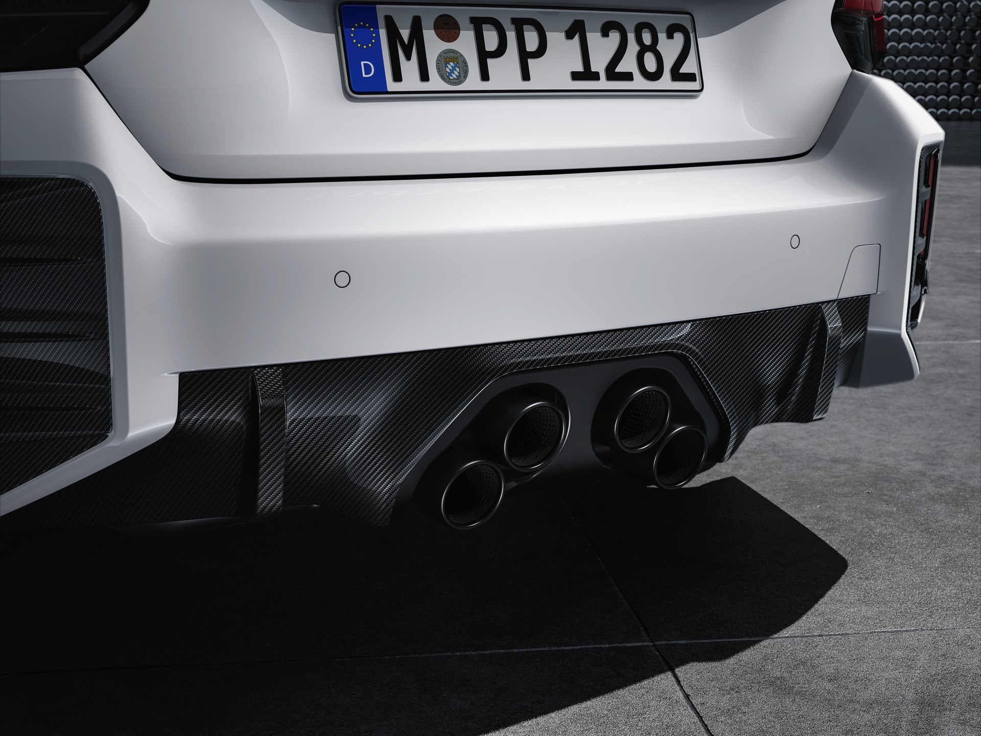 Für noch mehr Performance auf der Rennstrecke sorgen auch diverse Leichtbau-Optionen, die für den BMW M2 (G87) erhältlich sind: Das Carbon-Dach (2.600 Euro) spart sechs Kilogramm an der höchsten Stelle des Fahrzeugs, die M Carbon-Schalensitze (4.500 Euro) sind im Vergleich zum Seriensitz sogar 10,8 Kilogramm leichter und die markante Klappen-Abgasanlage aus dem M Performance-Programm spart weitere 8 Kilogramm ein.