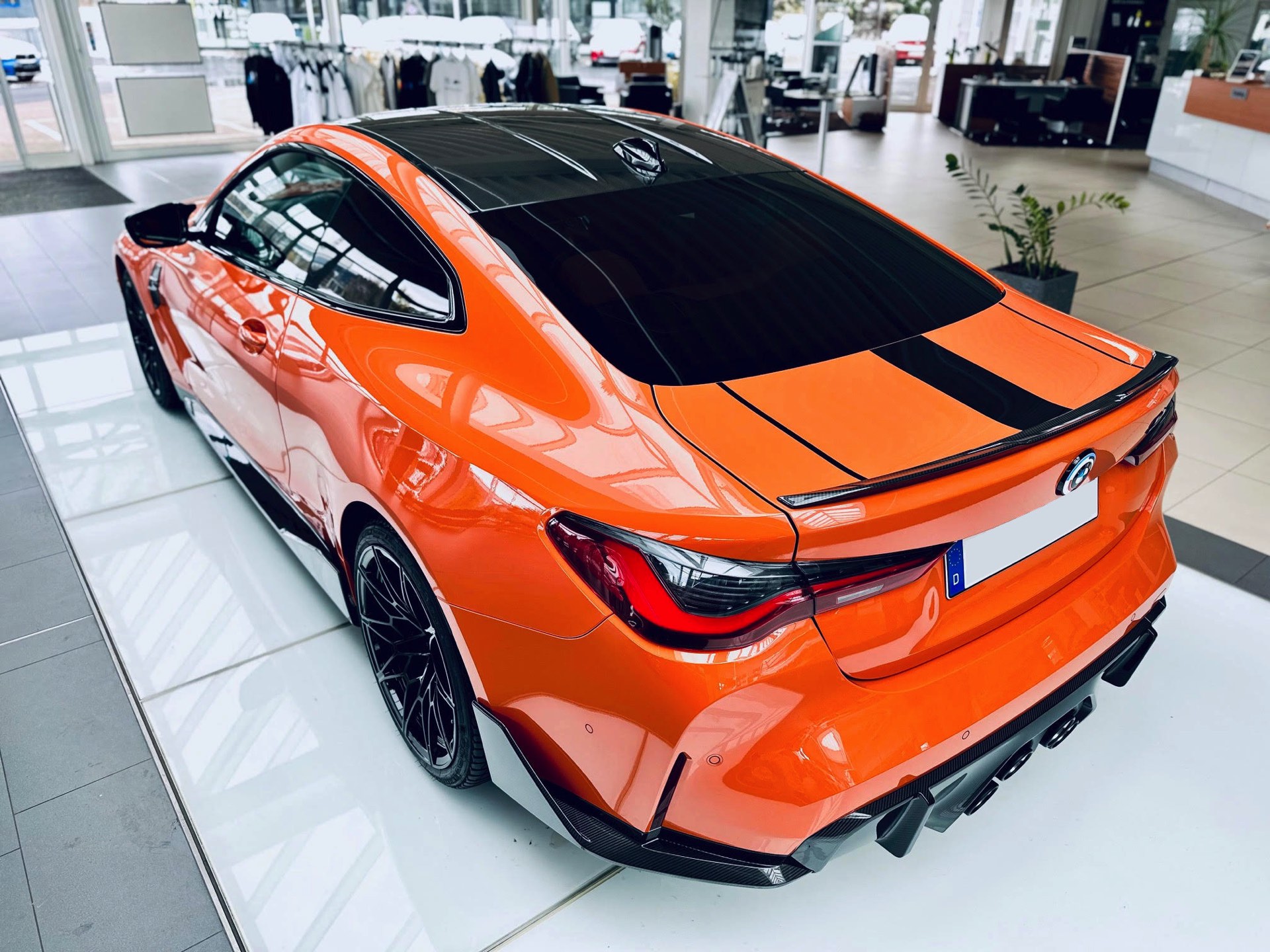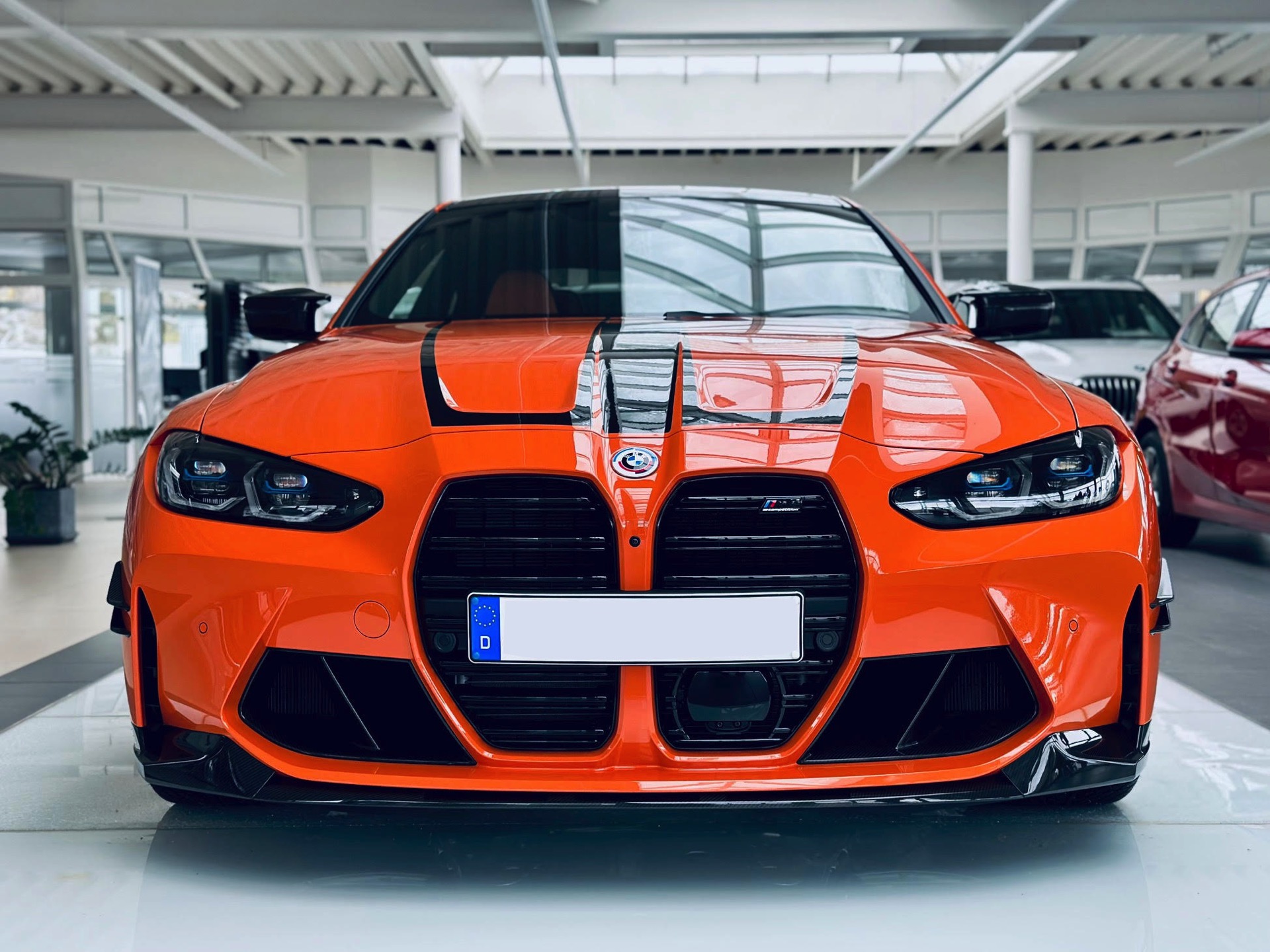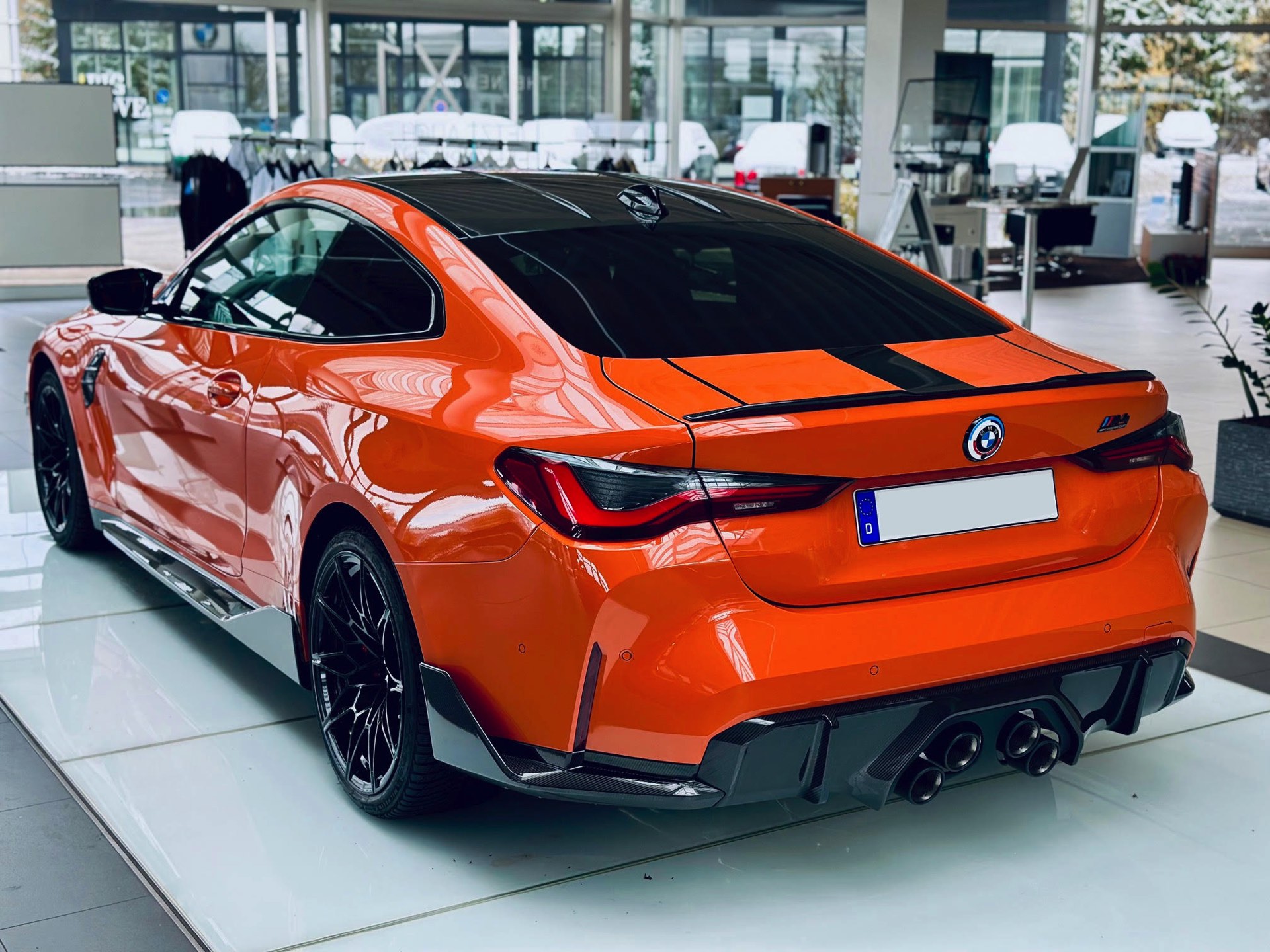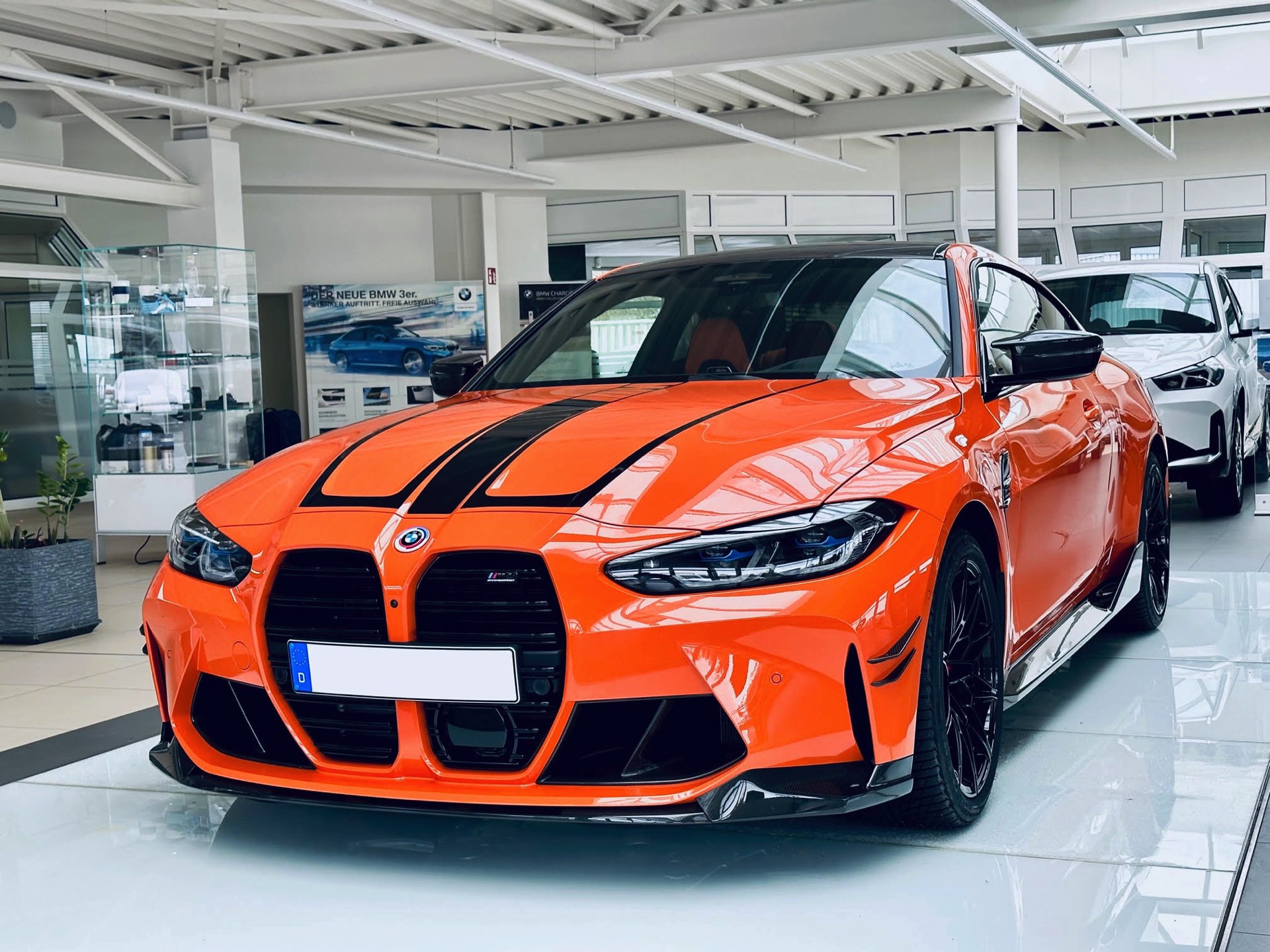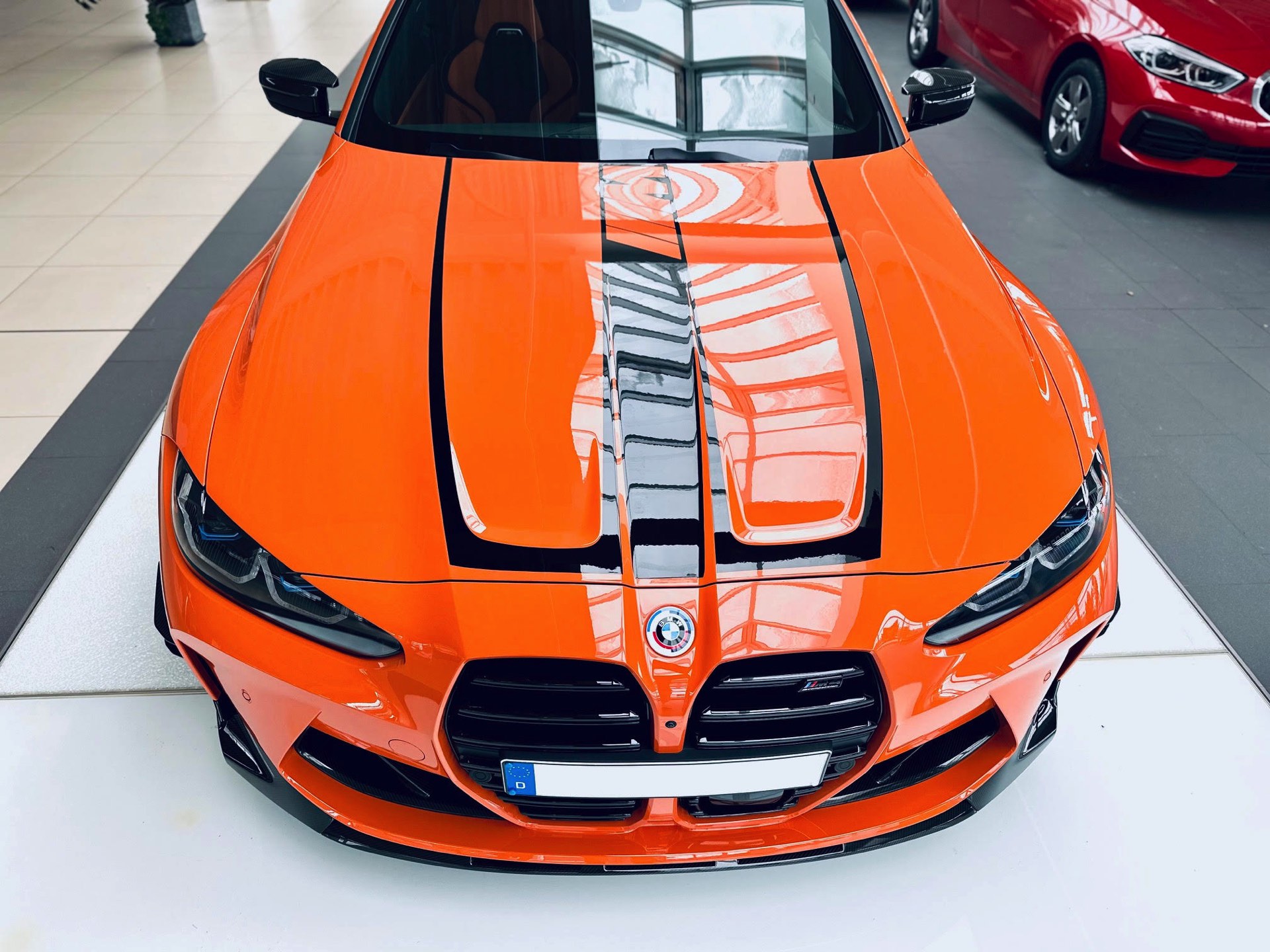 Understatement? Nein Danke! Dieser BMW M4 (G82) mit Individual-Lackierung in Feuerorange und M Performance Tuning-Parts liebt den lauten Auftritt und zeigt, wie extrem sich das Sportcoupé aus Garching gestalten lässt: Bei der im Kundenauftrag realisierten Konfiguration wurde wirklich an jede Option gedacht, die den M4 noch auffälliger machen kann – natürlich darf dabei auch die exklusive M Grafik in schwarzer Kontrastfarbe nicht fehlen, deren neuartige Lackiertechnik kürzlich mit dem Supplier Innovation Award ausgezeichnet wurde und die für 1.800 Euro Aufpreis bestellbar ist. Das aktuelle Beispiel aus dem Showroom der Autohaus Matthes Gruppe in Suhl zeigt, dass die neue Option gerade in Verbindung mit einer extrovertierten Farbe wie Feuerorange das Zeug zum absoluten Hingucker hat.