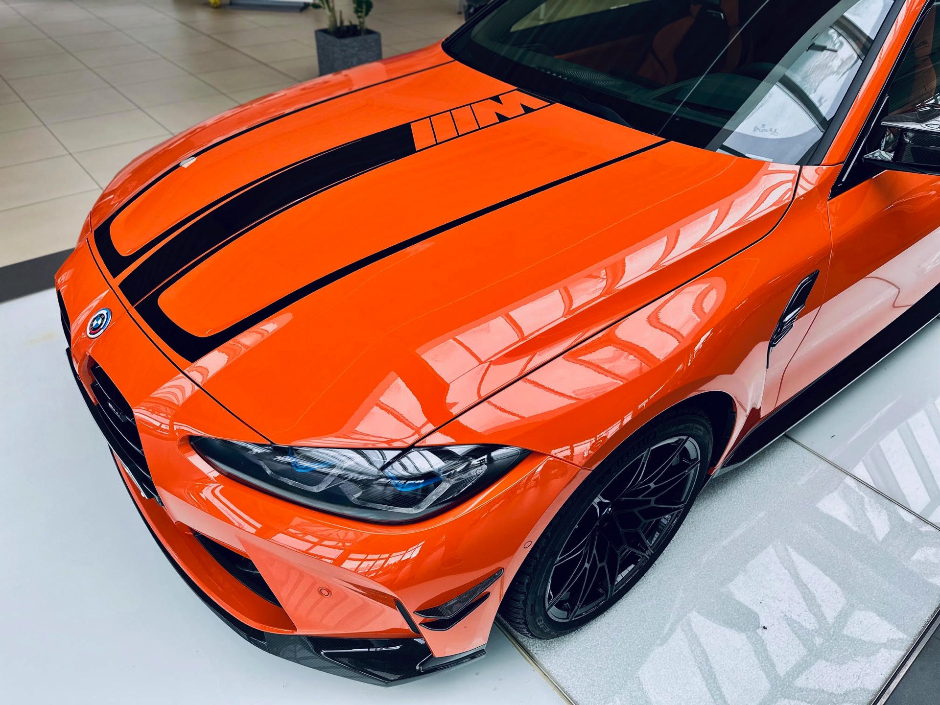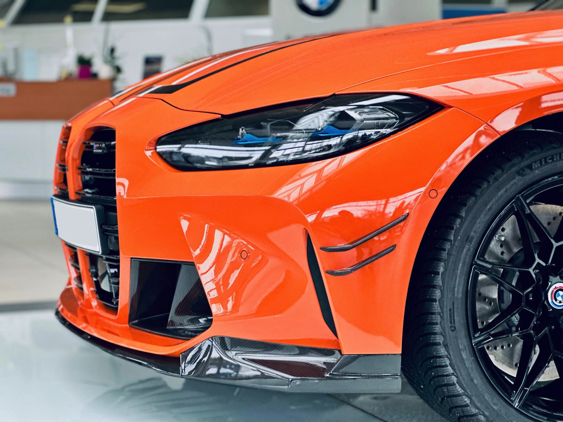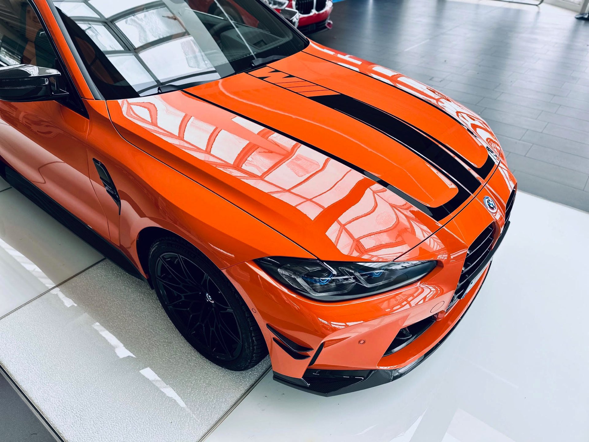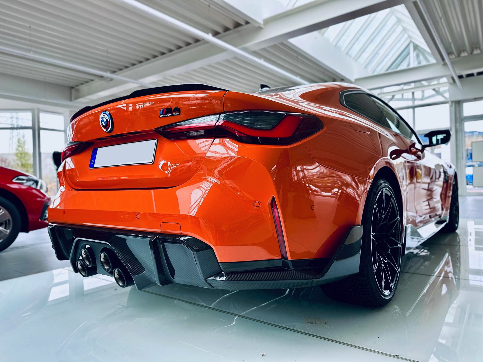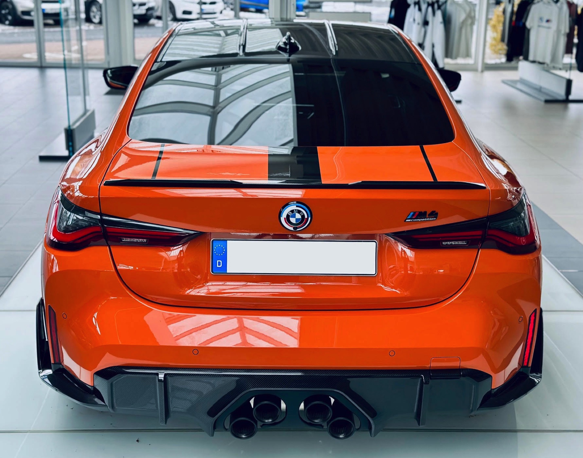 Understatement? Nein Danke! Dieser BMW M4 (G82) mit Individual-Lackierung in Feuerorange und M Performance Tuning-Parts liebt den lauten Auftritt und zeigt, wie extrem sich das Sportcoupé aus Garching gestalten lässt: Bei der im Kundenauftrag realisierten Konfiguration wurde wirklich an jede Option gedacht, die den M4 noch auffälliger machen kann – natürlich darf dabei auch die exklusive M Grafik in schwarzer Kontrastfarbe nicht fehlen, deren neuartige Lackiertechnik kürzlich mit dem Supplier Innovation Award ausgezeichnet wurde und die für 1.800 Euro Aufpreis bestellbar ist. Das aktuelle Beispiel aus dem Showroom der Autohaus Matthes Gruppe in Suhl zeigt, dass die neue Option gerade in Verbindung mit einer extrovertierten Farbe wie Feuerorange das Zeug zum absoluten Hingucker hat.