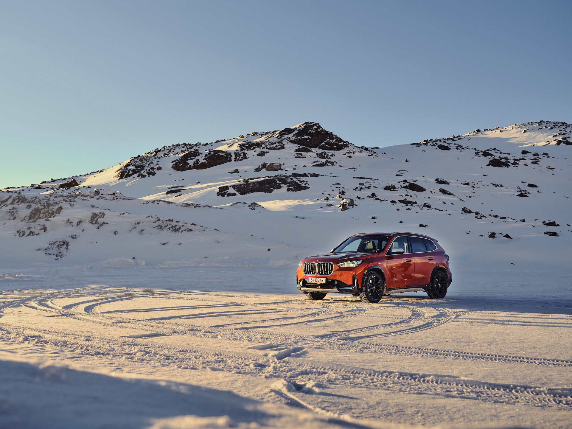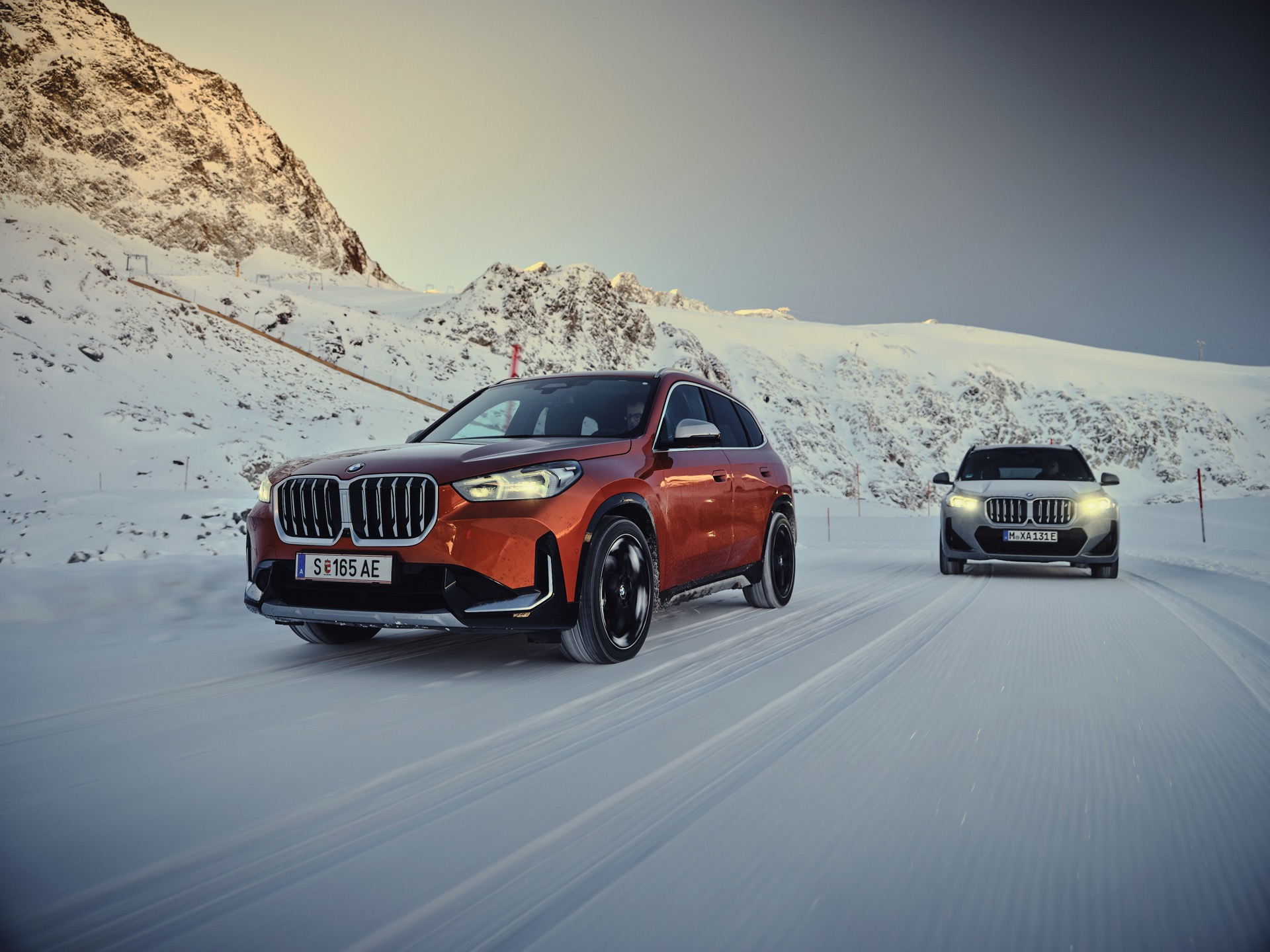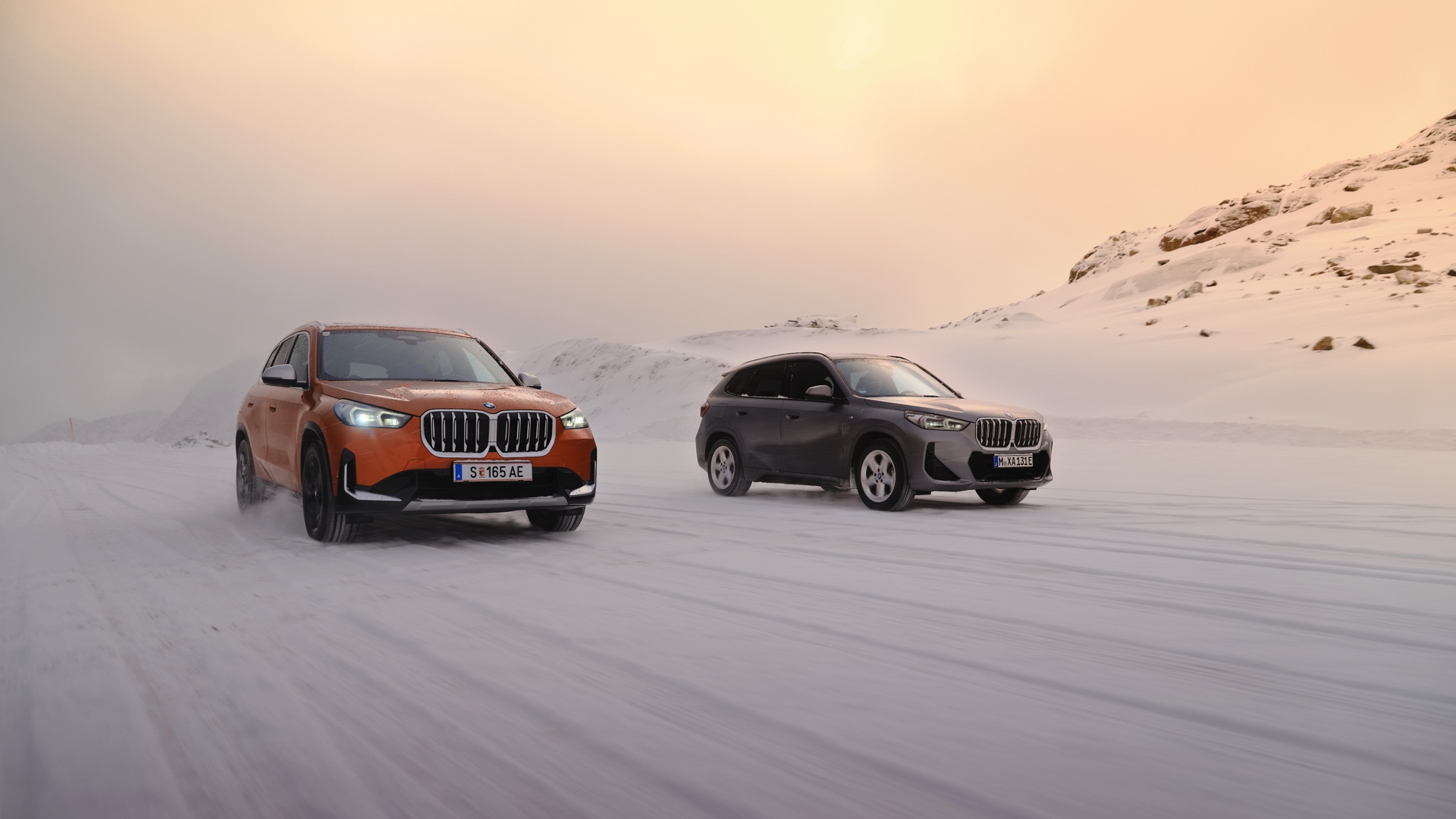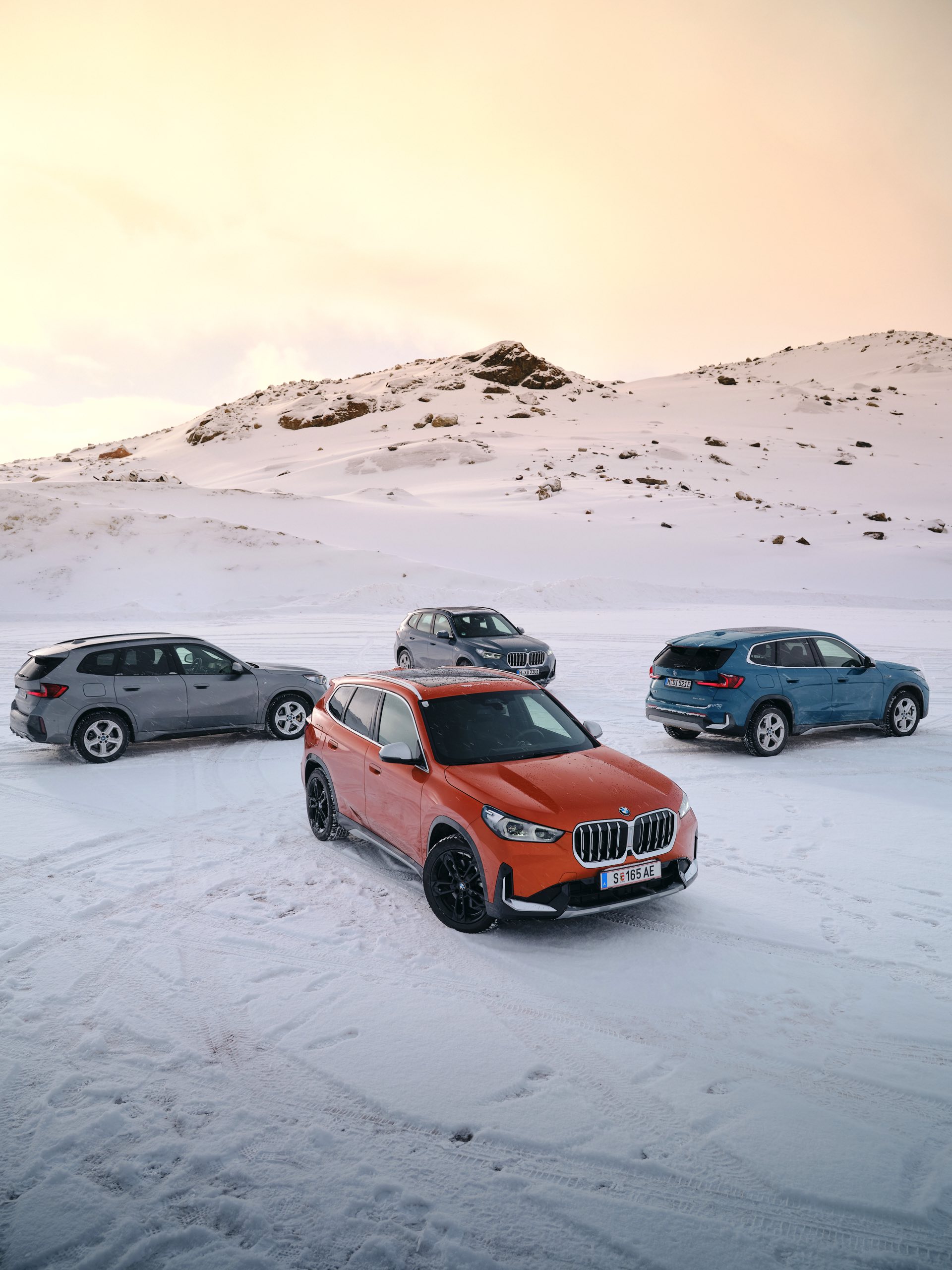 Aus der Gruppe heraus sticht ein BMW X1 xDrive23d in Utah Orange, schließlich liefert die markante Farbe einen spannenden Kontrast zum verschneiten Hintergrund. Der 211 PS und 400 Newtonmeter starke Diesel-X1 mit xLine darf sich im Schnee richtig austoben und zeigt dabei, dass er mit winterlichen Straßenverhältnissen keine Probleme hat. Extrem frostig tritt der  BMW iX1 in Frozen Pure Grey auf, schließlich befindet sich hier sogar noch eine dünne Reif-Schicht auf dem ohnehin “gefrorenen” Frozen-Lack und macht die Kälte förmlich greifbar. "