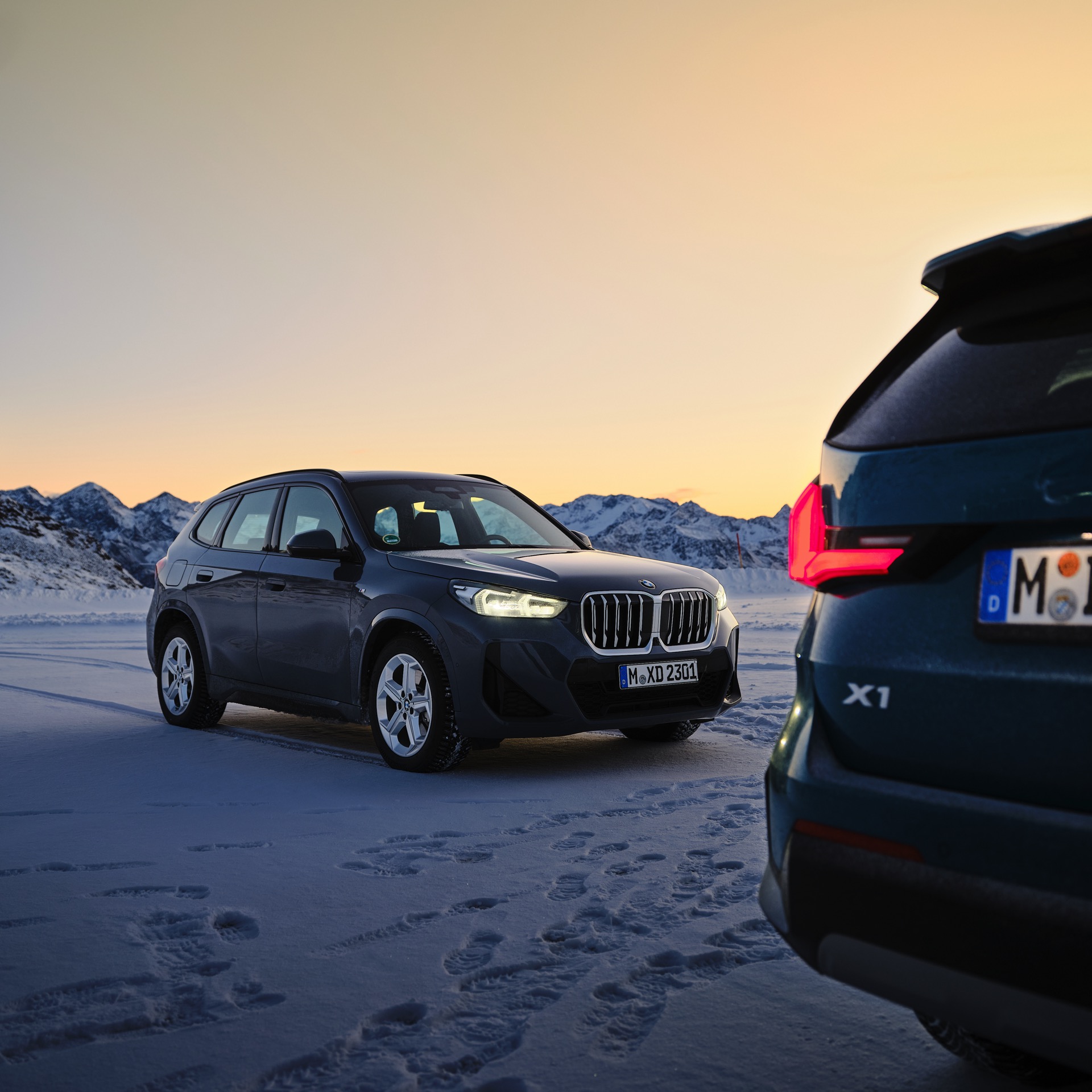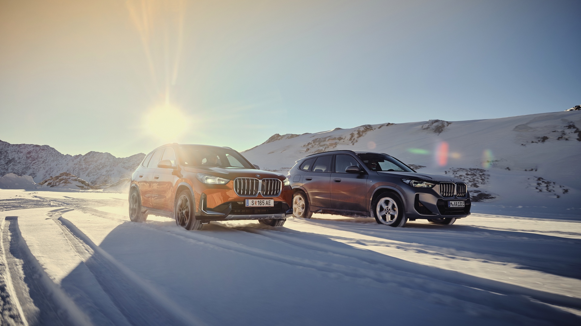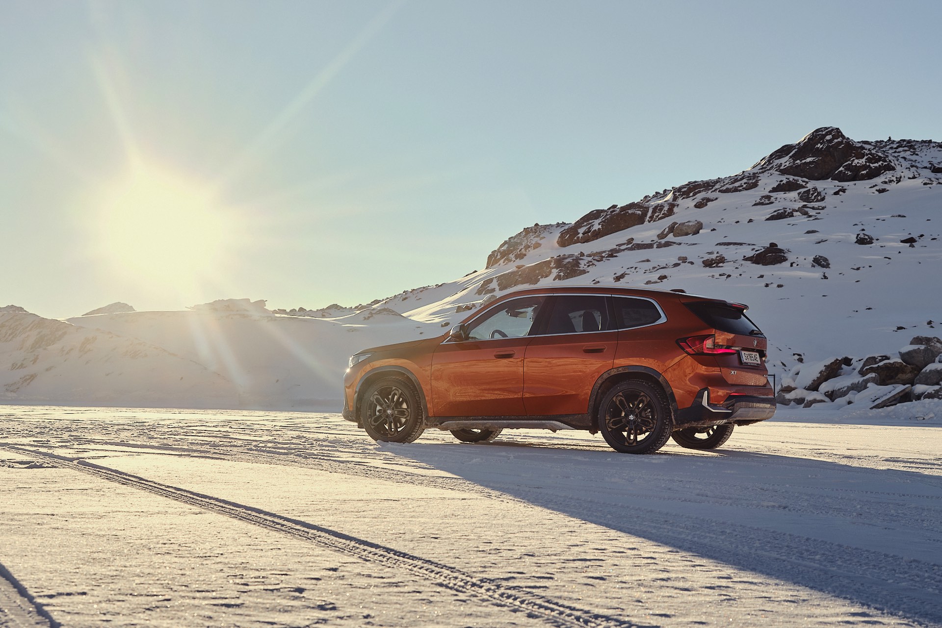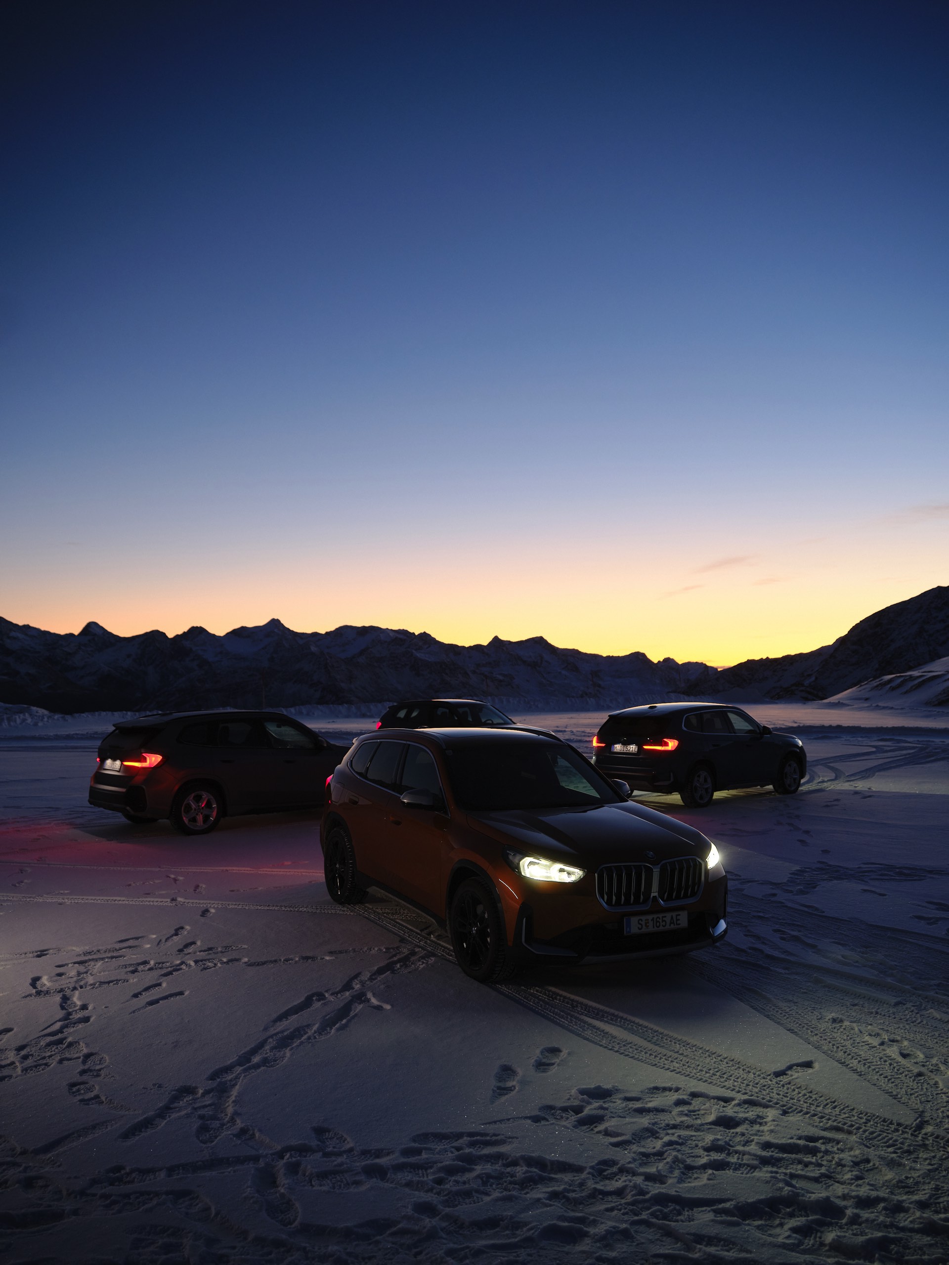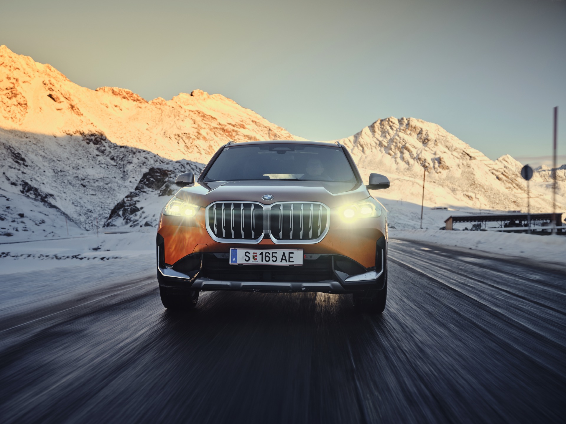 Aus der Gruppe heraus sticht ein BMW X1 xDrive23d in Utah Orange, schließlich liefert die markante Farbe einen spannenden Kontrast zum verschneiten Hintergrund. Der 211 PS und 400 Newtonmeter starke Diesel-X1 mit xLine darf sich im Schnee richtig austoben und zeigt dabei, dass er mit winterlichen Straßenverhältnissen keine Probleme hat. Extrem frostig tritt der  BMW iX1 in Frozen Pure Grey auf, schließlich befindet sich hier sogar noch eine dünne Reif-Schicht auf dem ohnehin “gefrorenen” Frozen-Lack und macht die Kälte förmlich greifbar. "